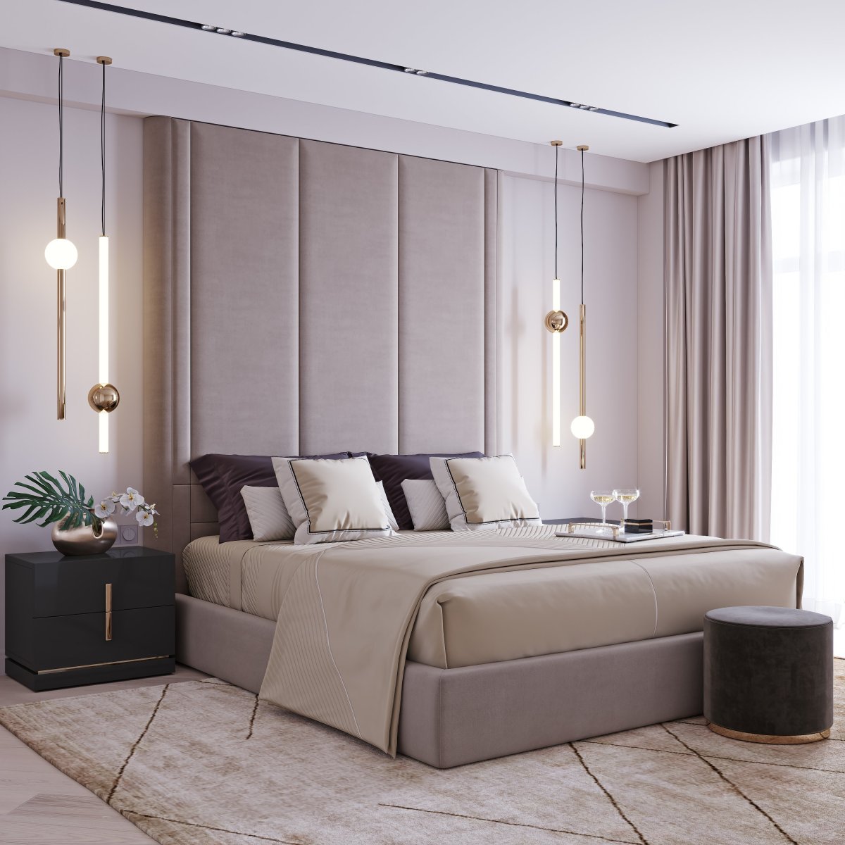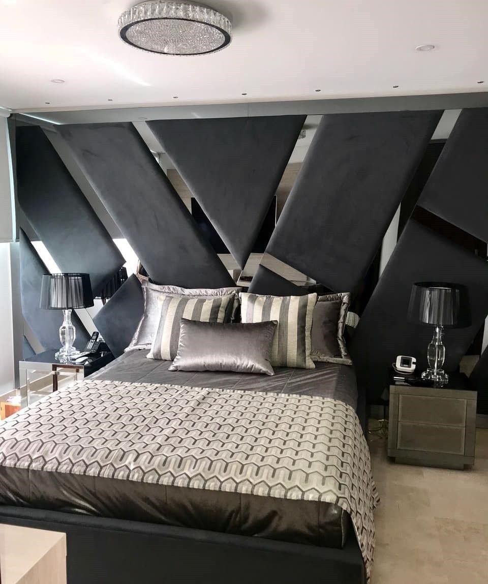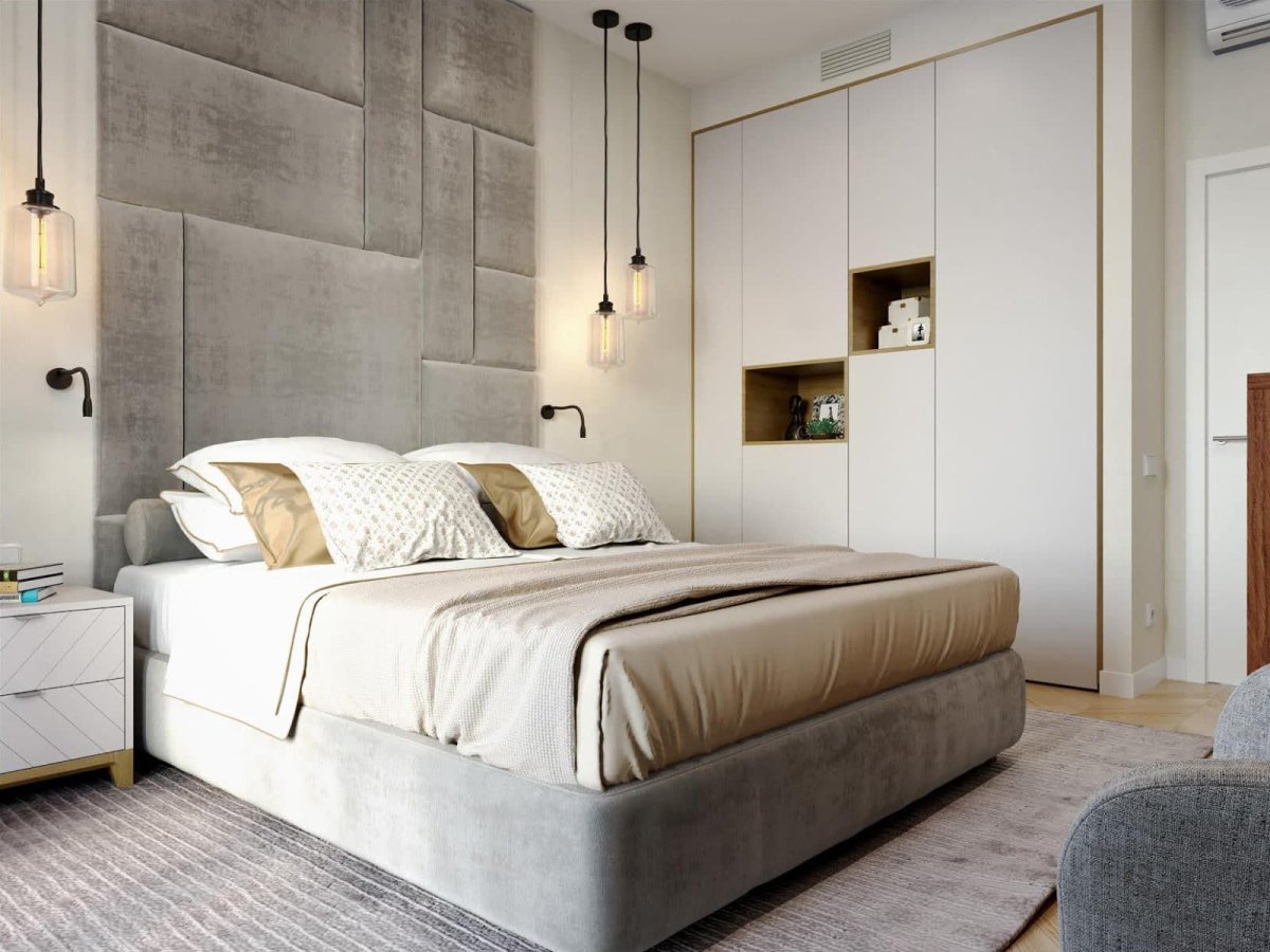 Спальня с мягкими стеновыми панелями