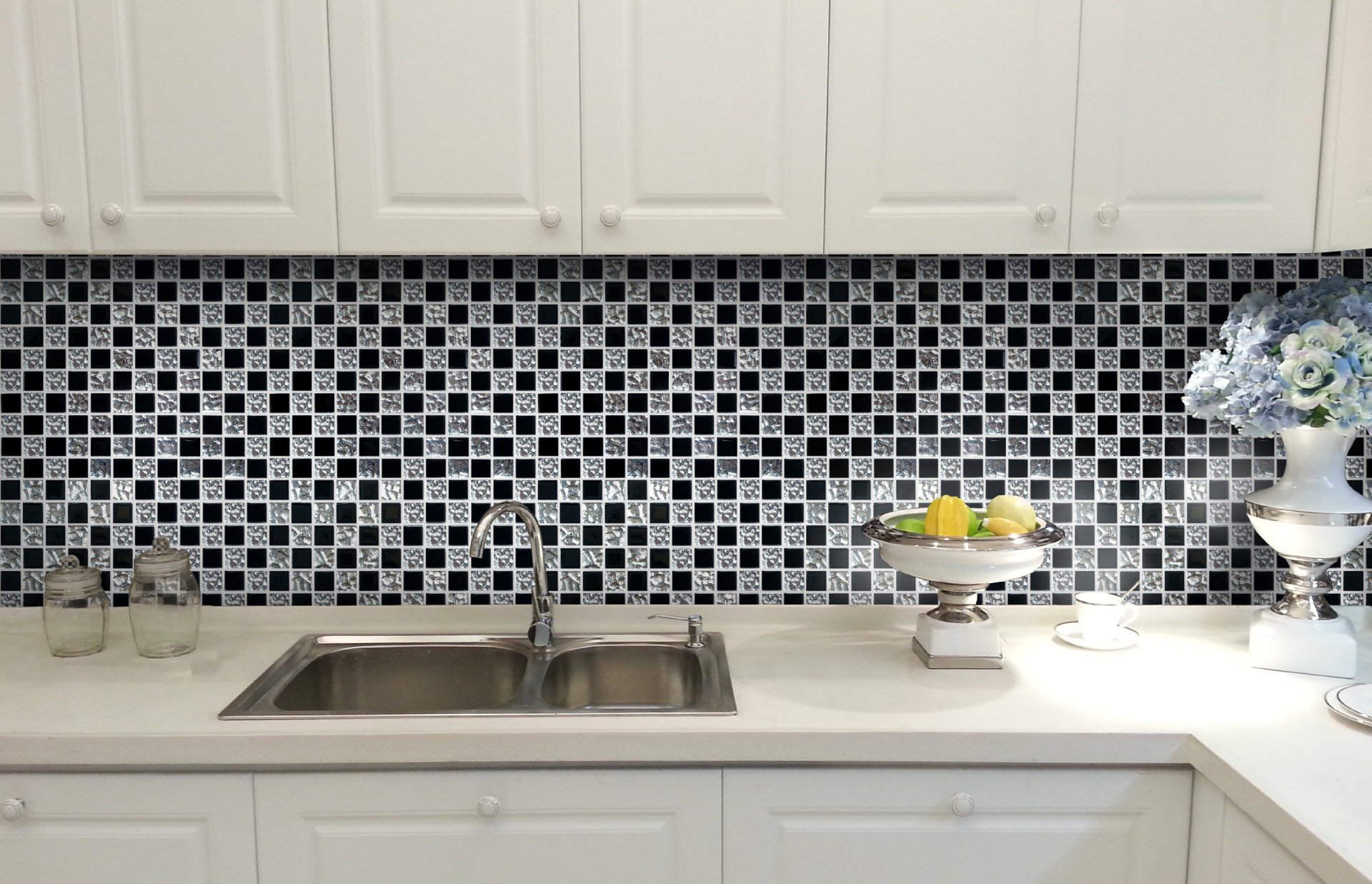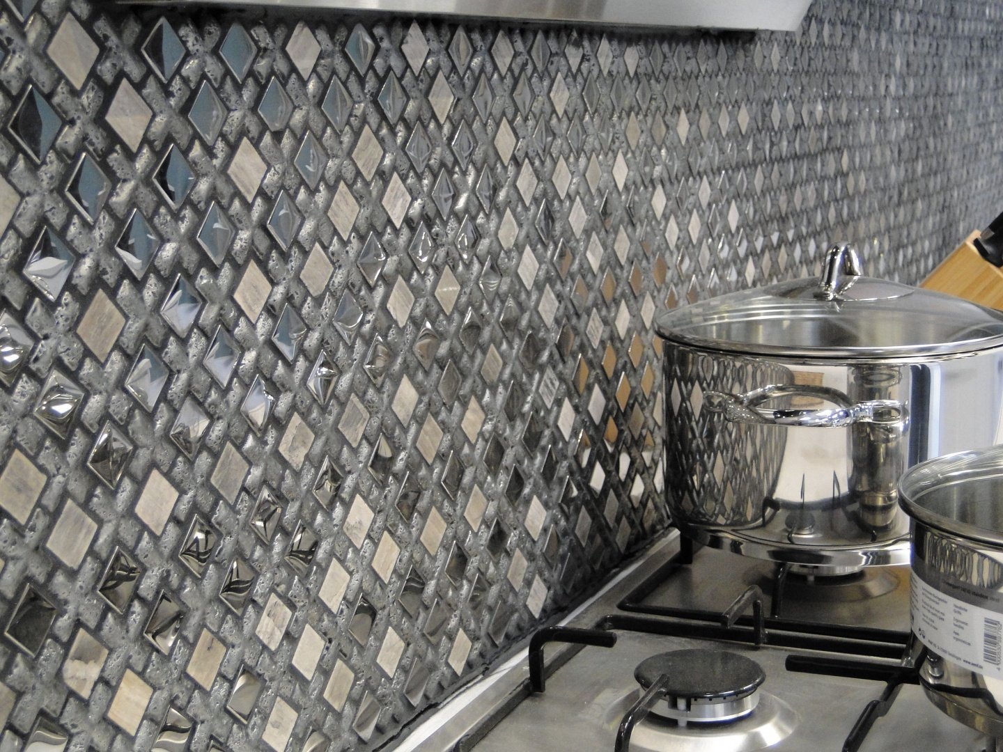 Серебряная мозаика на кухне фартук