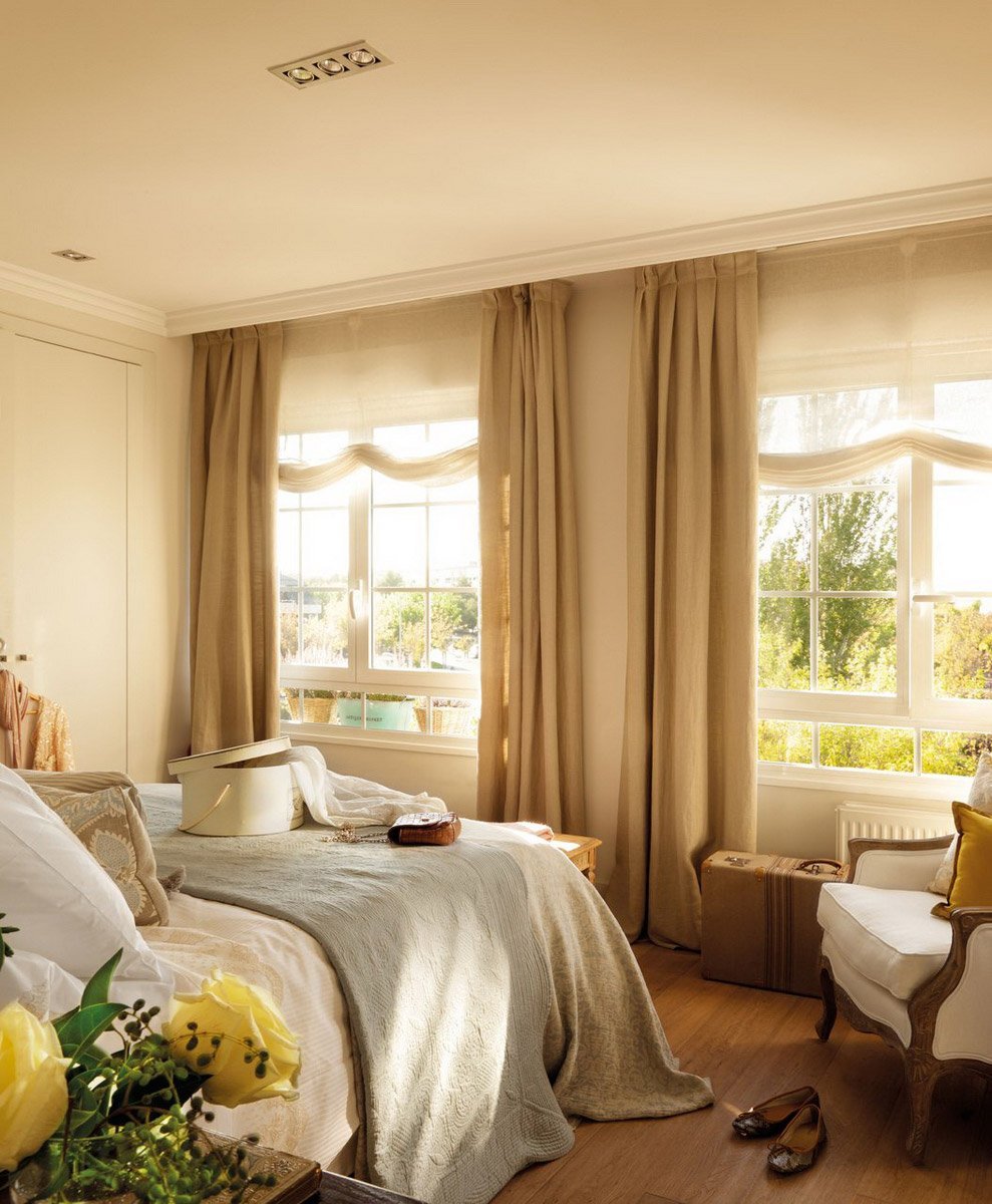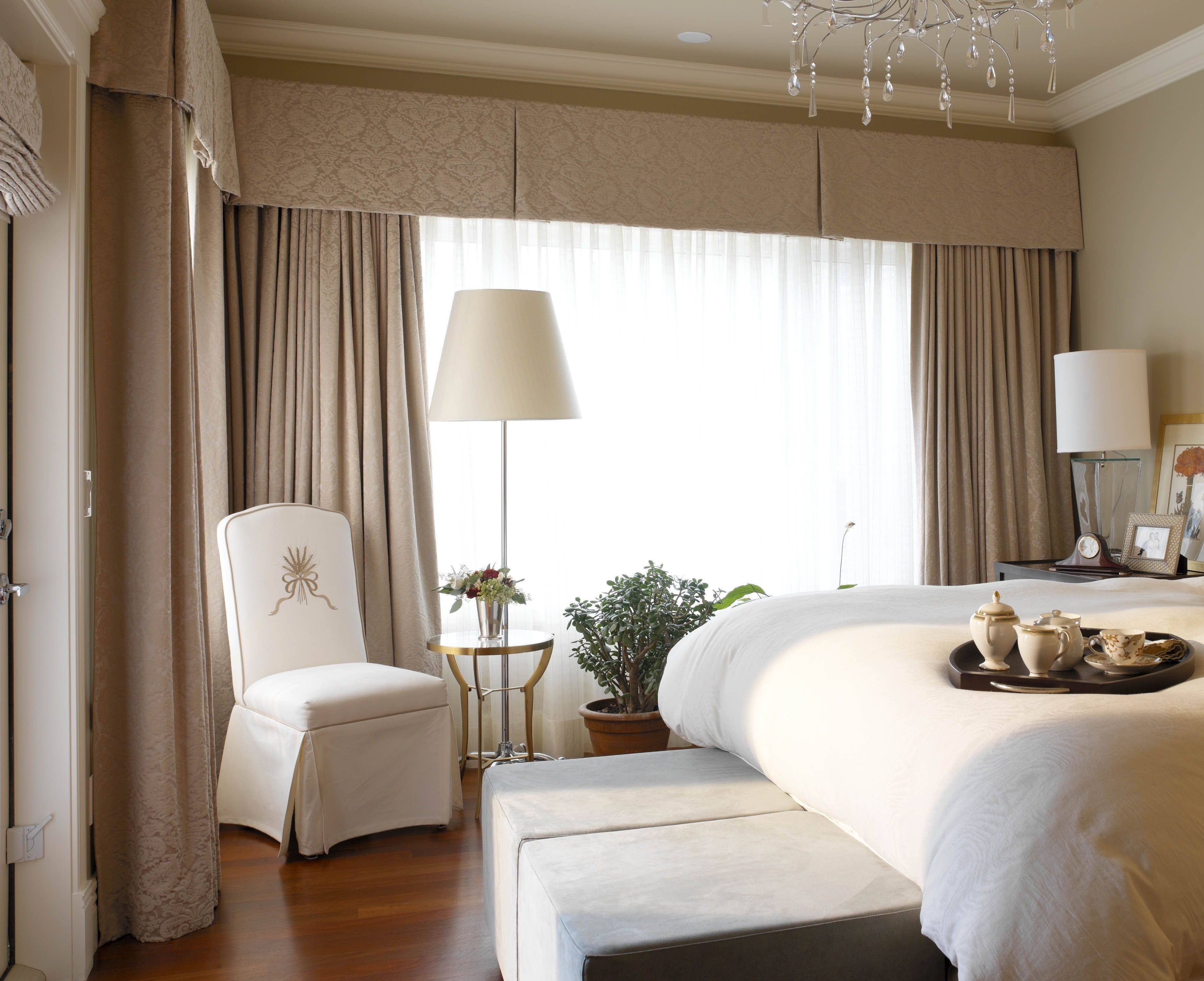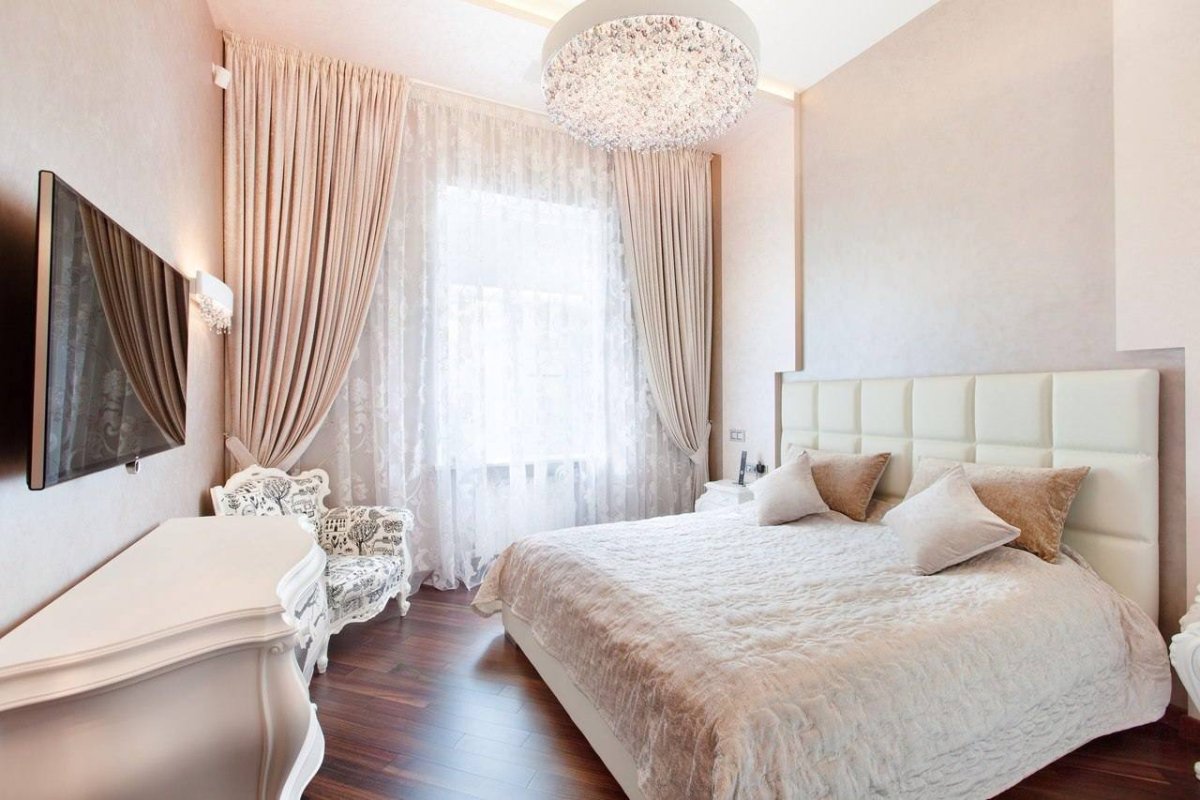 Шторы для бежевой спальни с белой мебелью