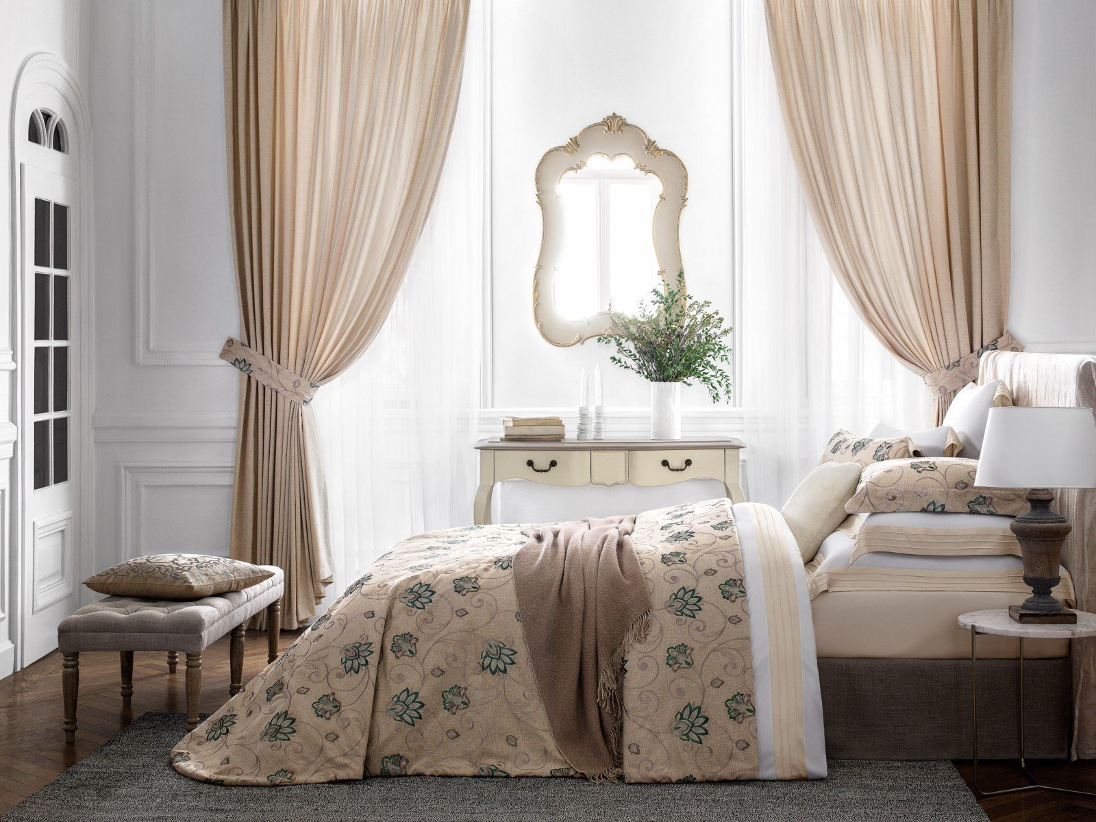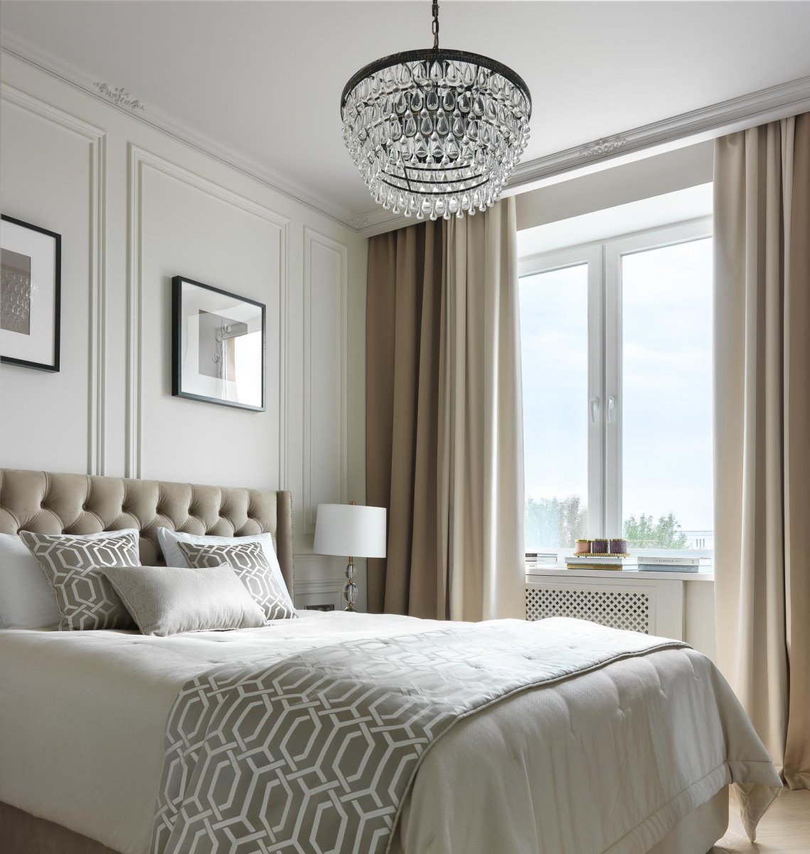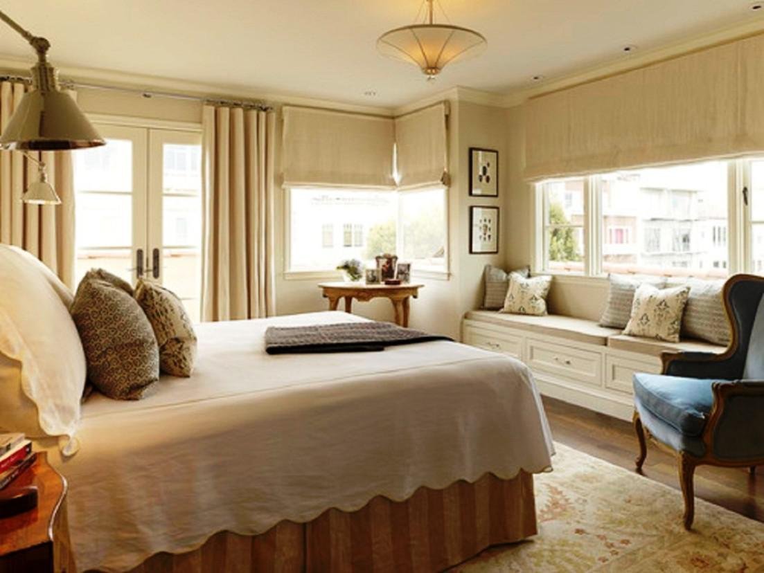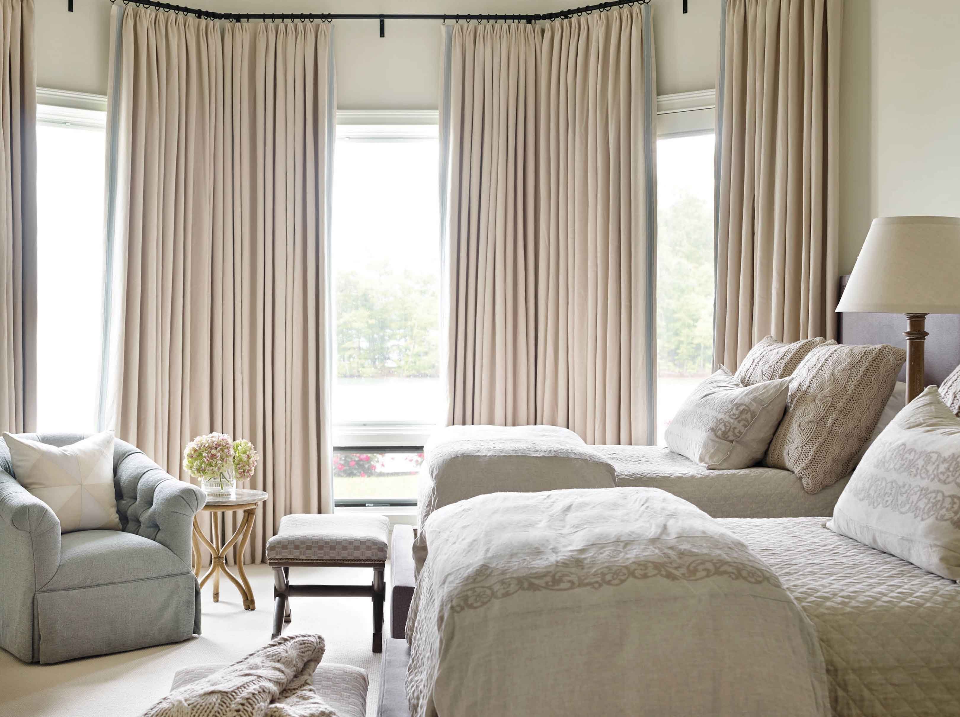 Шторы для бежевой спальни с белой мебелью