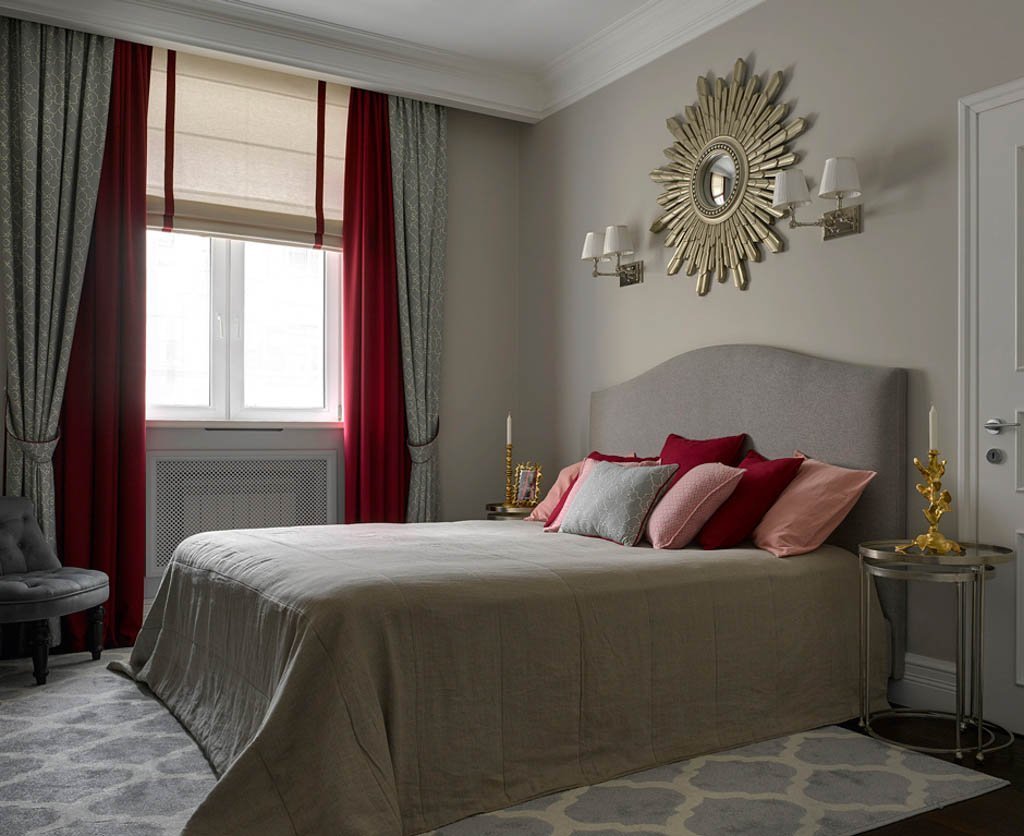 Спальня в серо красных тонах
