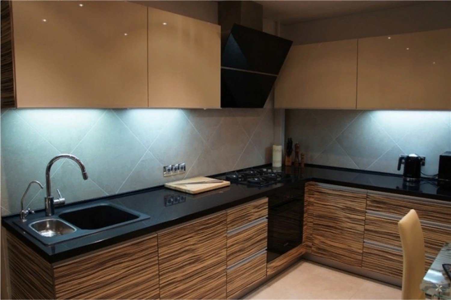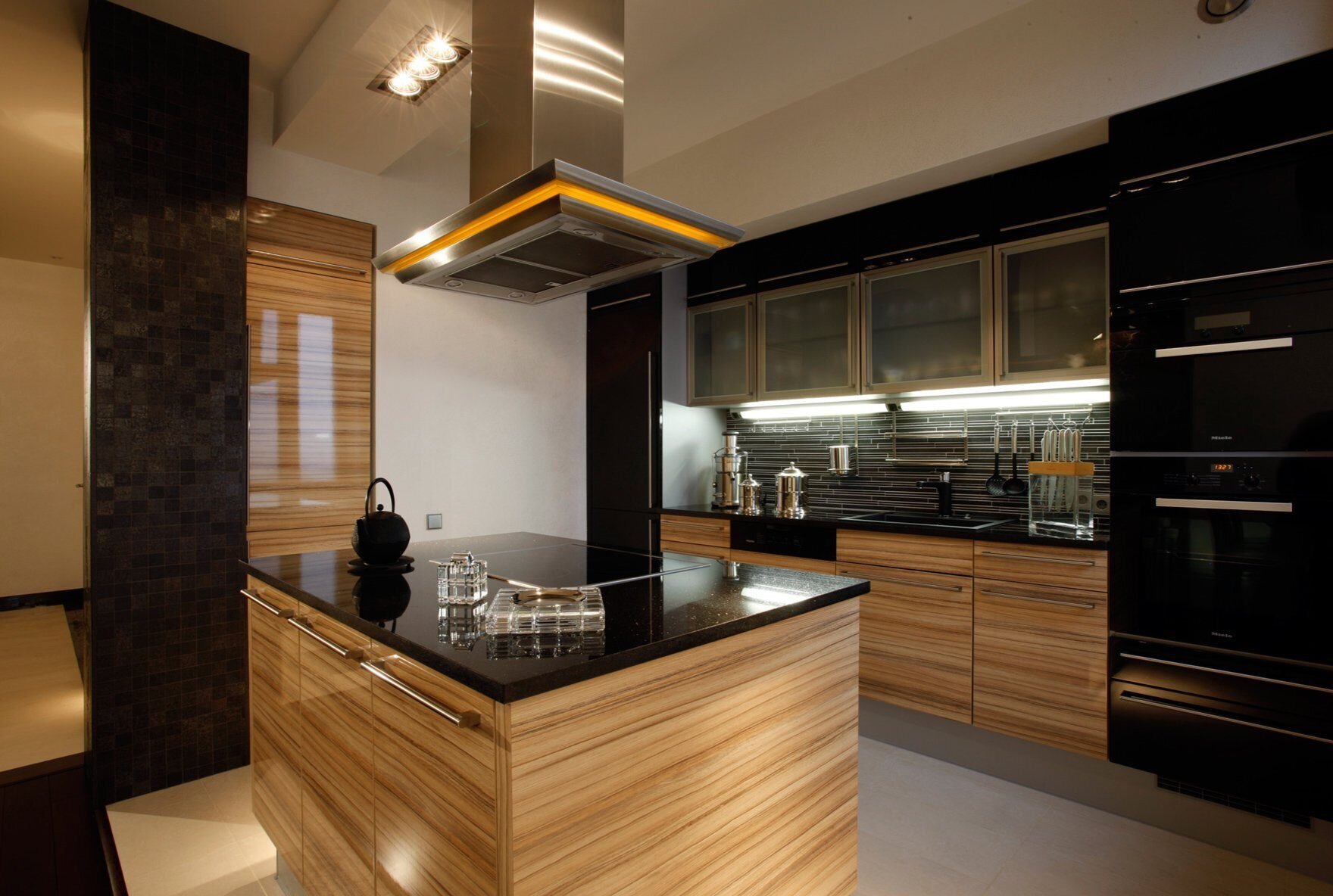 Кухня зебрано с черной столешницей