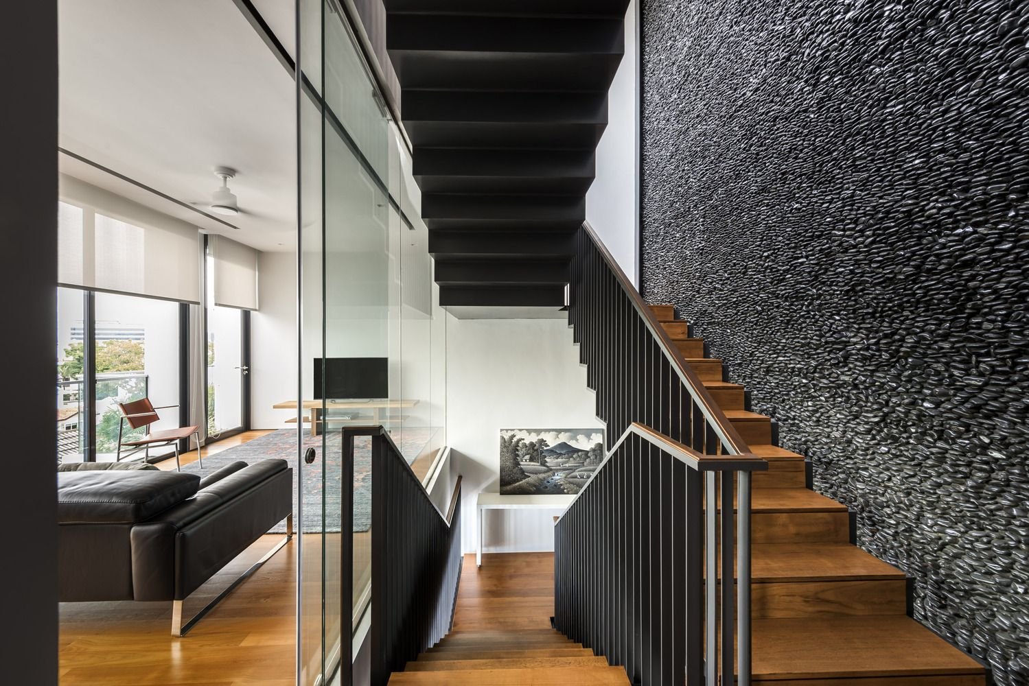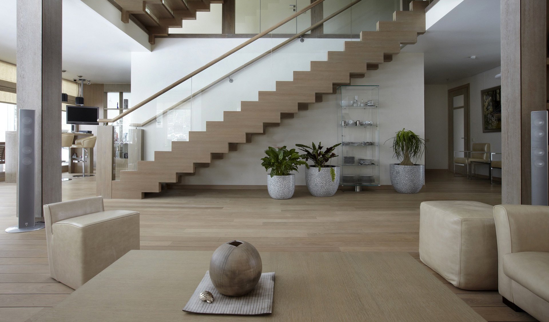 Гостиная в современном стиле с лестницей