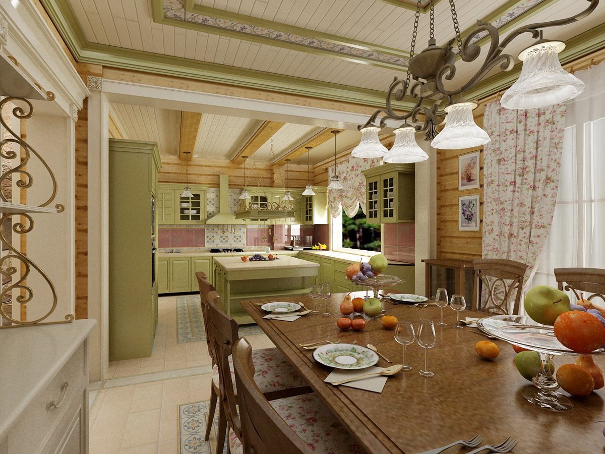 Кухня-гостиная Прованс в деревянном доме