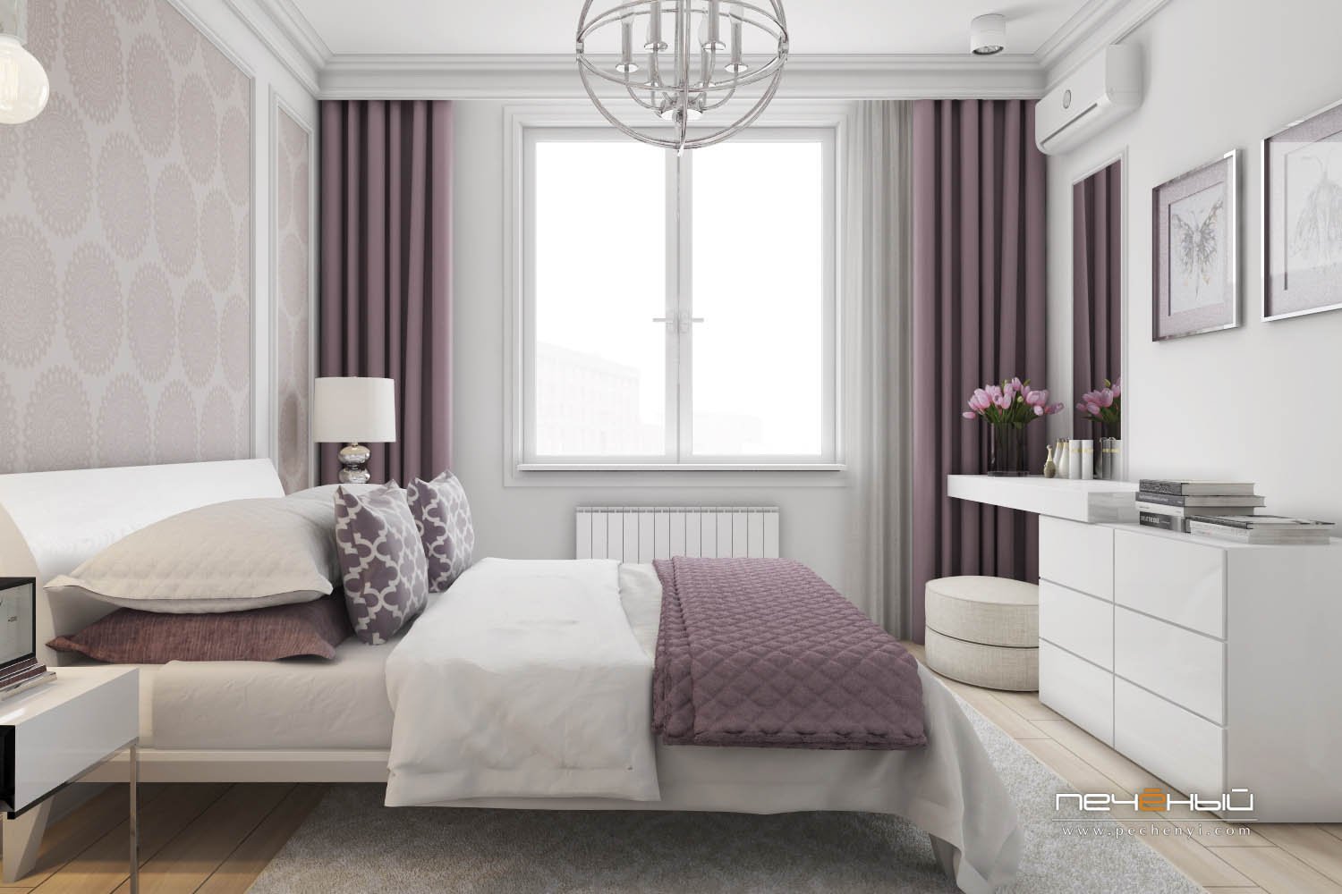 Узкая спальня в светлых тонах