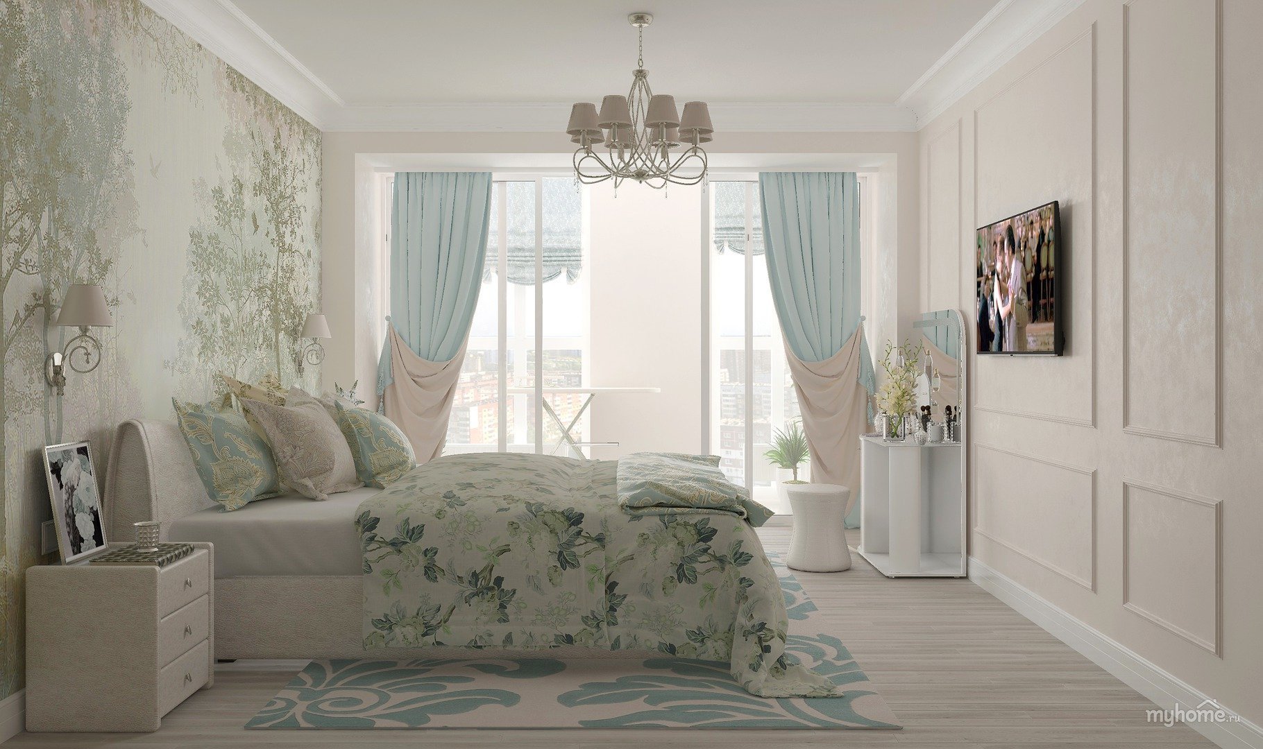 Бело зеленая спальня