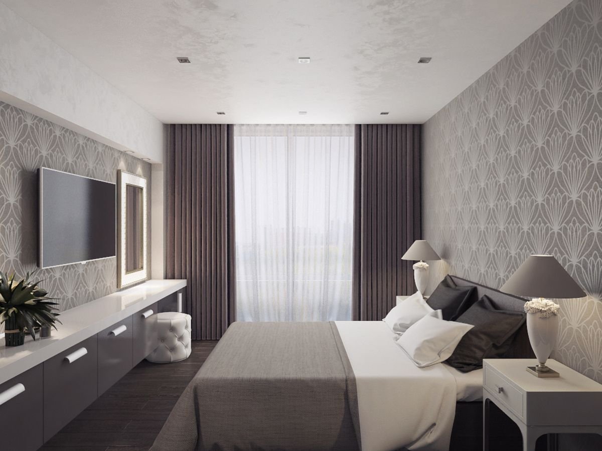 Серые обои в интерьере спальни