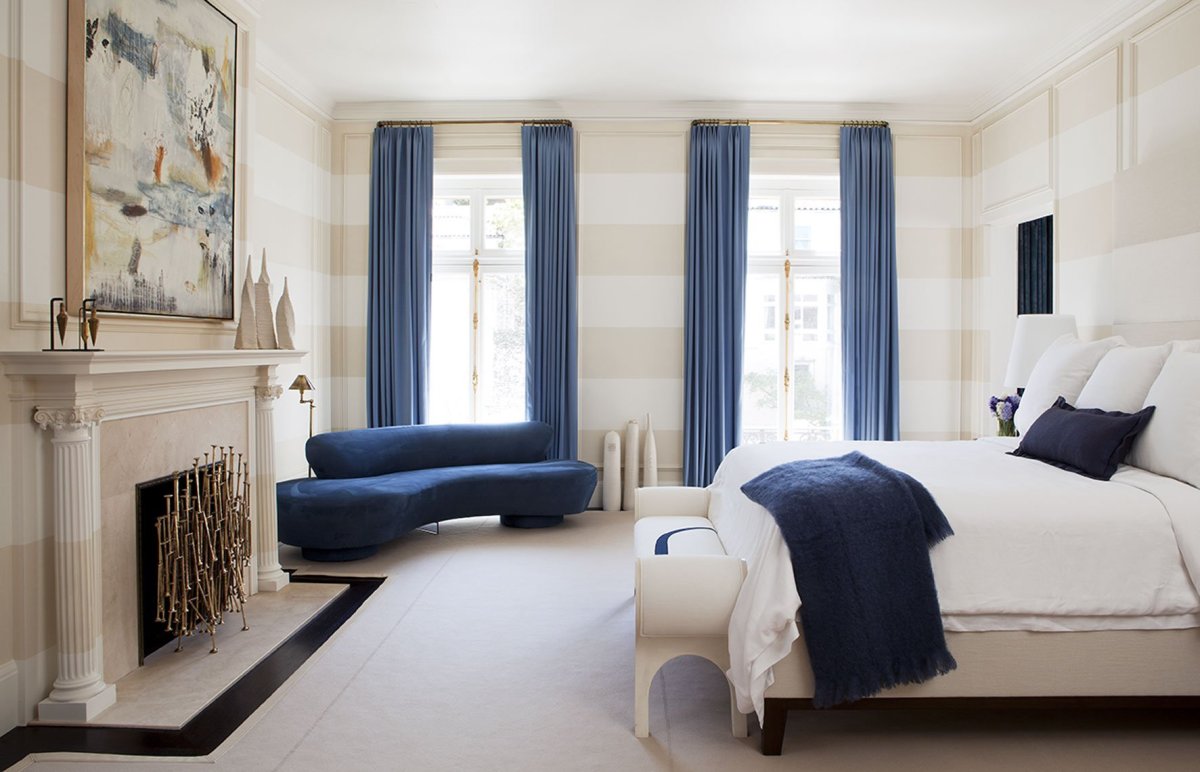 Синие шторы в спальне
