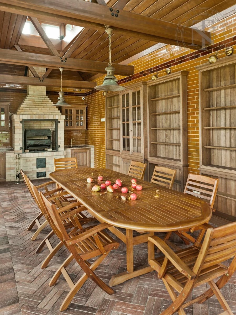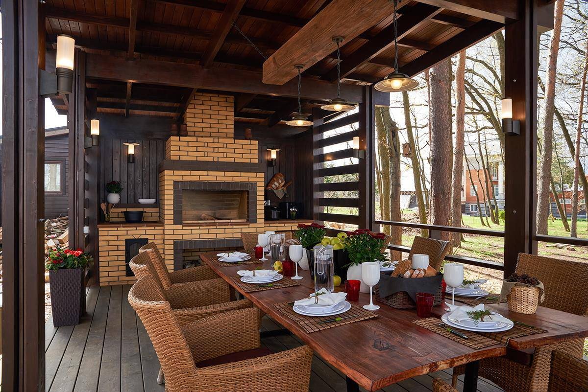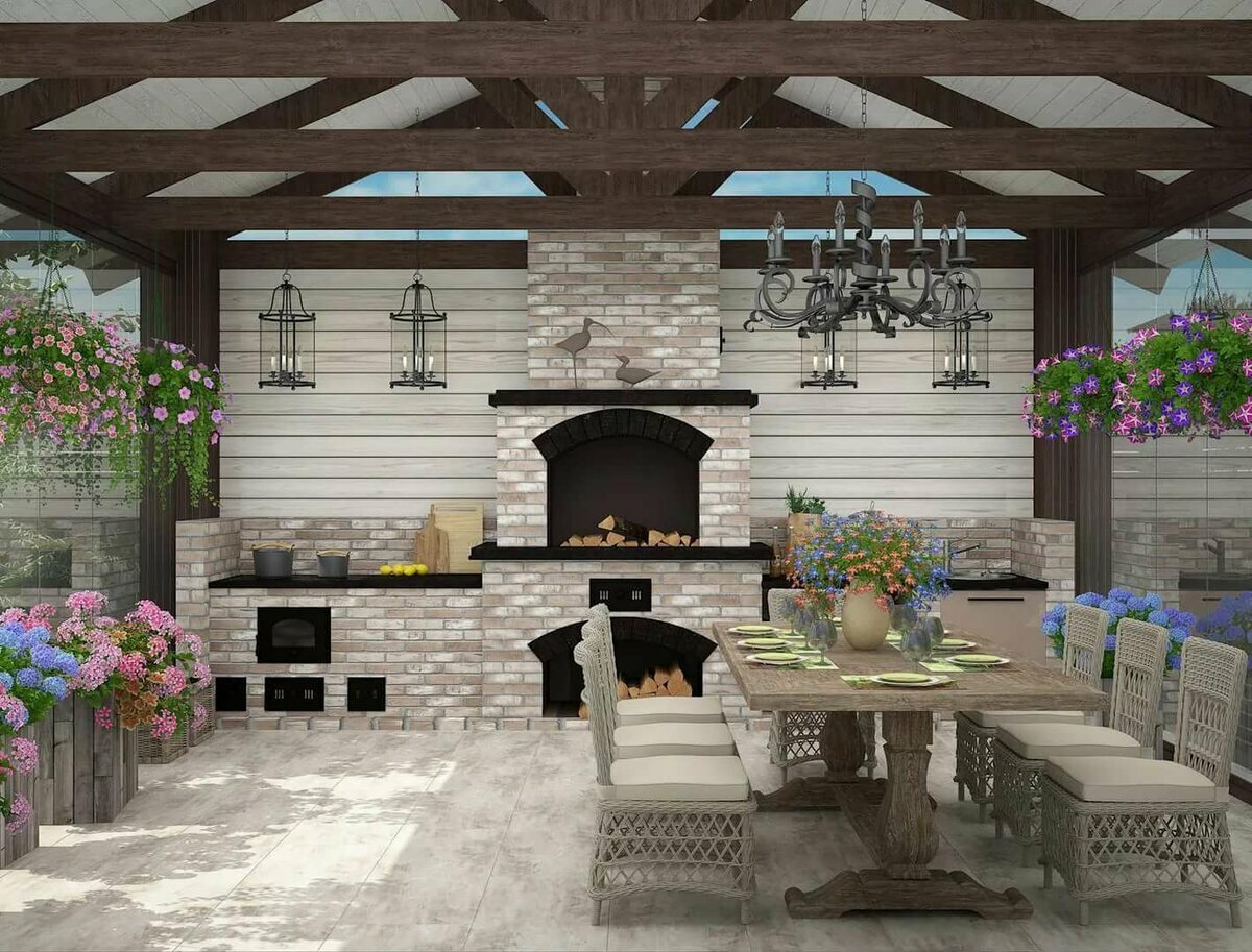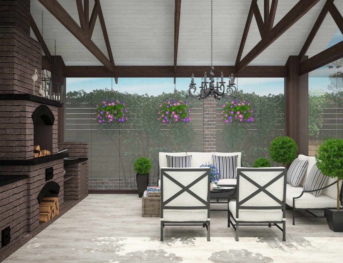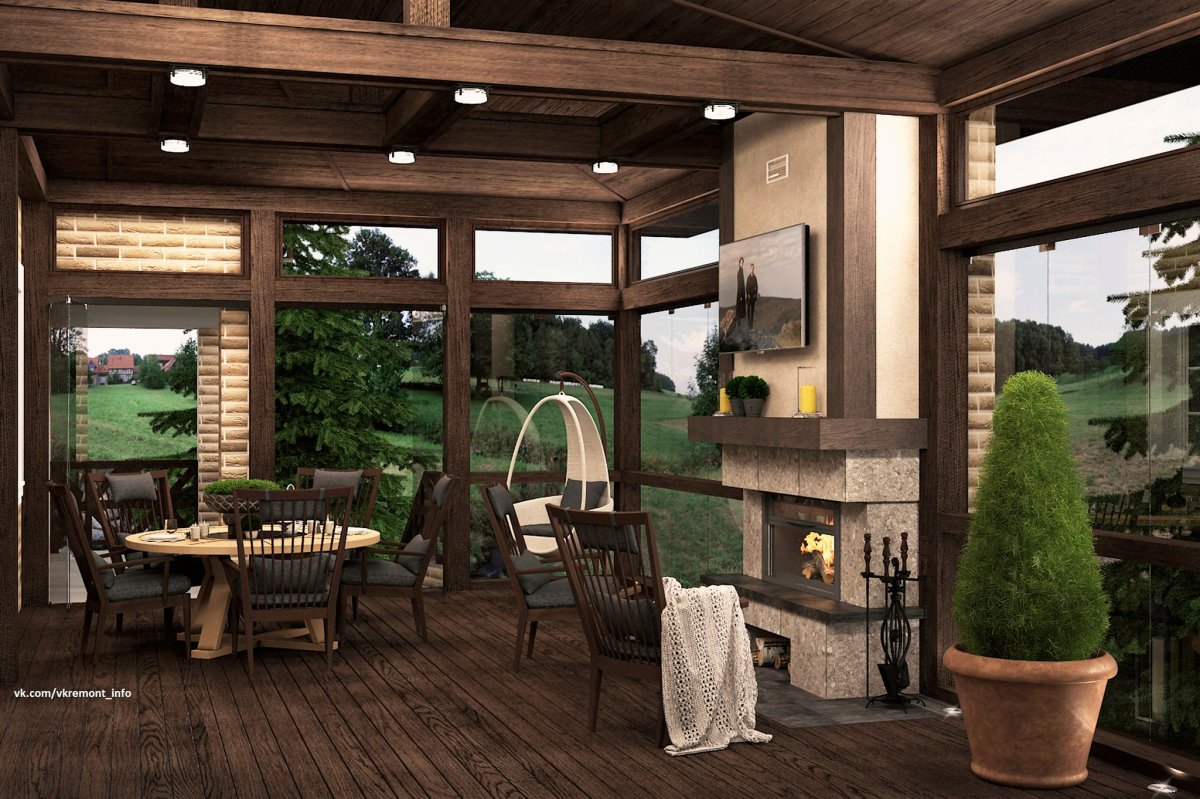 Веранда с мангальной зоной пристроенная к дому застекленная