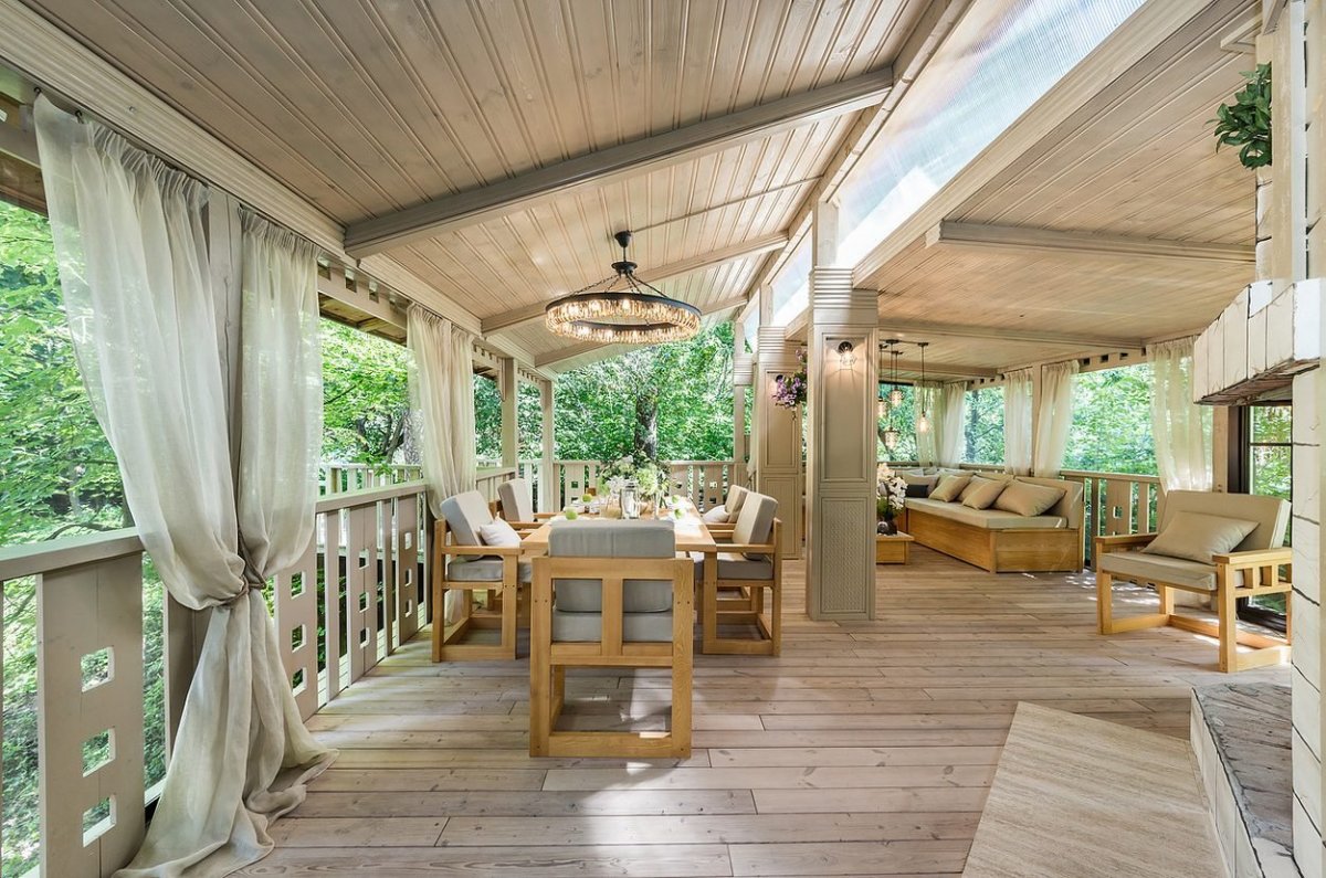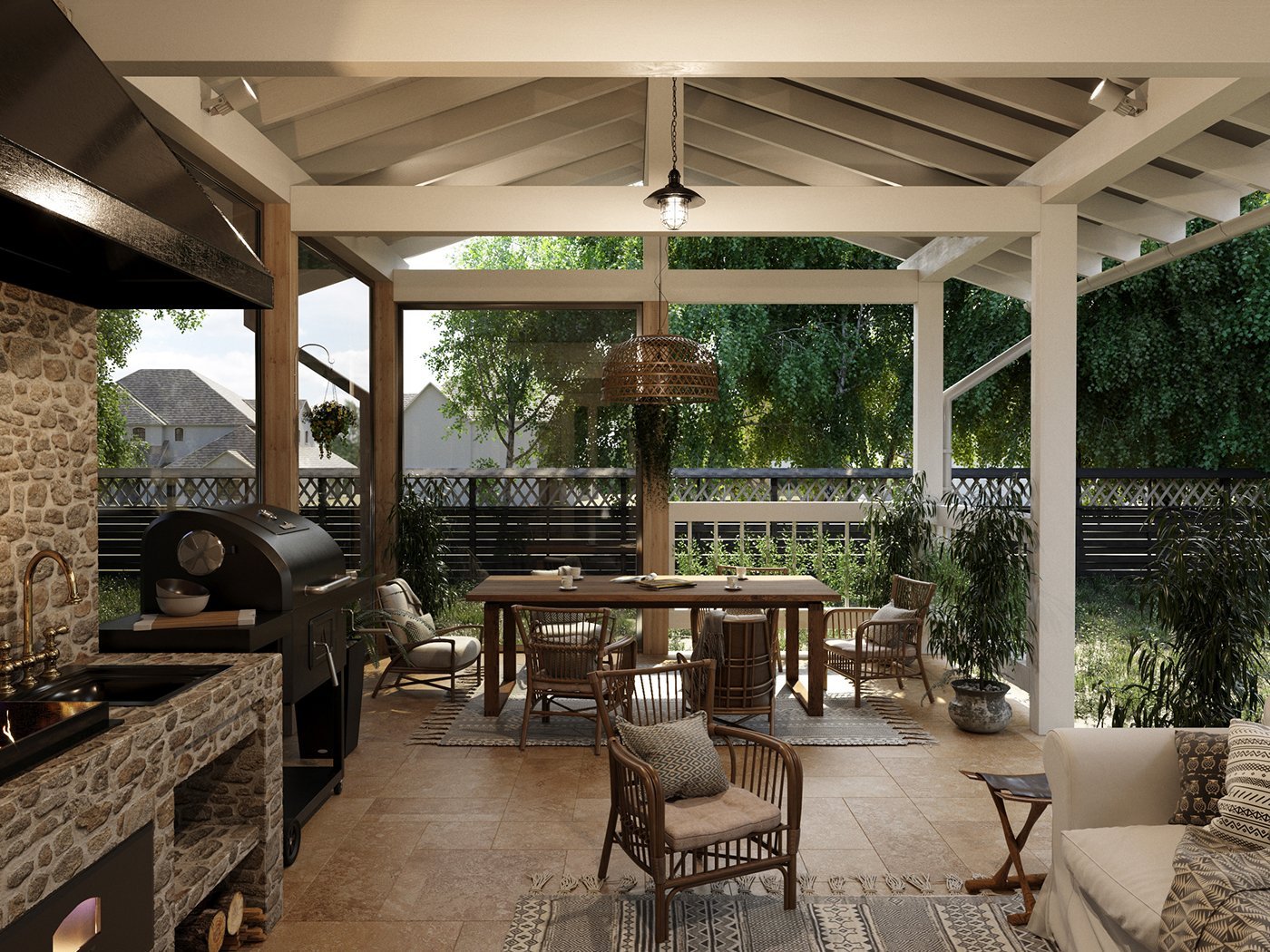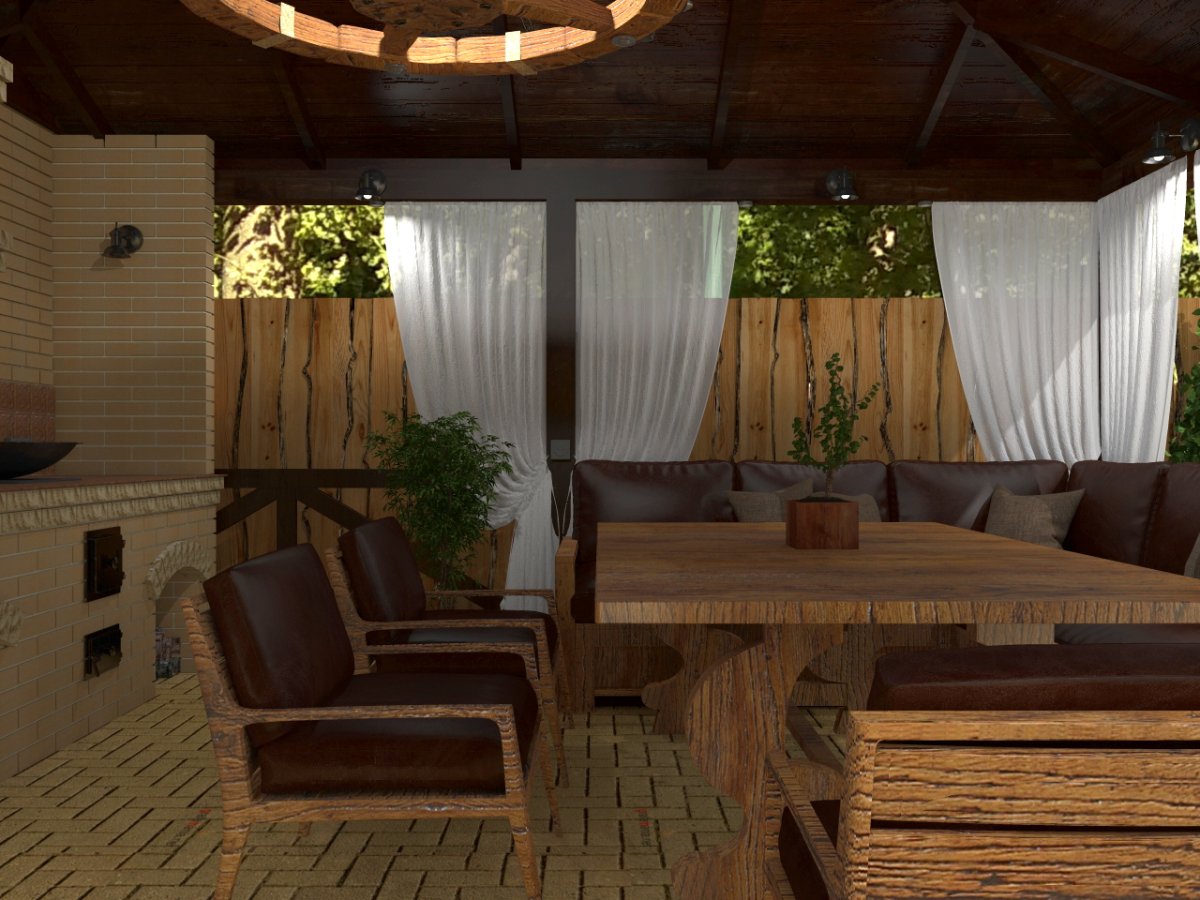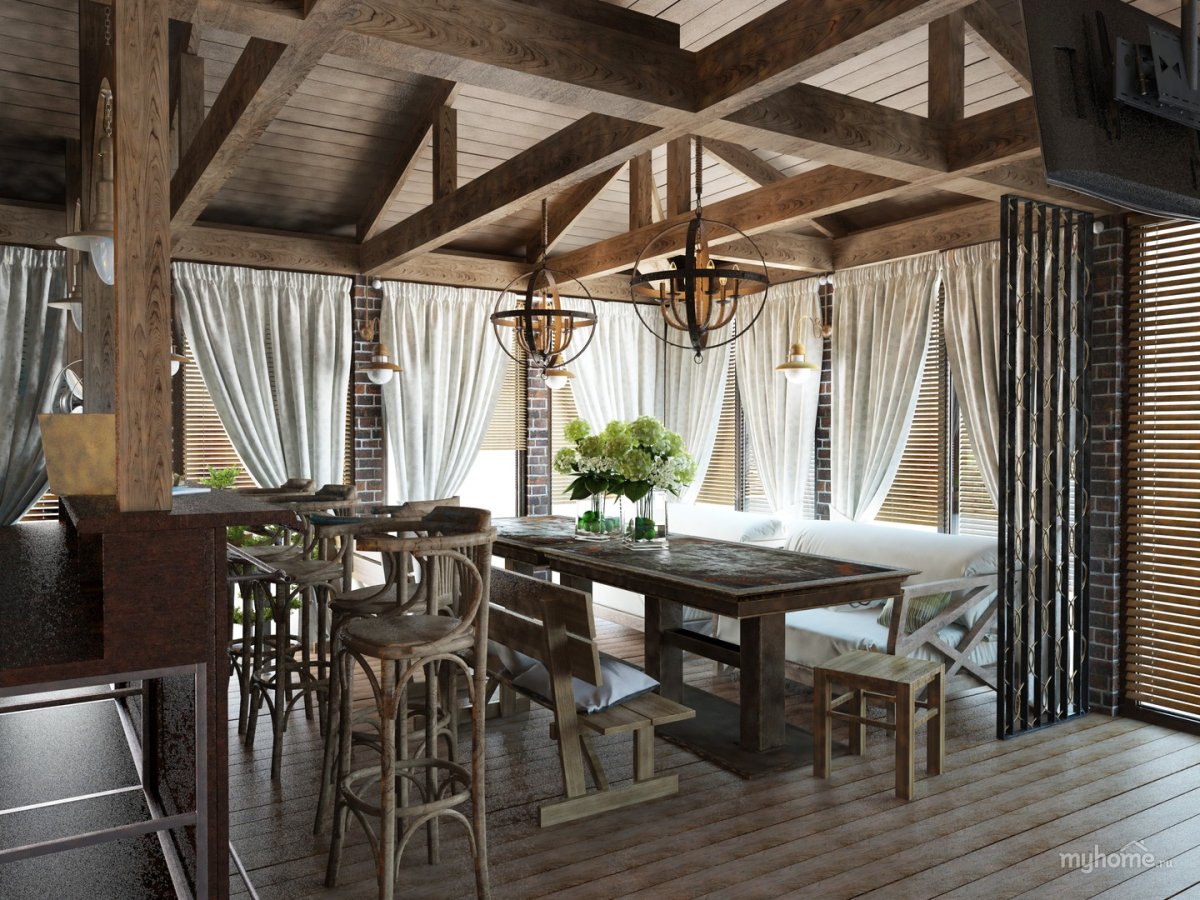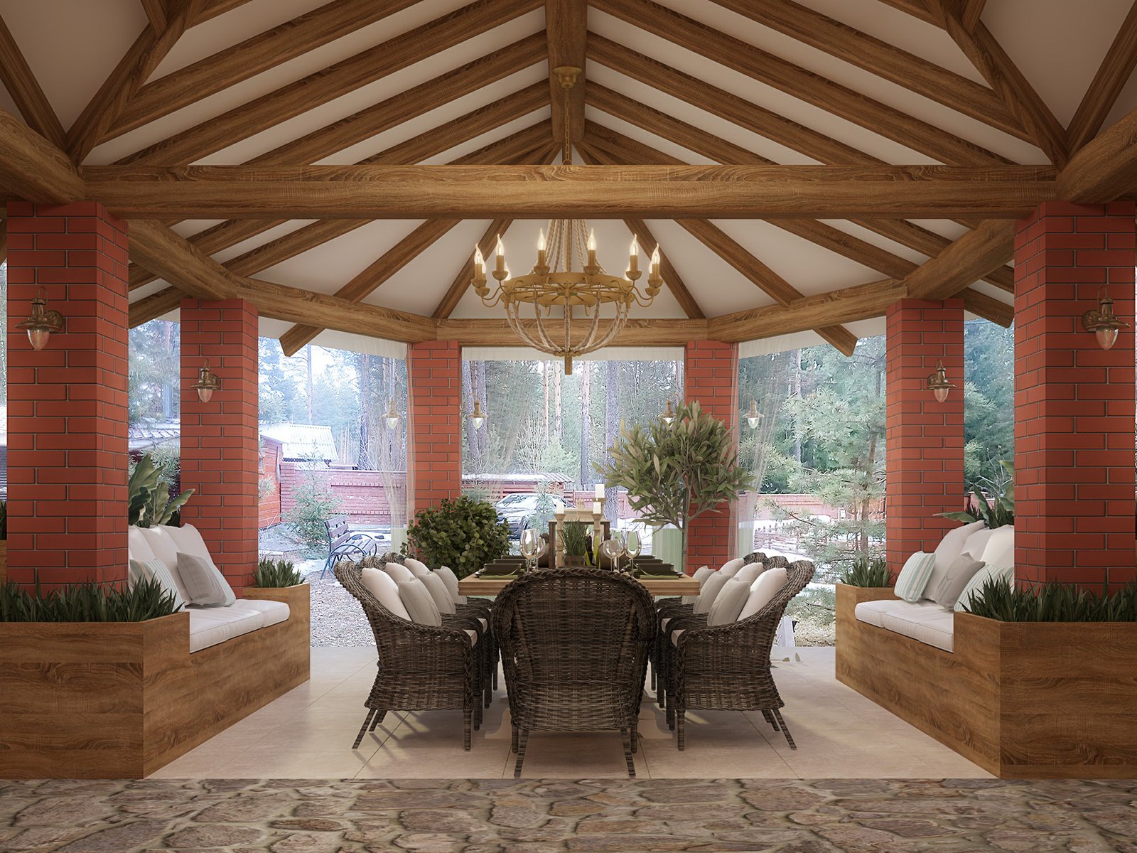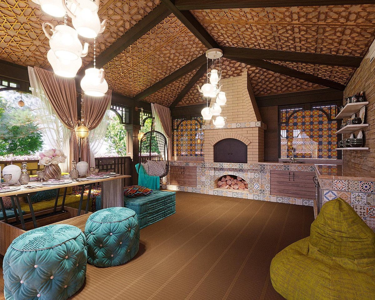 Веранда с мангальной зоной пристроенная к дому застекленная
