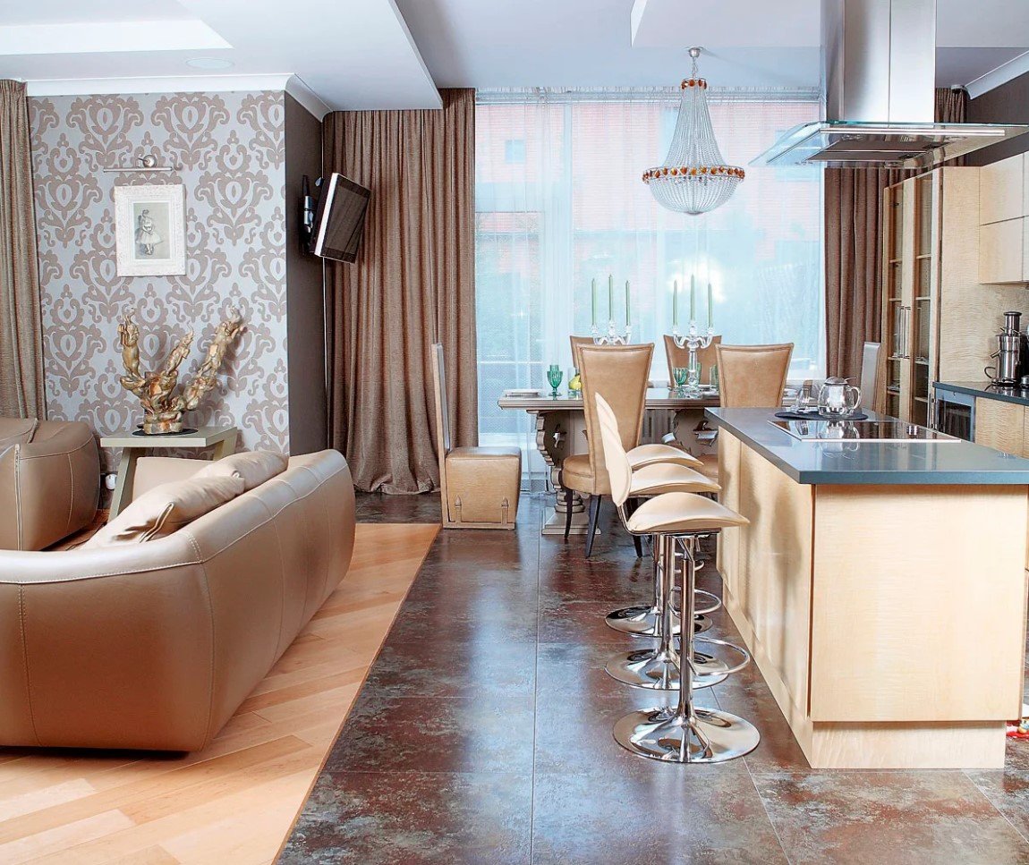 Кухня-гостиная зонирование полом