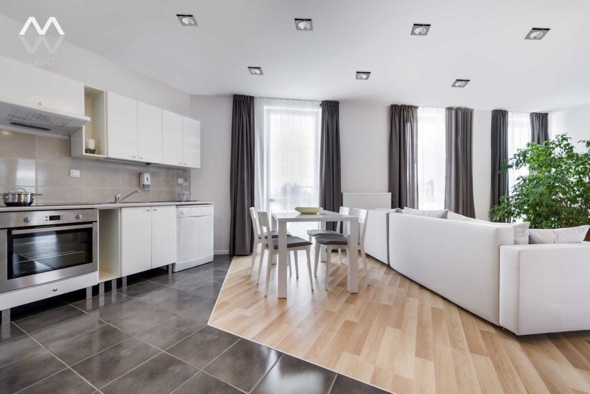 Зонирование кухни и гостиной плиткой и ламинатом