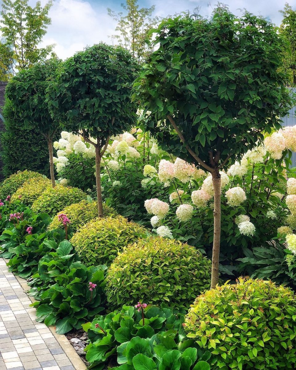 Роза на штамбе и гортензия в ландшафтном