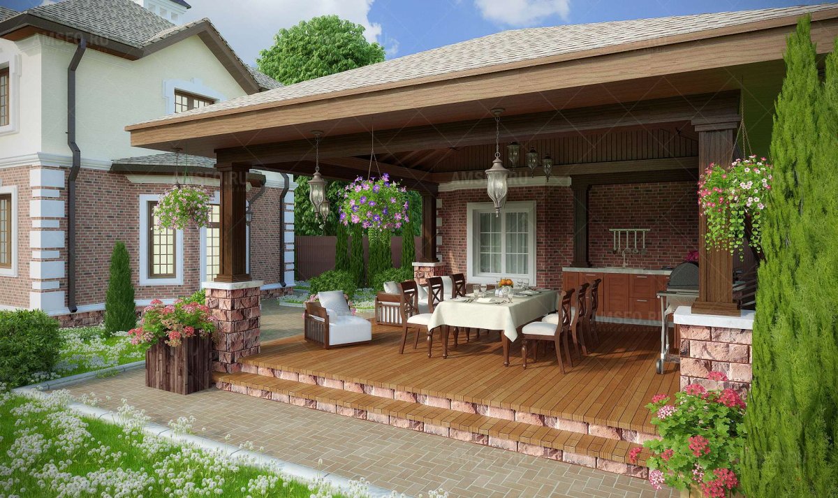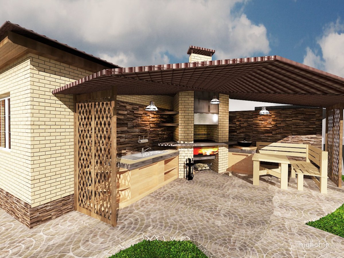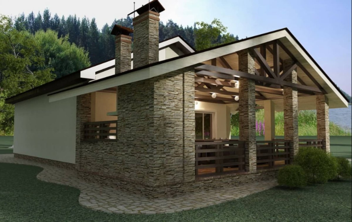 Баня с беседкой и барбекю под односкатной крышей проекты