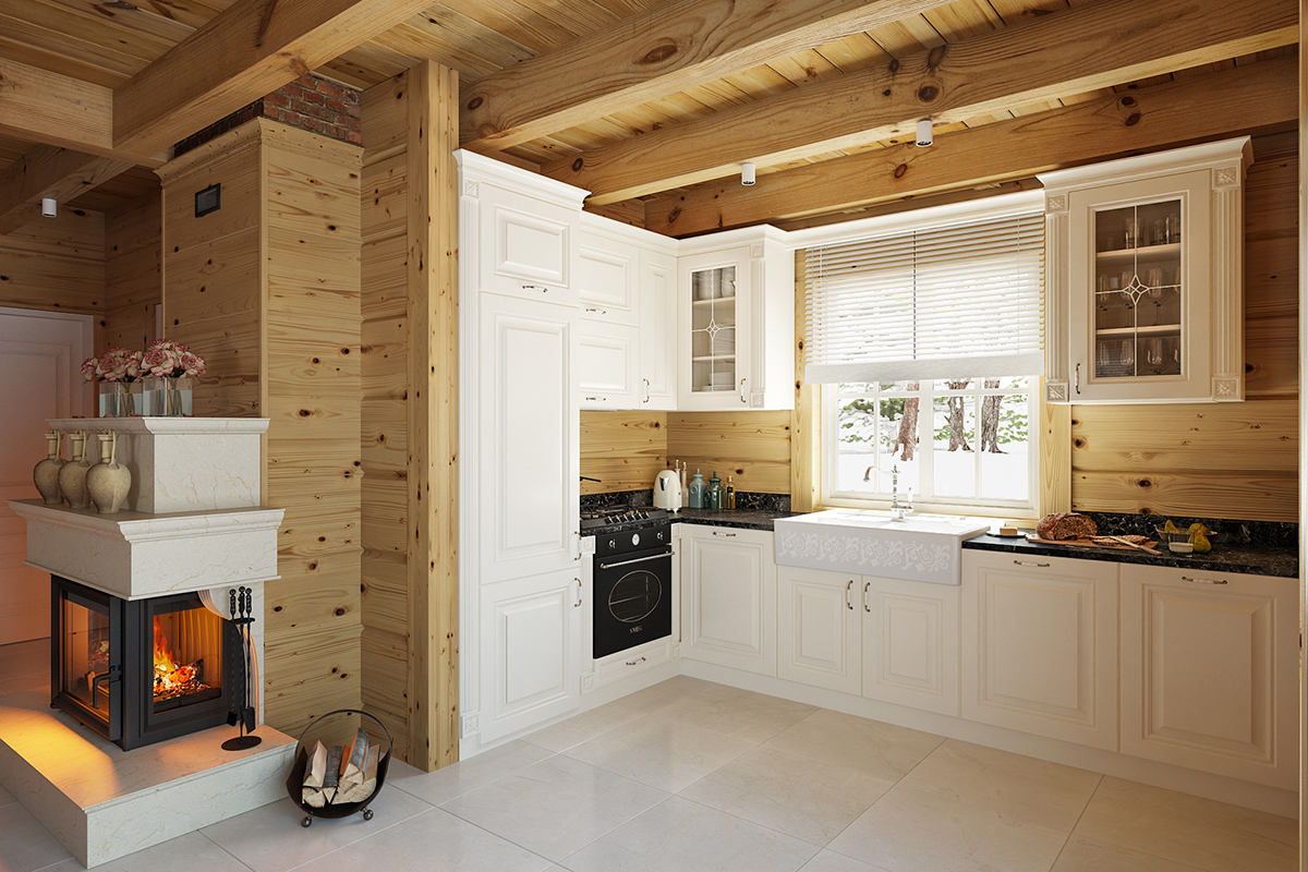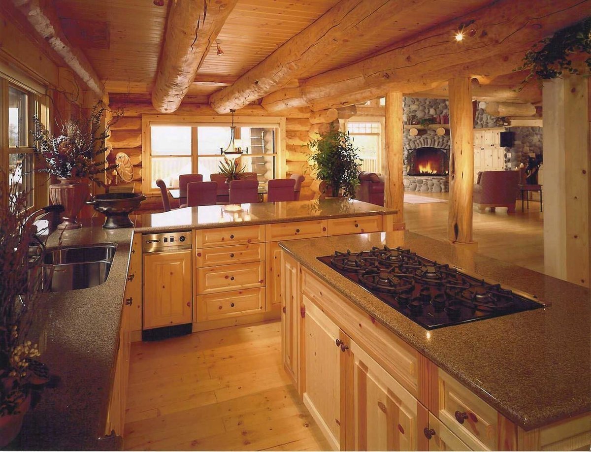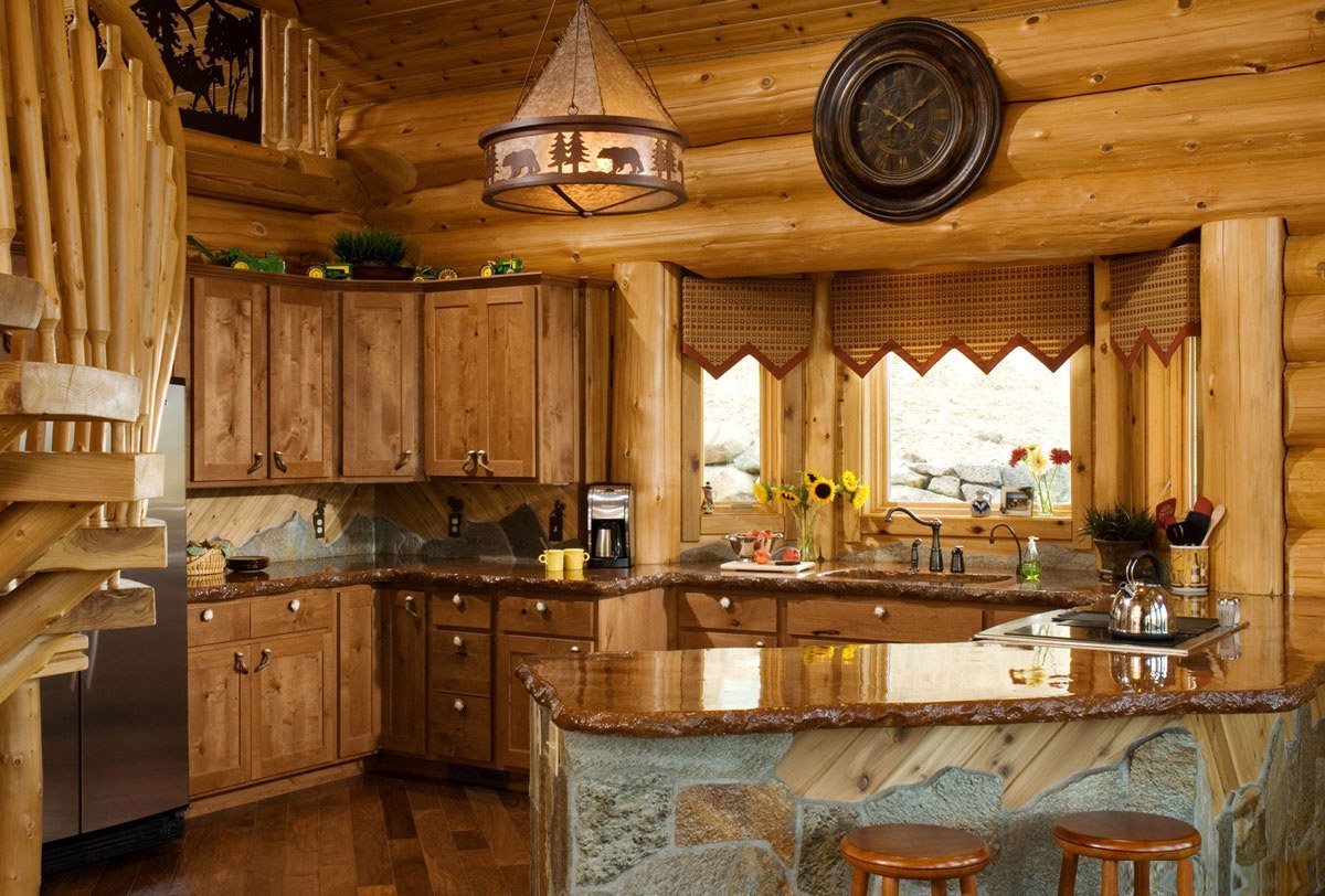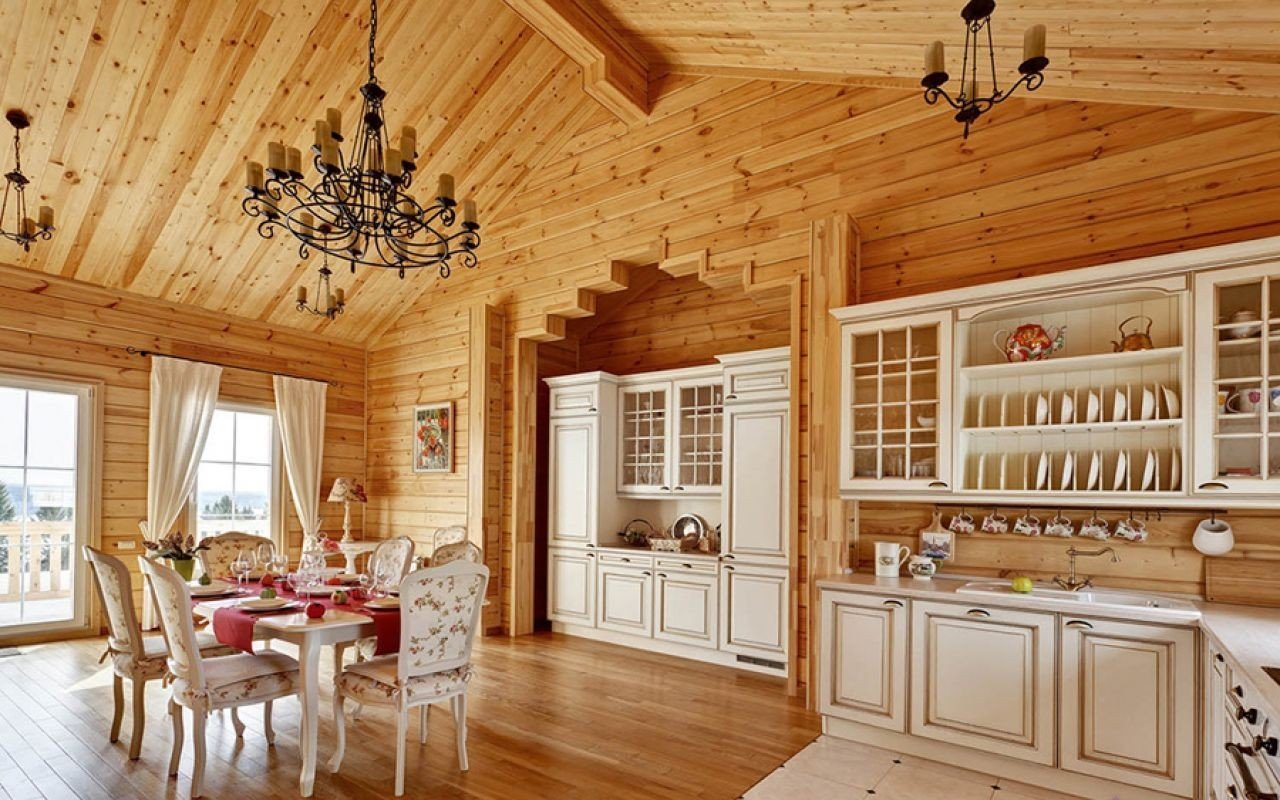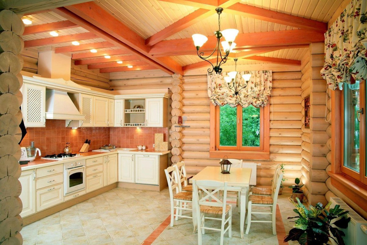 Интерьер кухни в деревянном доме из оцилиндрованного бревна