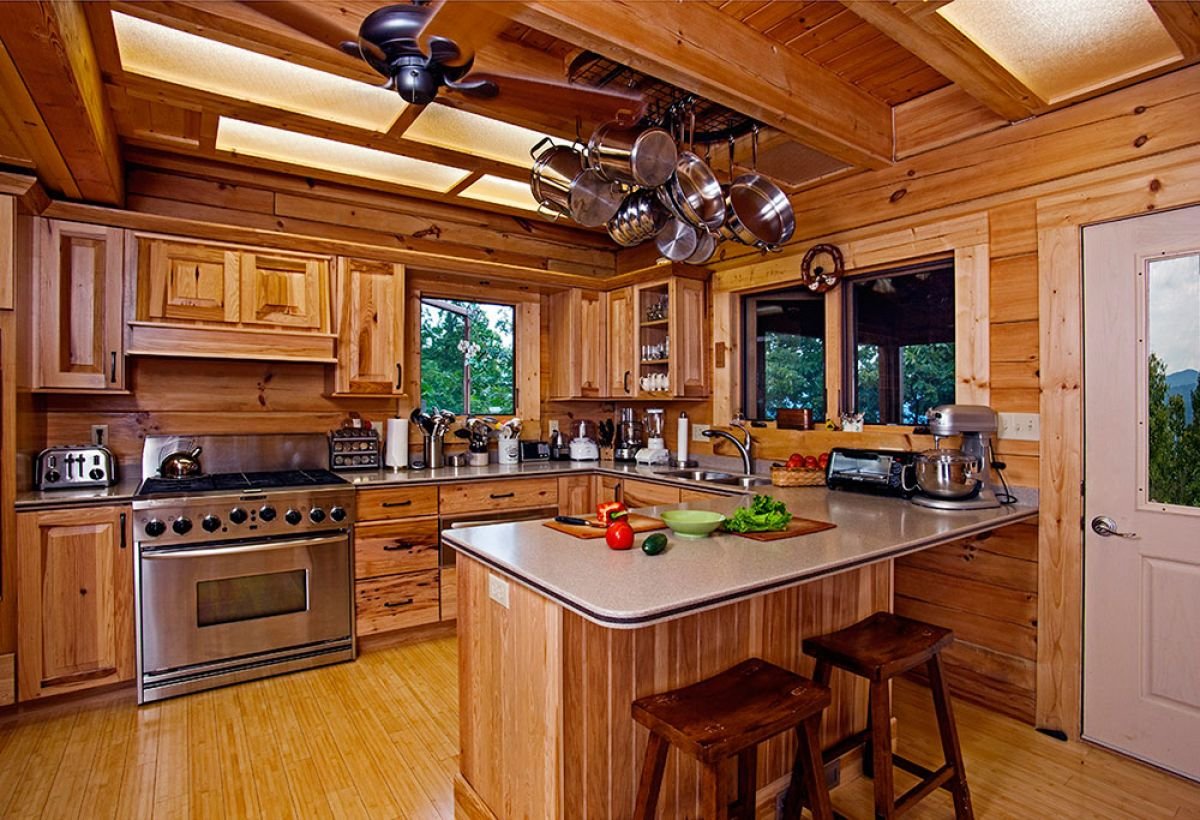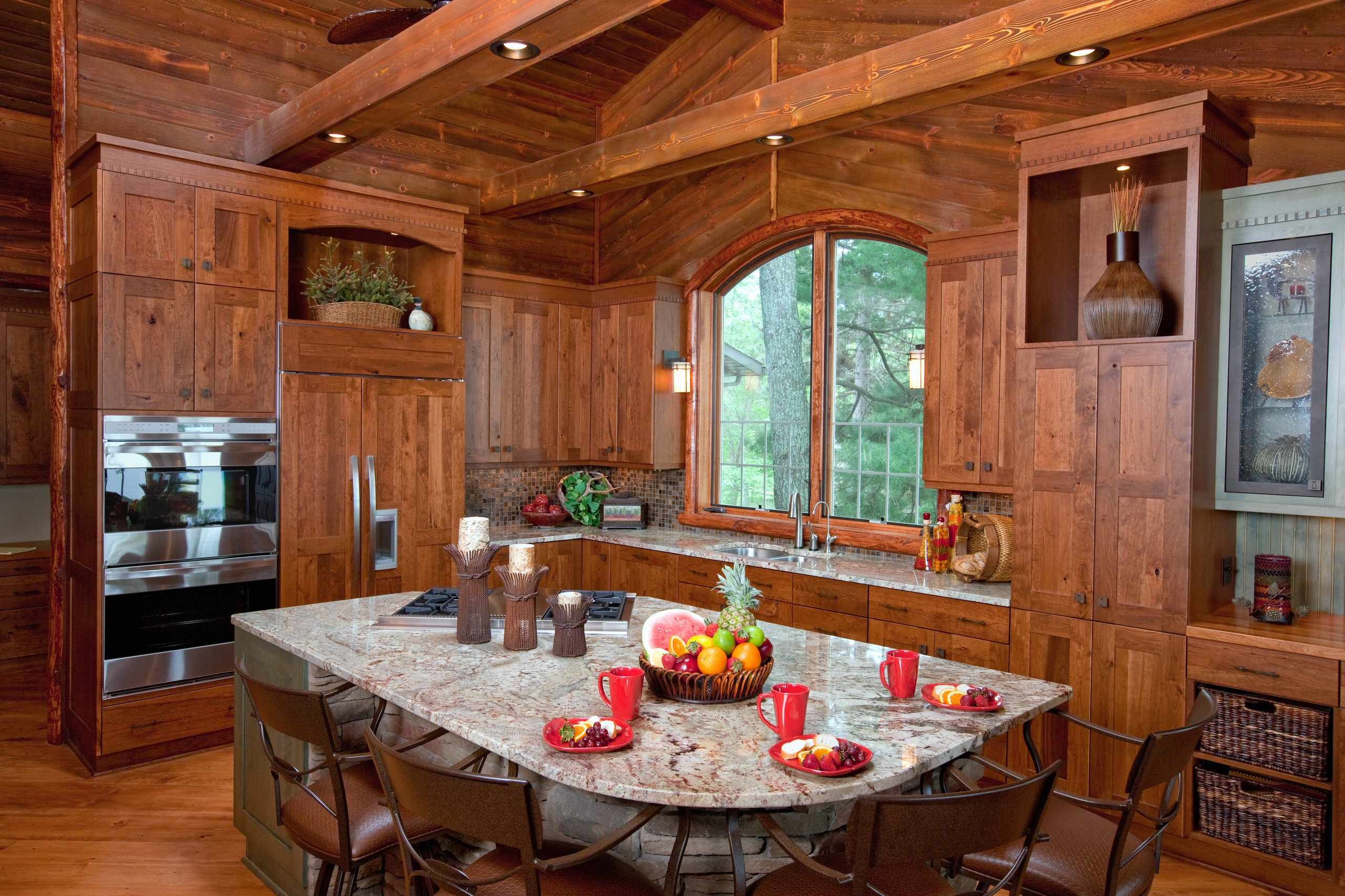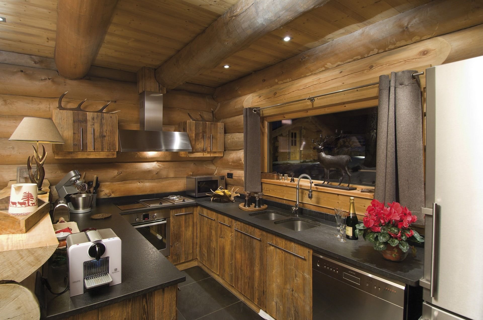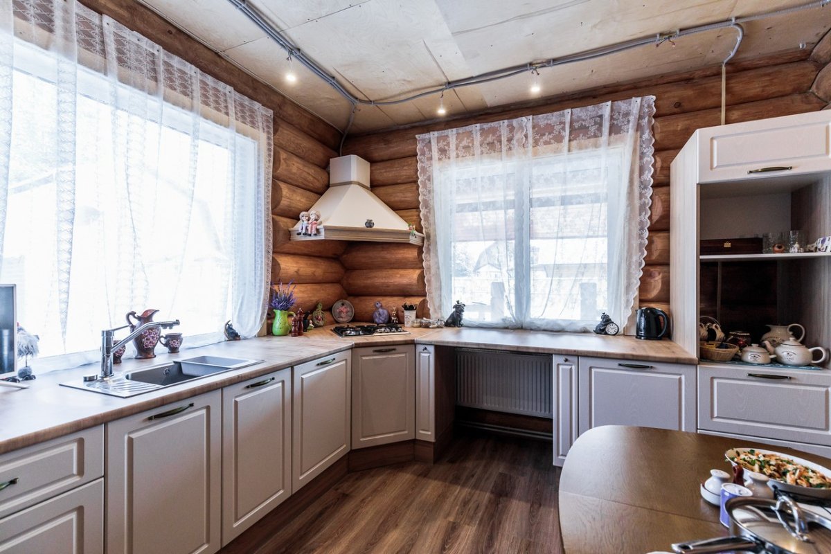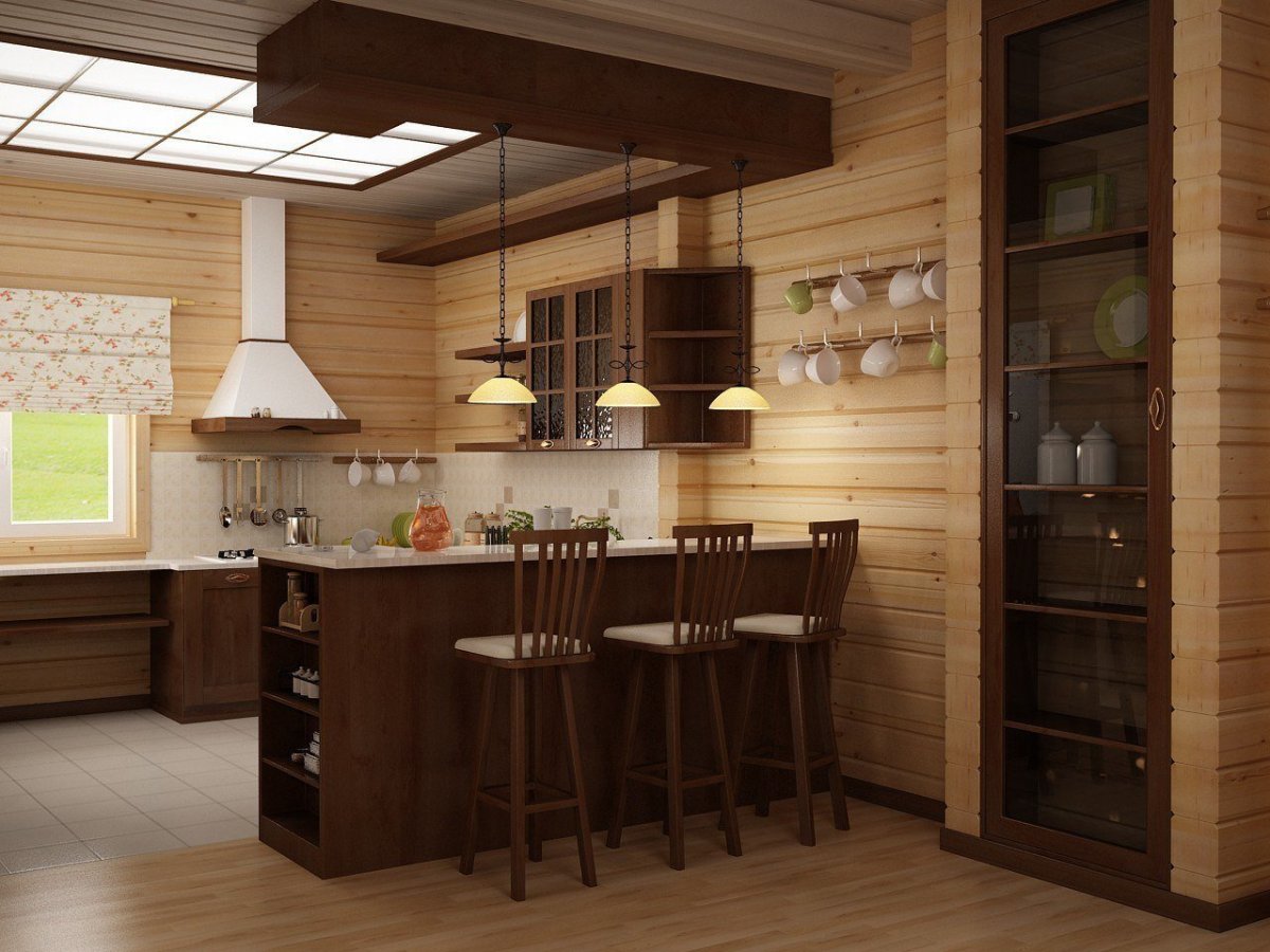 Интерьер кухни в деревянном доме из оцилиндрованного бревна
