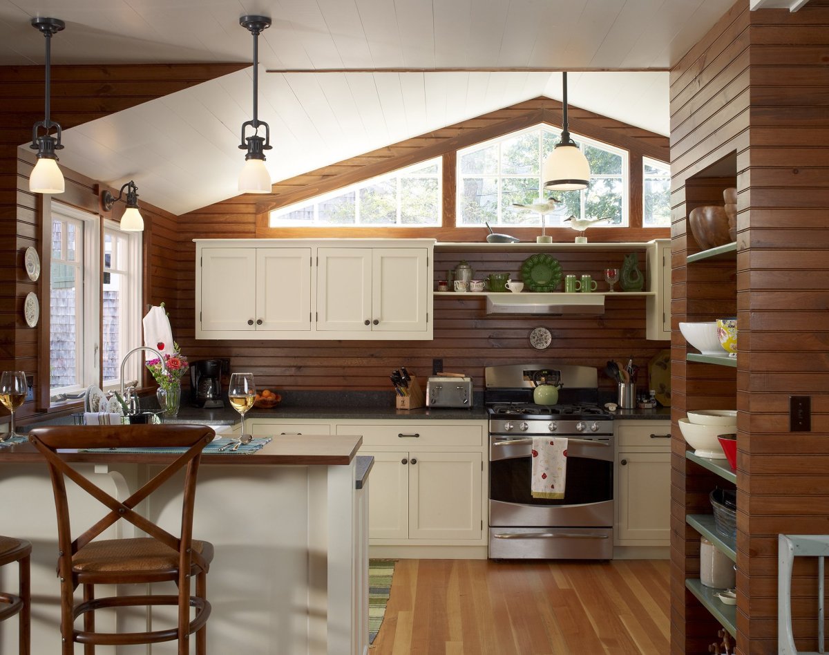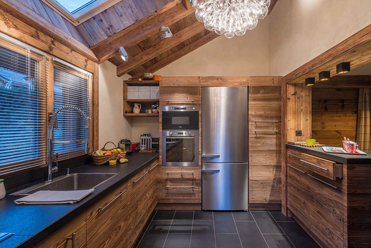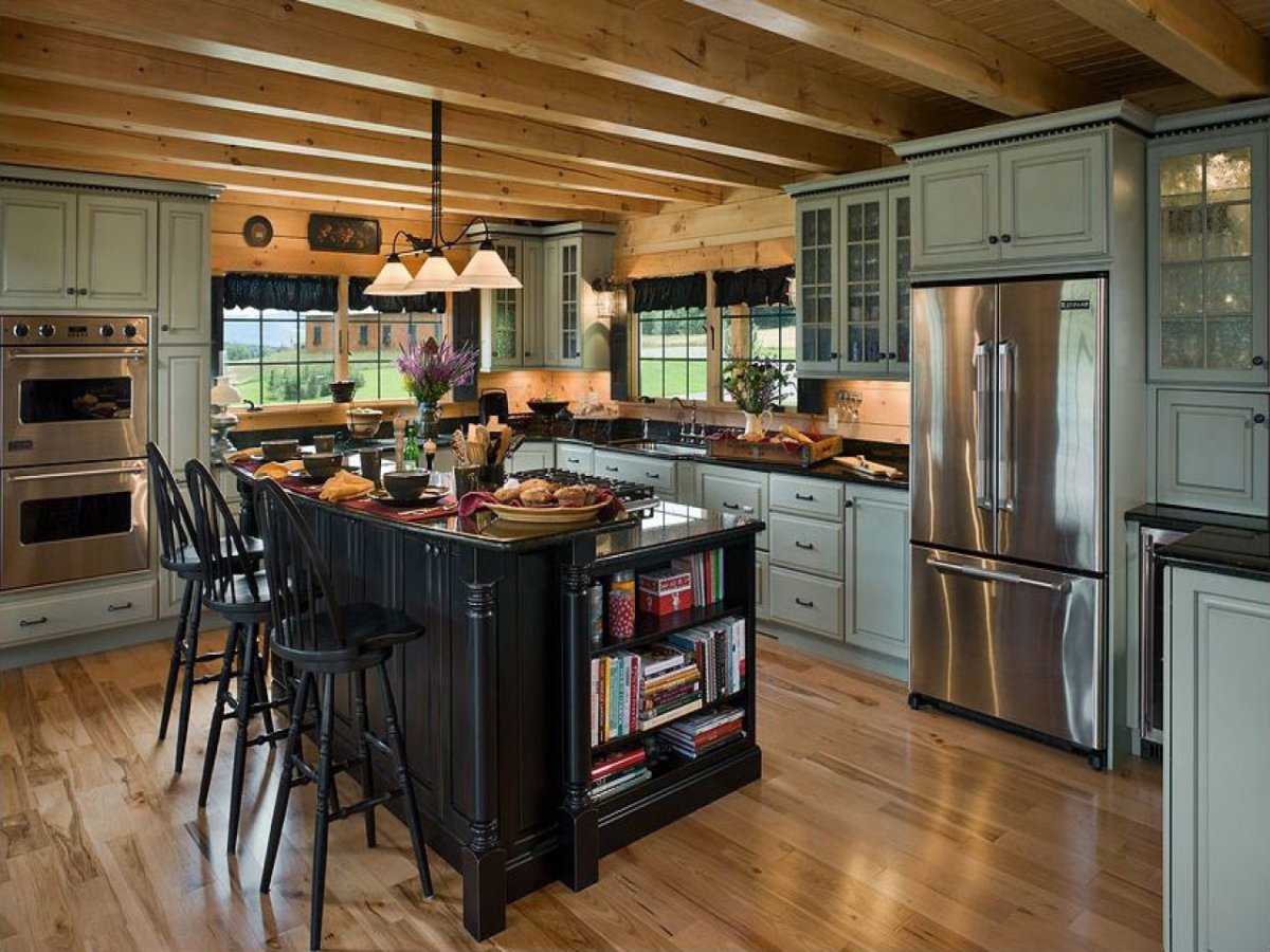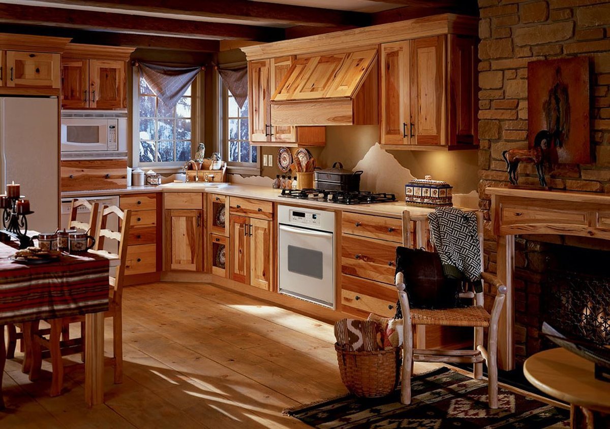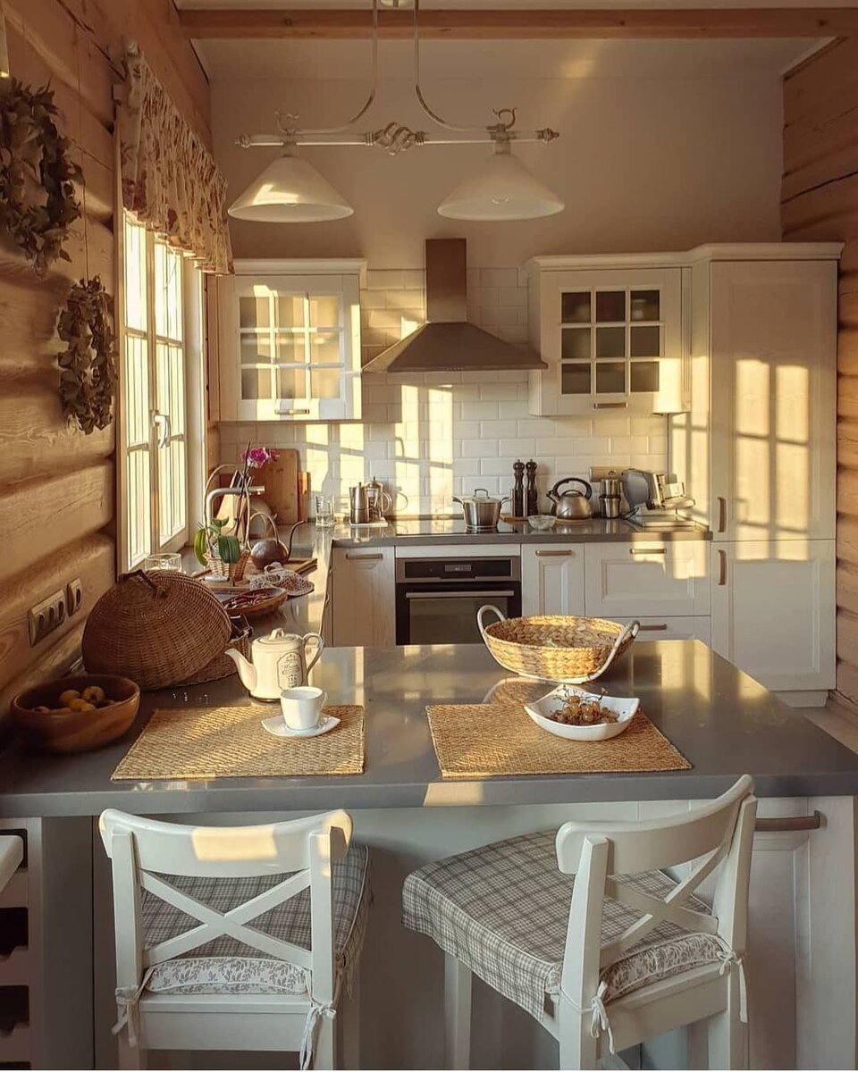 Интерьер кухни в деревянном доме из оцилиндрованного бревна