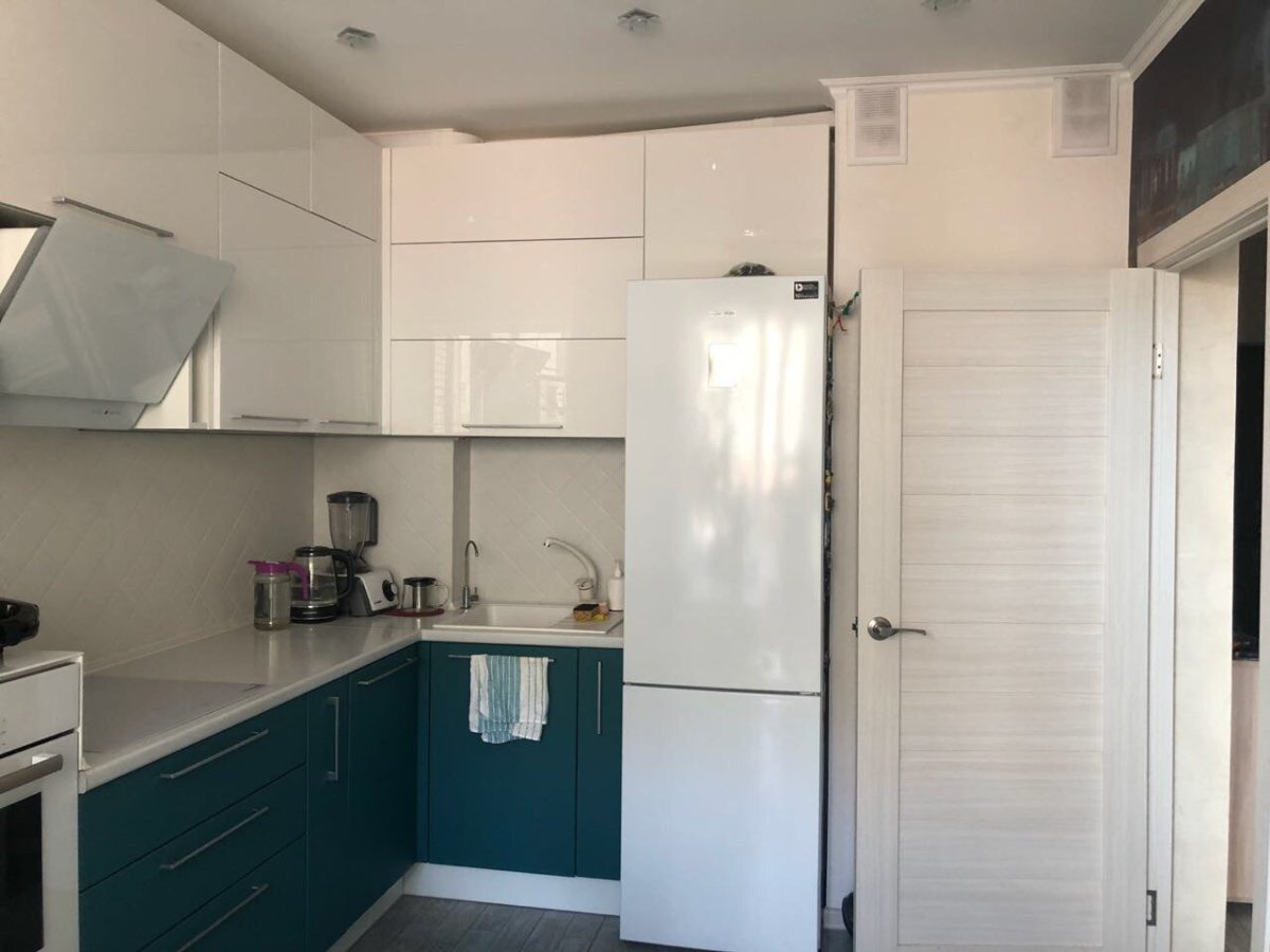 Угловая кухня с большим холодильником