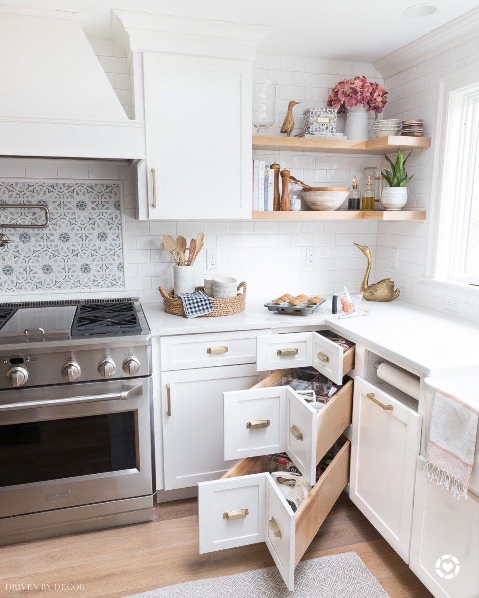 Белая угловая кухня с деревянной столешницей