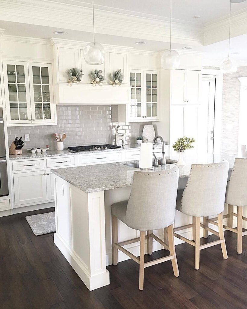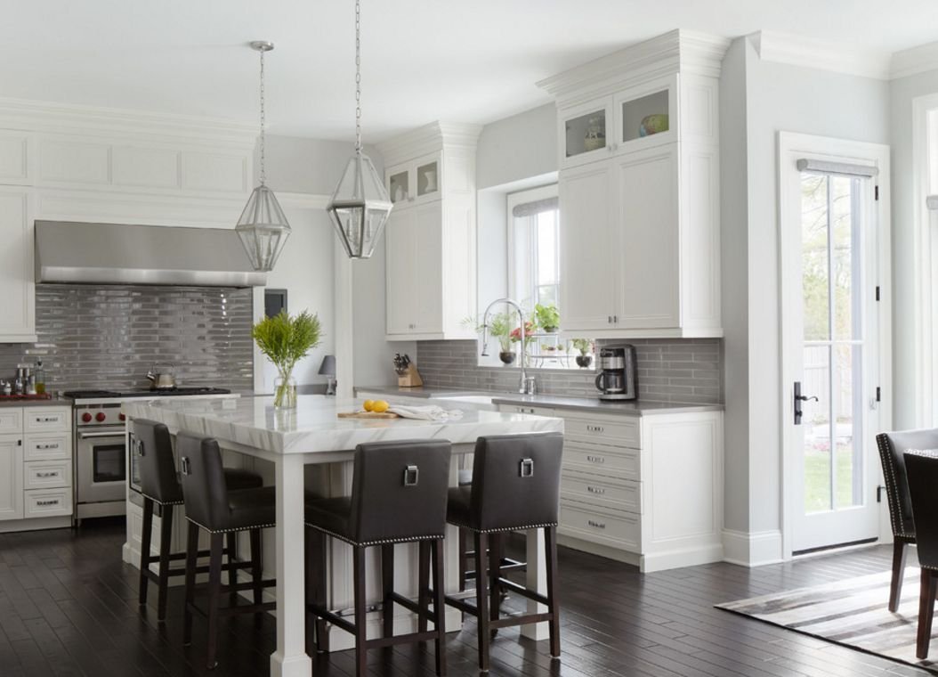 Белый кухонный гарнитур и серые стены