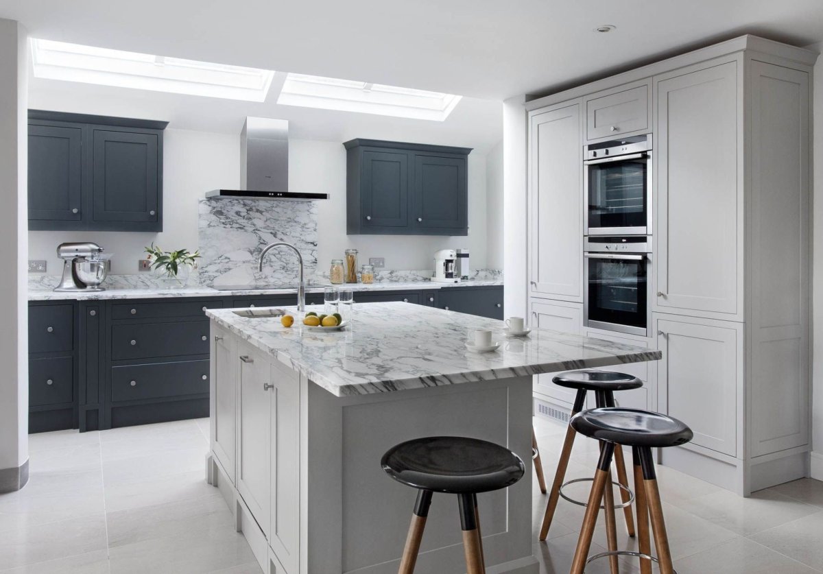 Белая кухня с серой столешницей