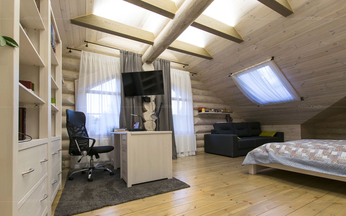 Спальня для подростка в мансардном этаже в деревянном доме