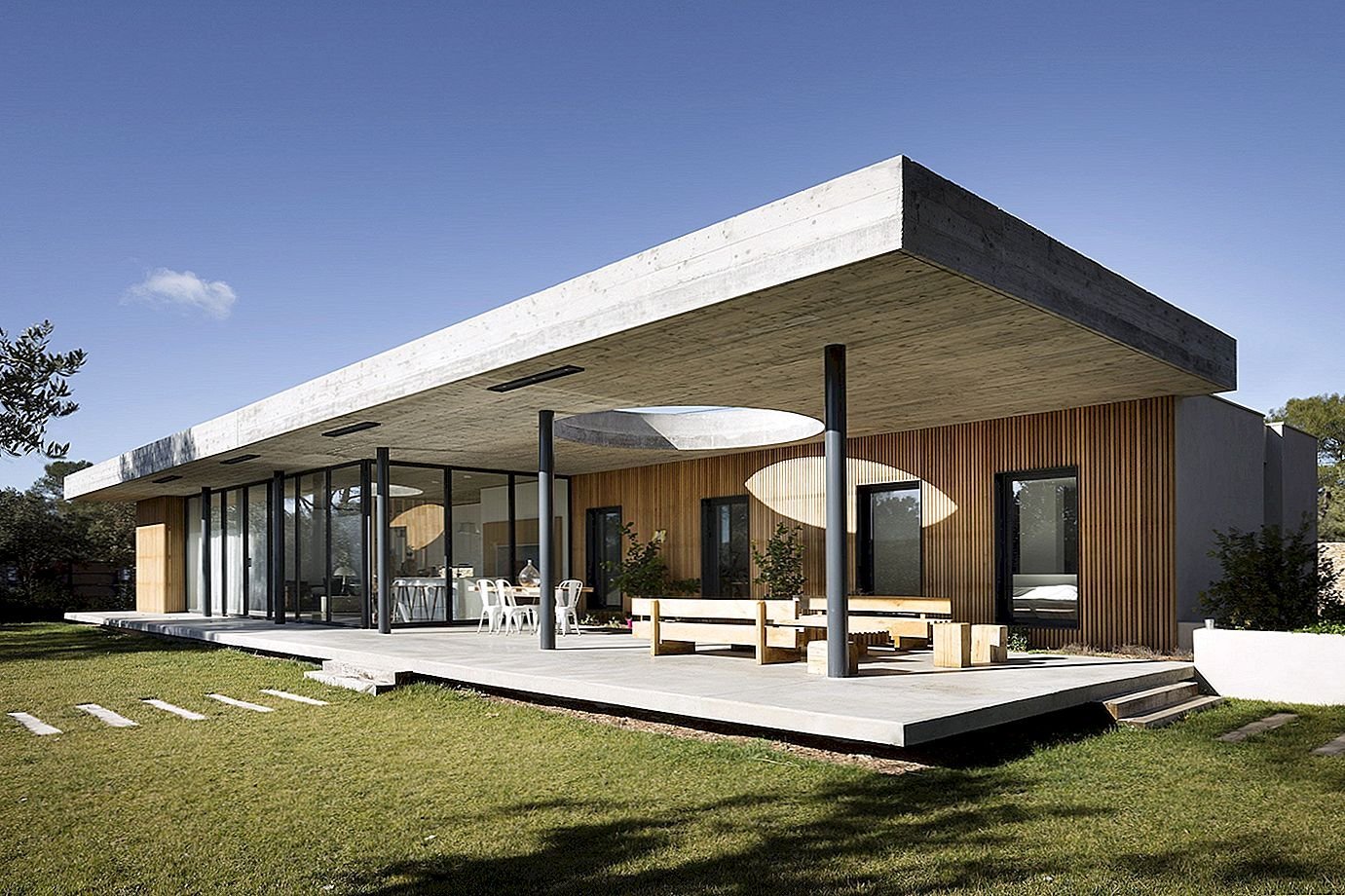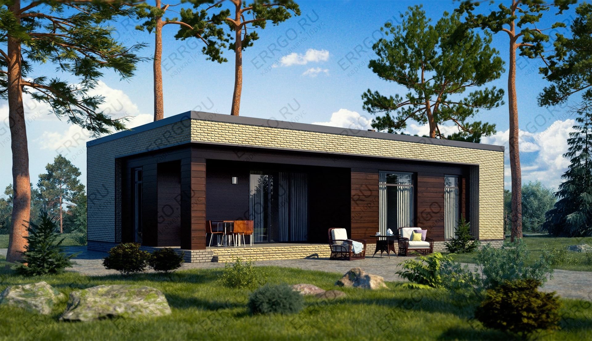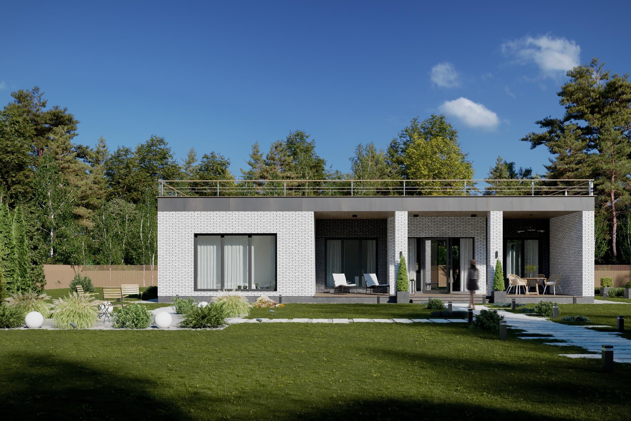 Одноэтажный дом с плоской крышей и террасой