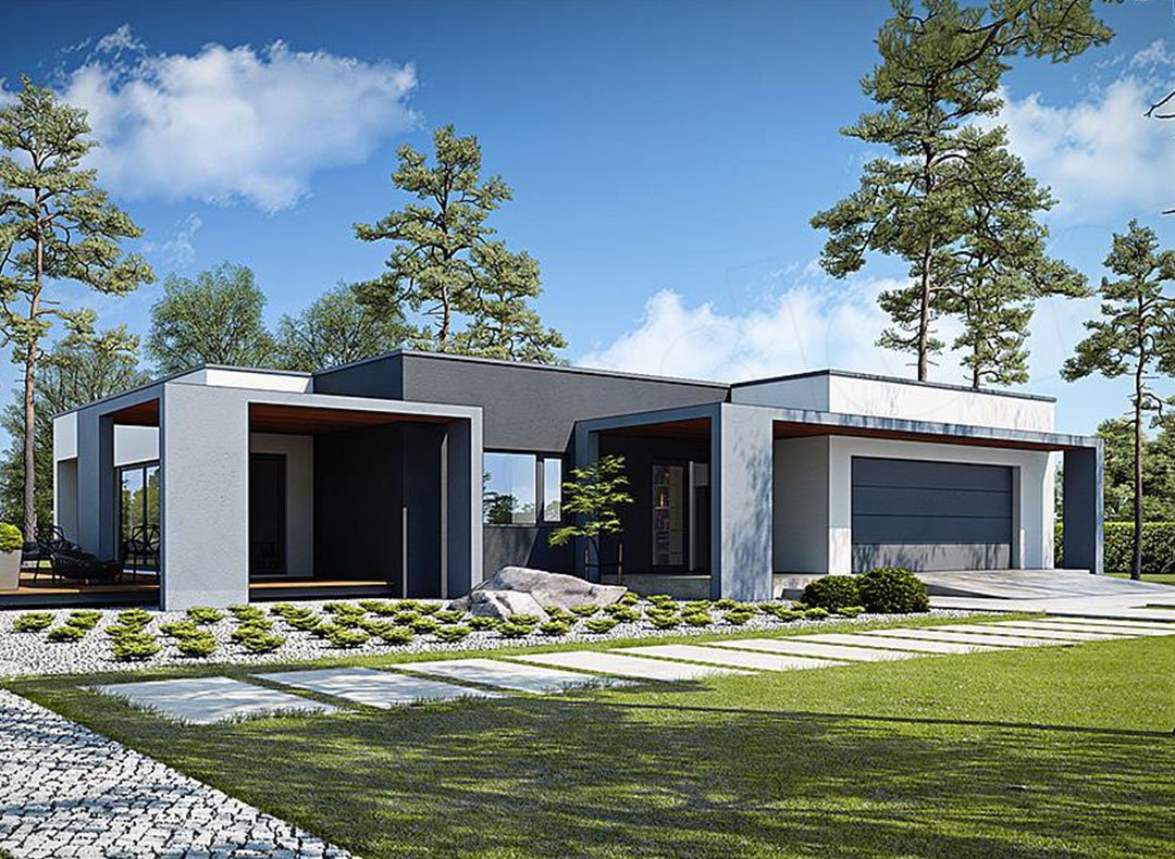 Одноэтажный дом с плоской крышей и гаражом