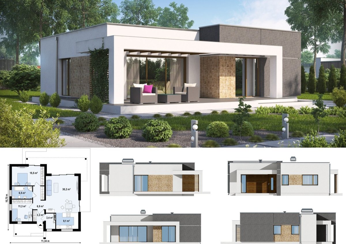 Одноэтажный дом z500 с плоской крышей проекты