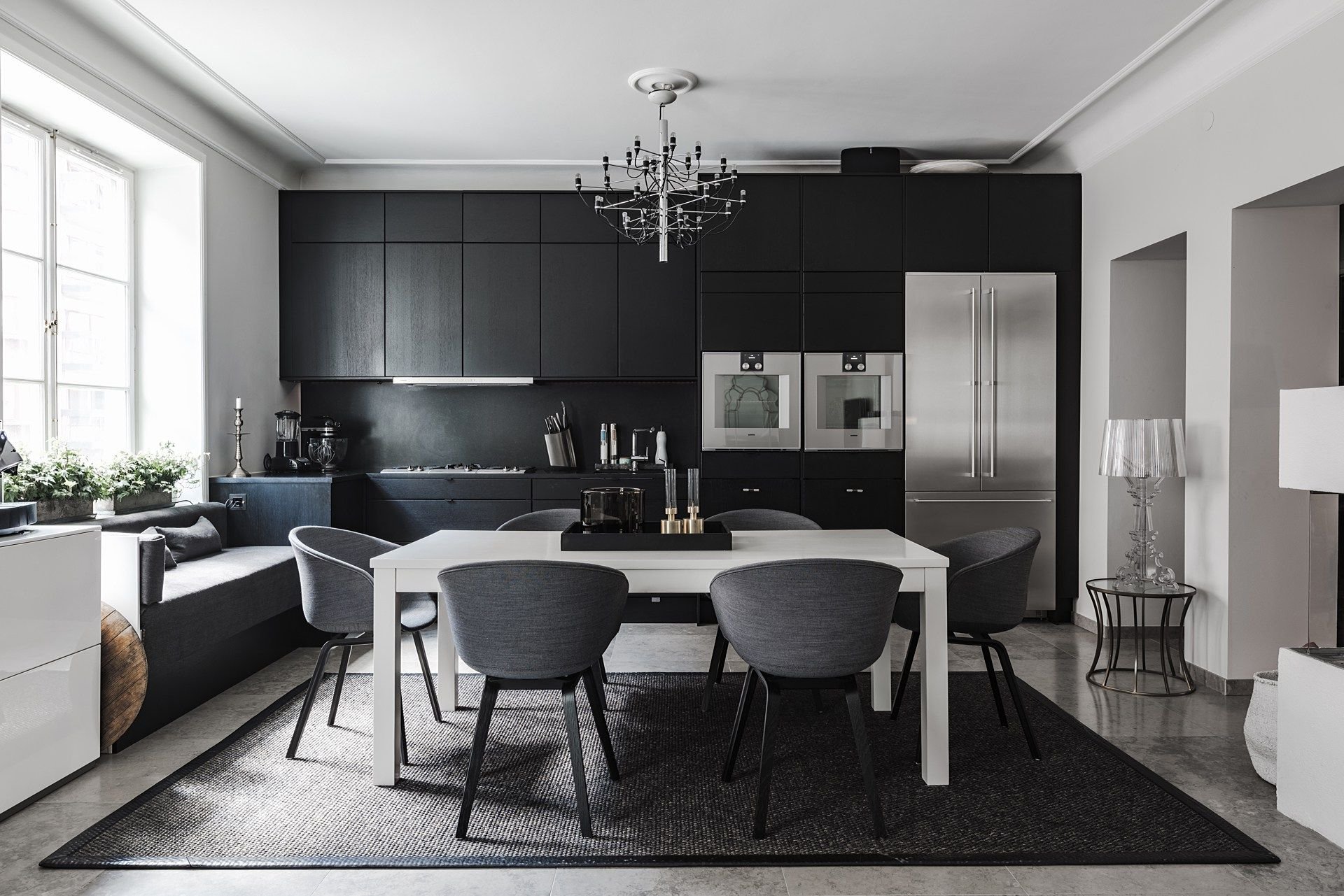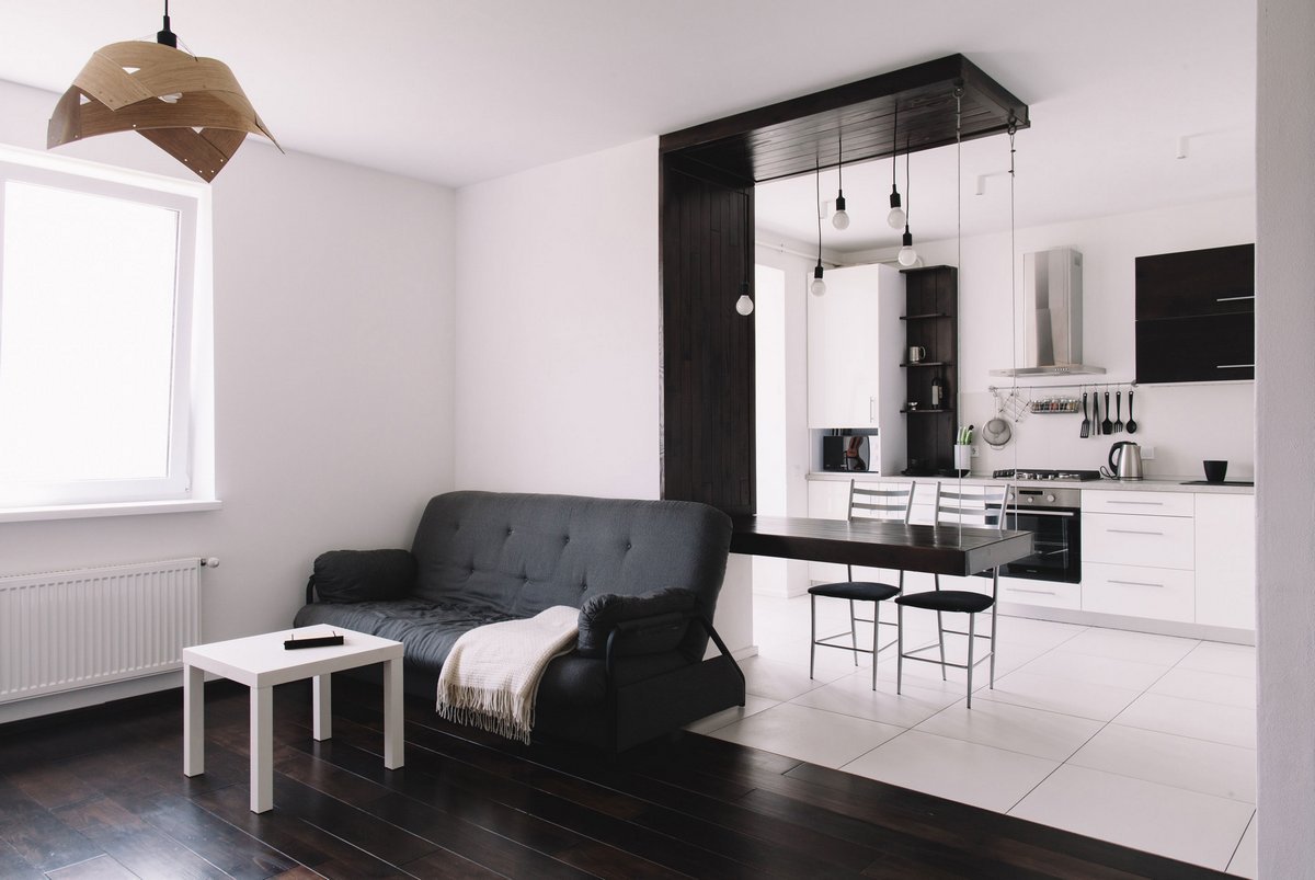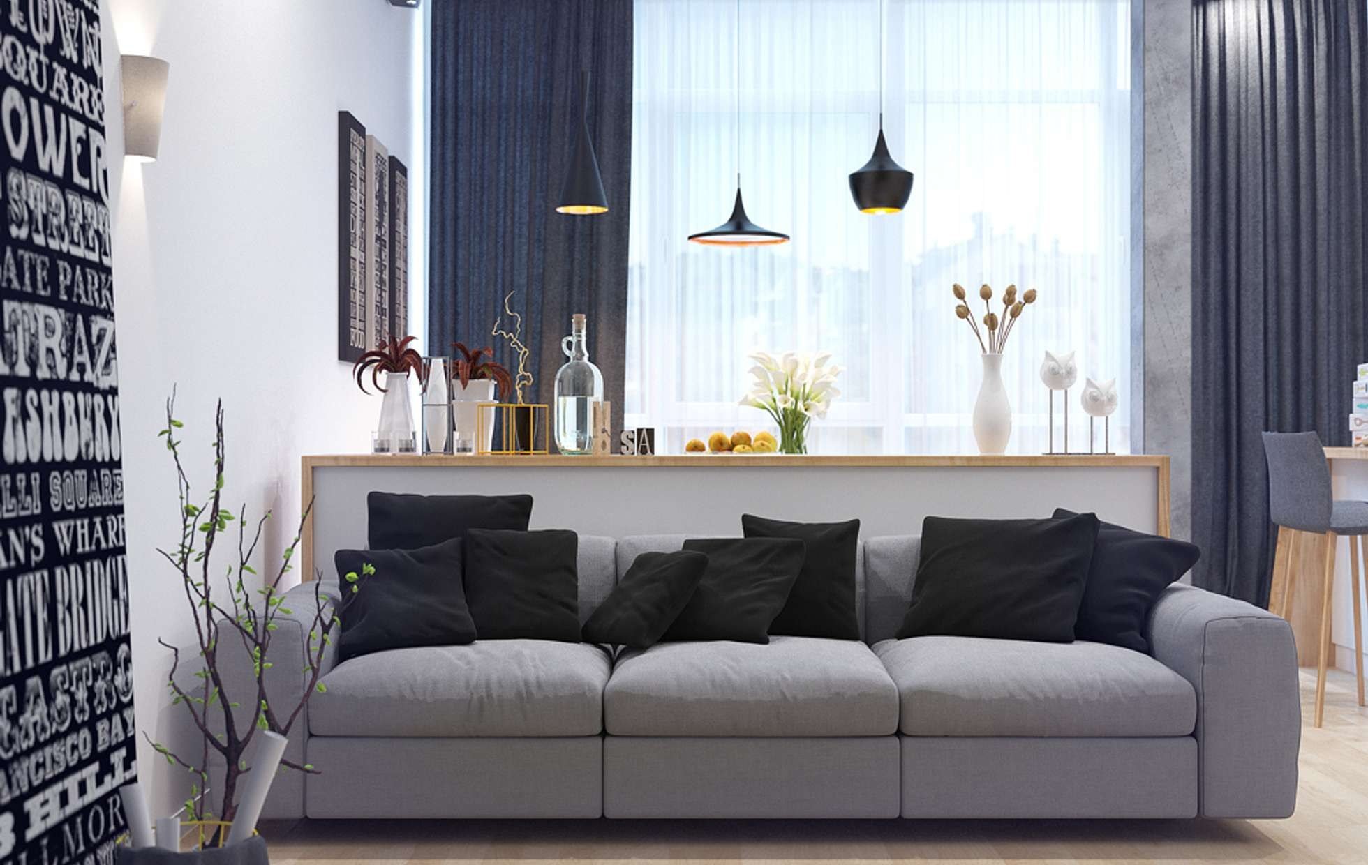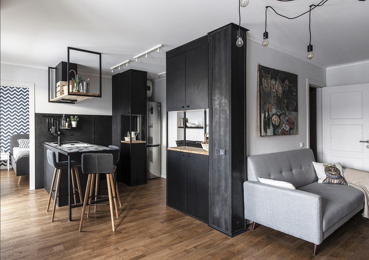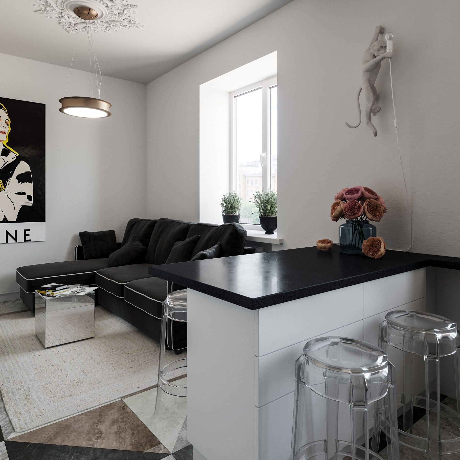 Кухня гостиная с ЗАКУТКОМ В черно белых тонах