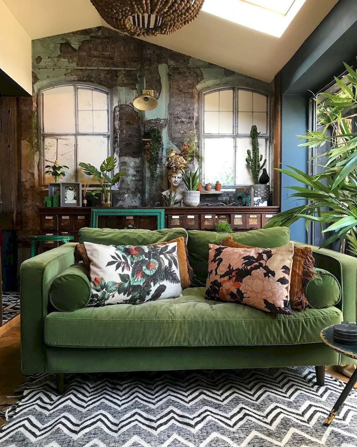 Зеленый диван в интерьере лофт