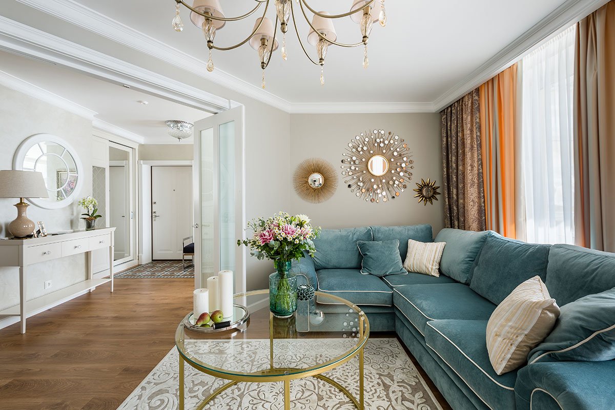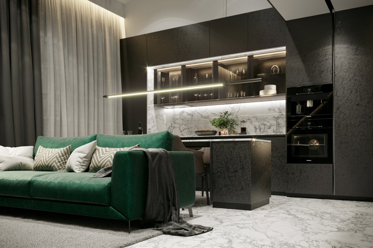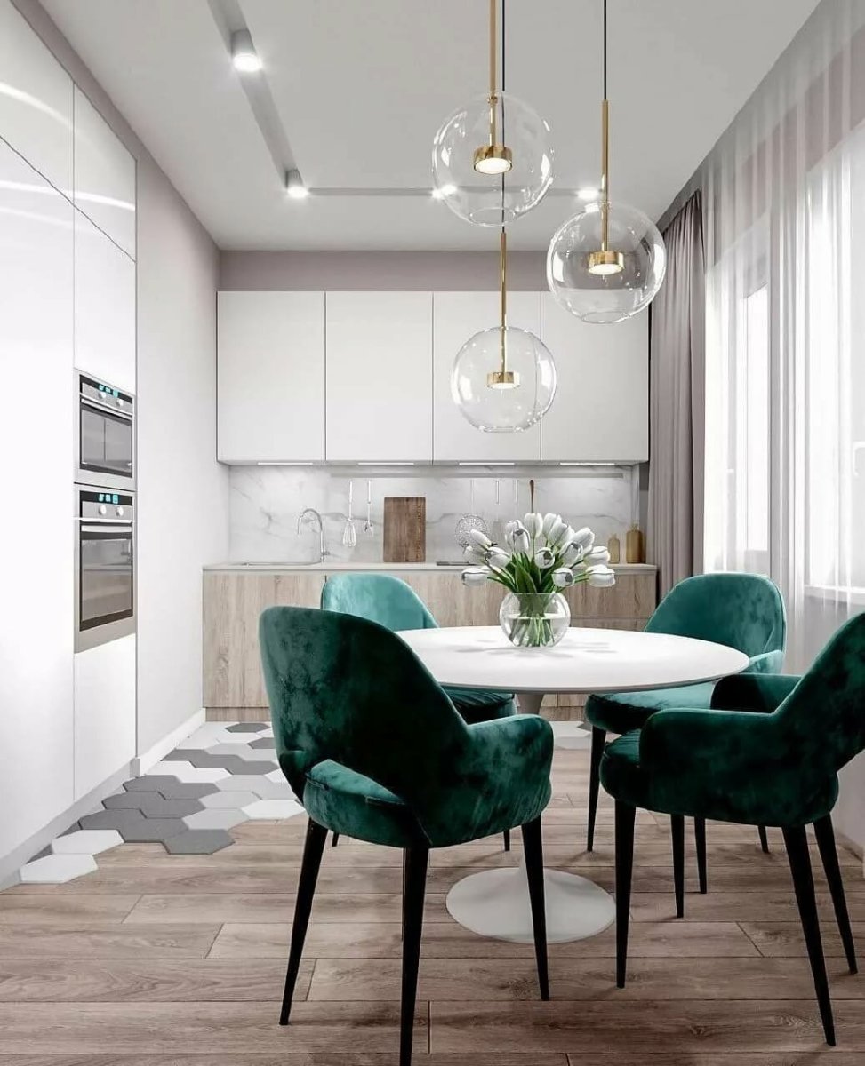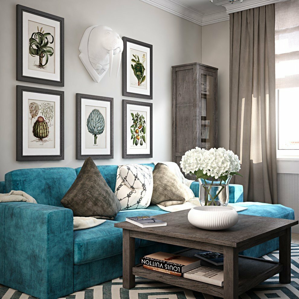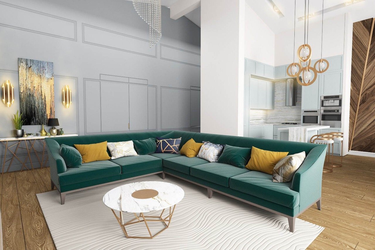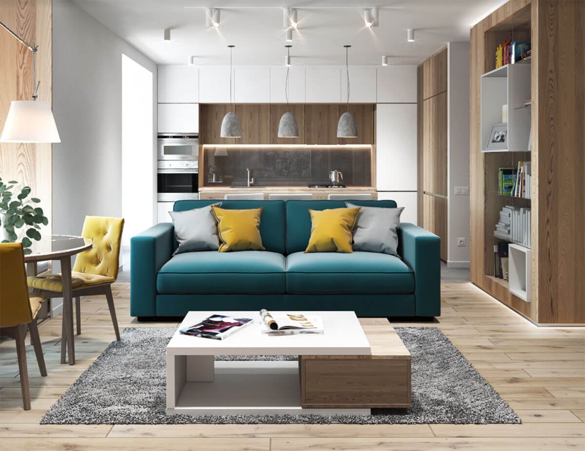 Гостиная в бирюзовых тонах в современном стиле с кухней
