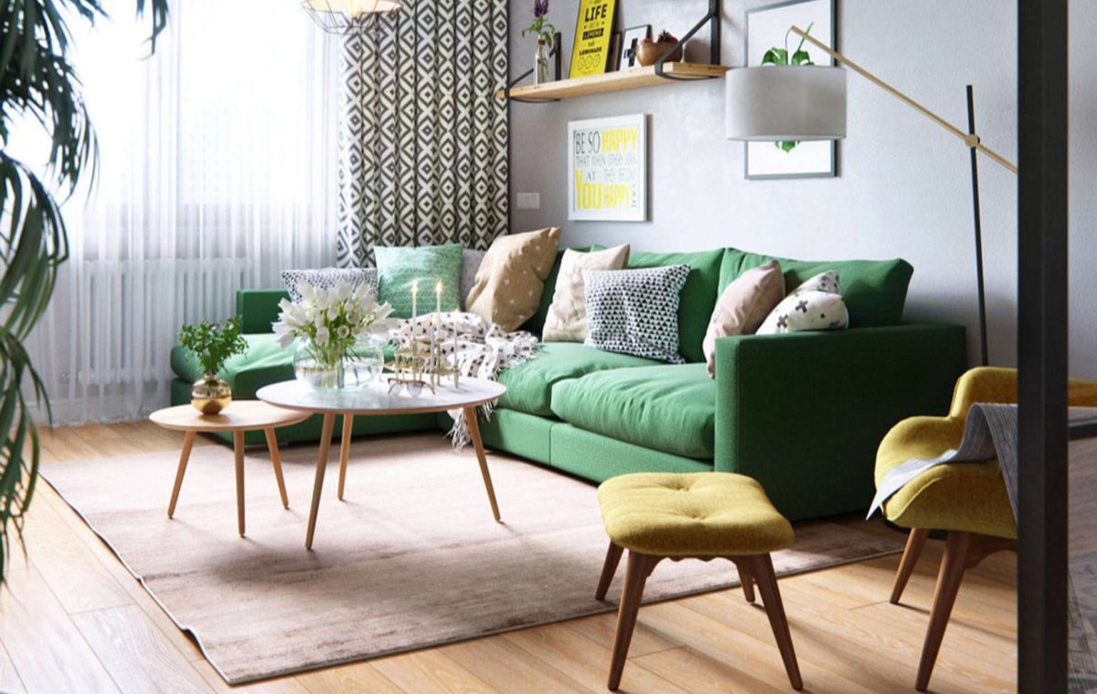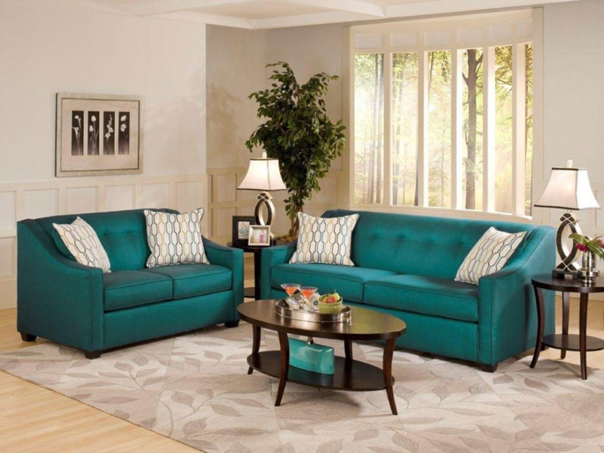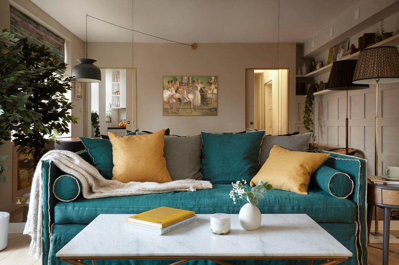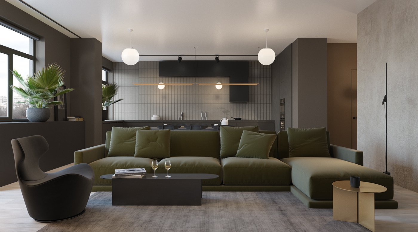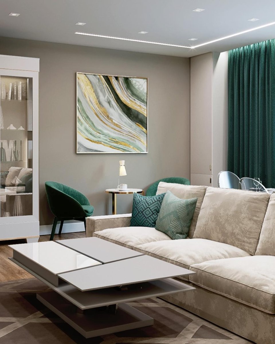 Гостиная в бирюзовых тонах в современном стиле с кухней