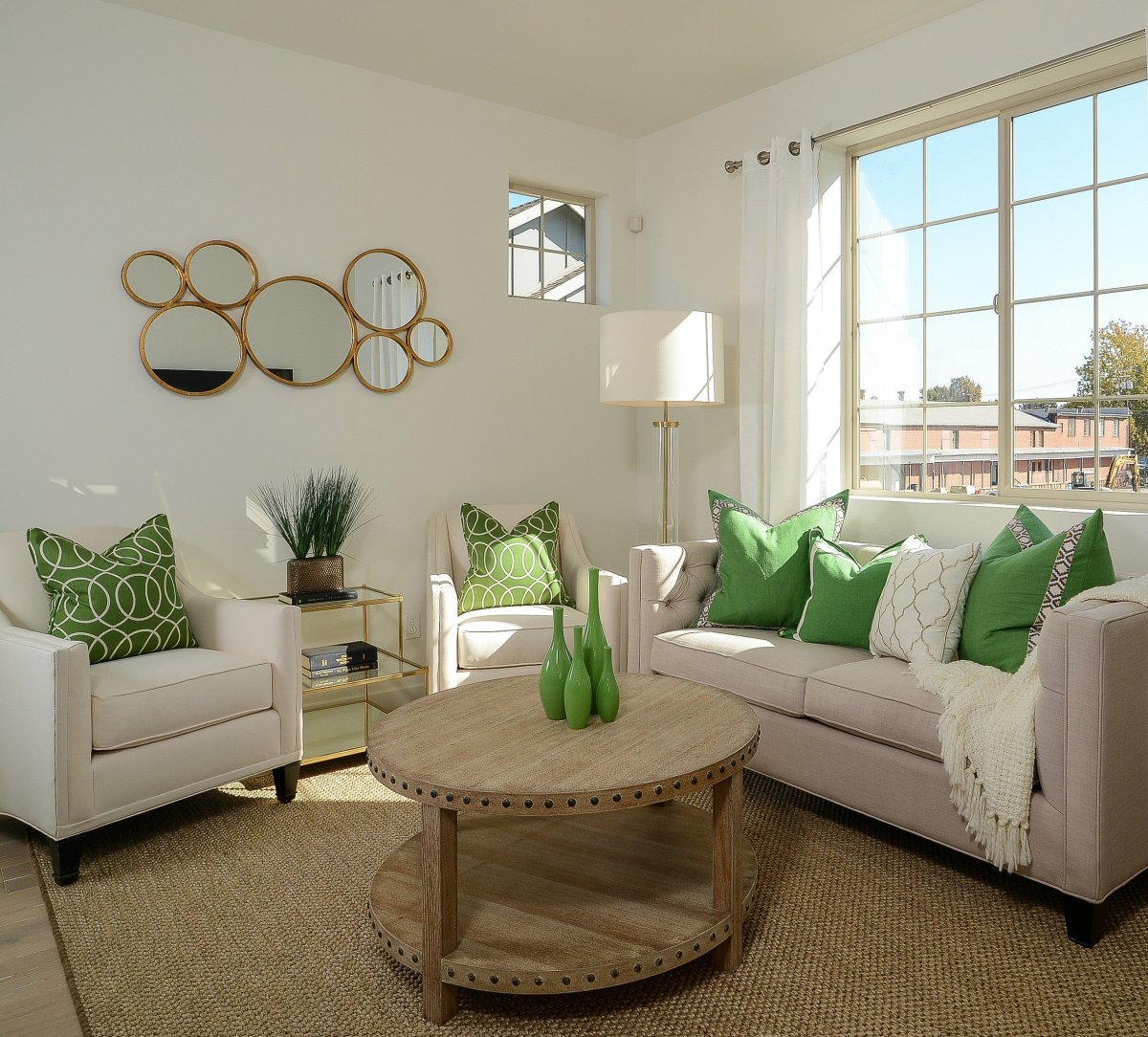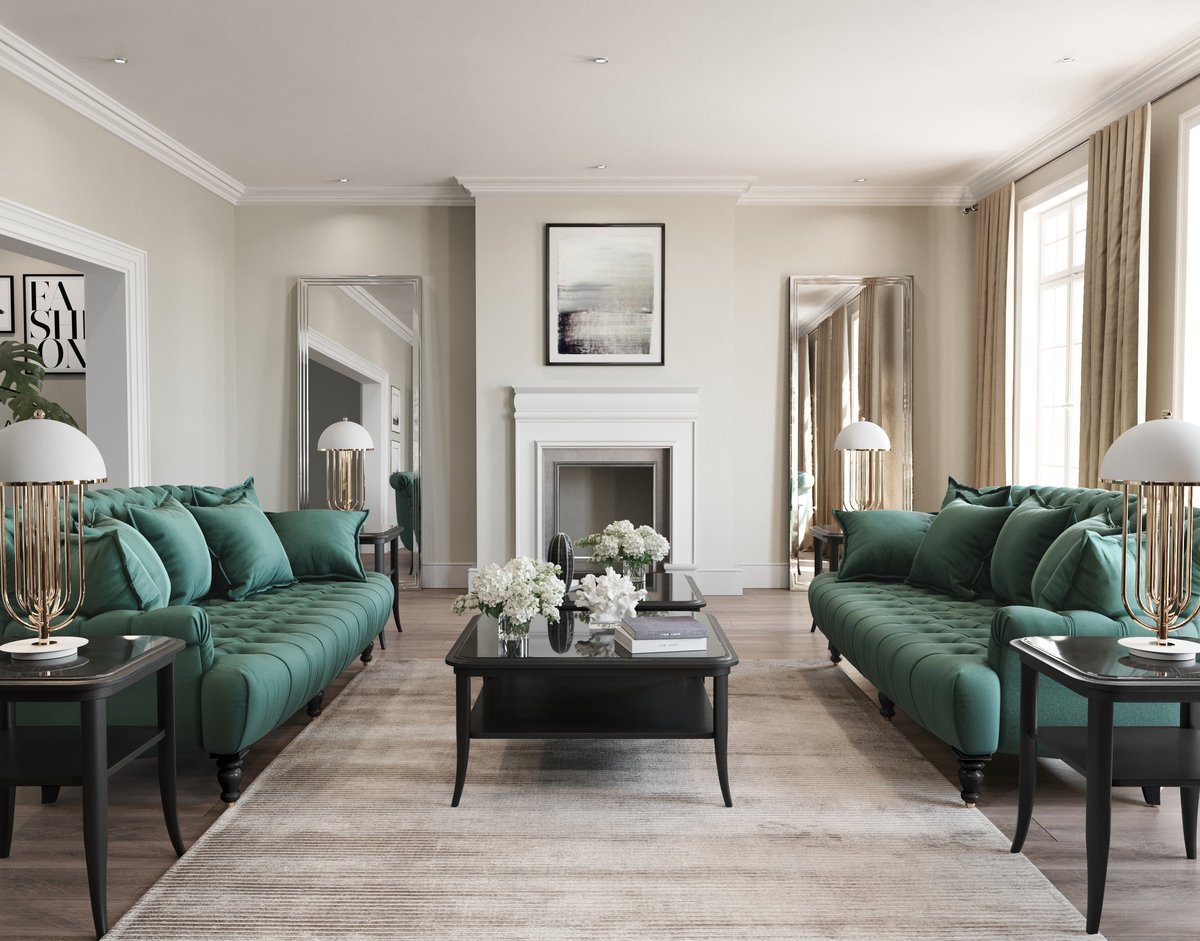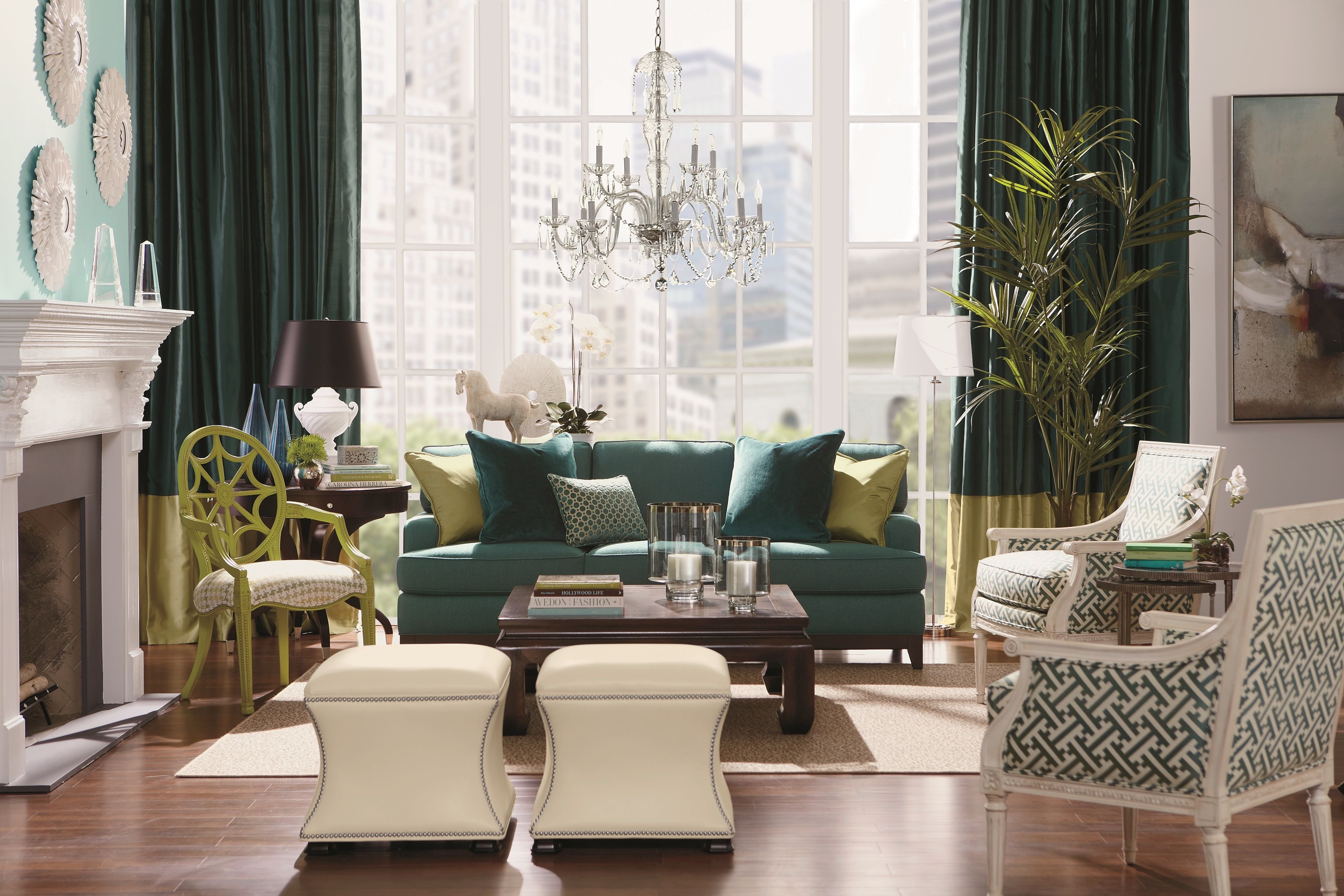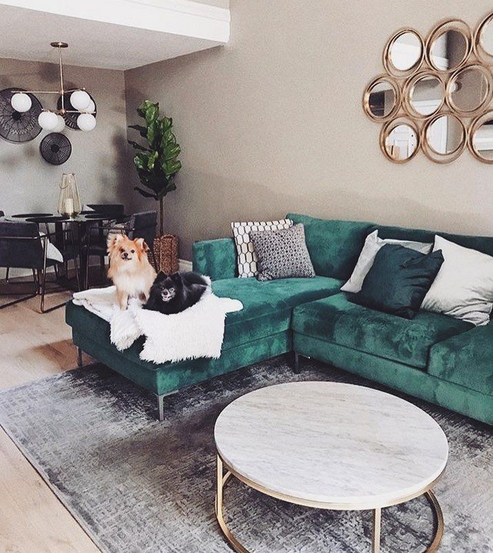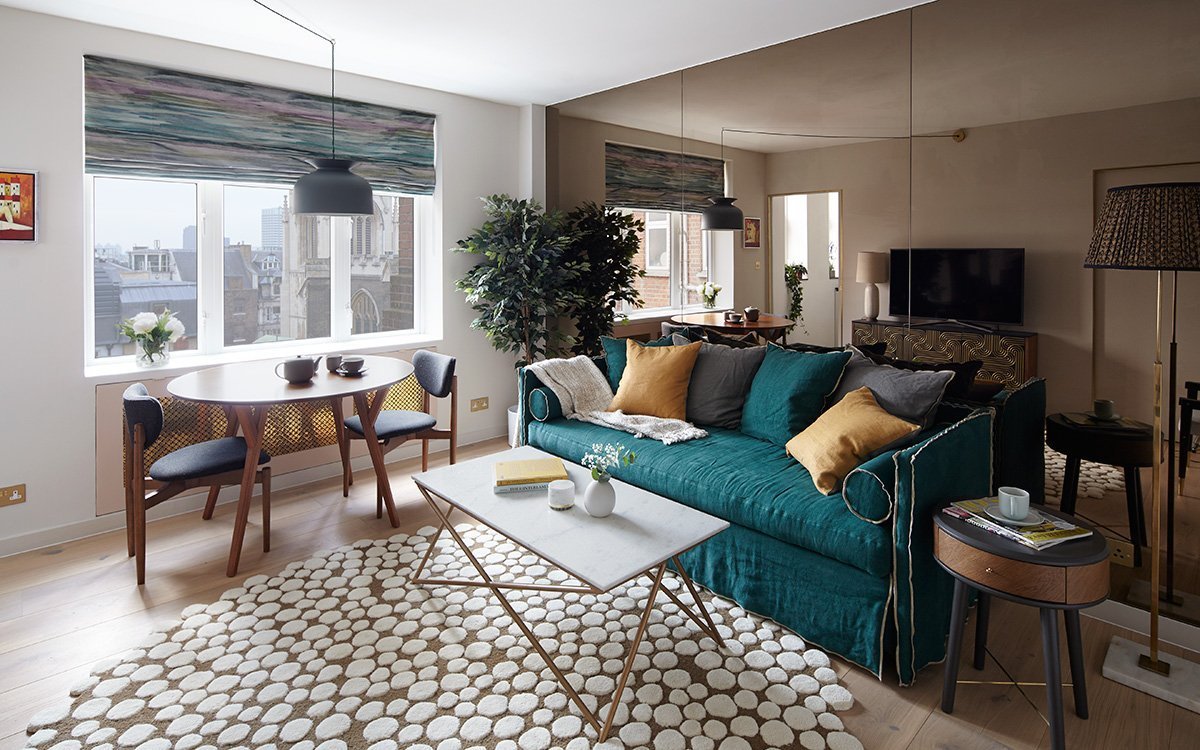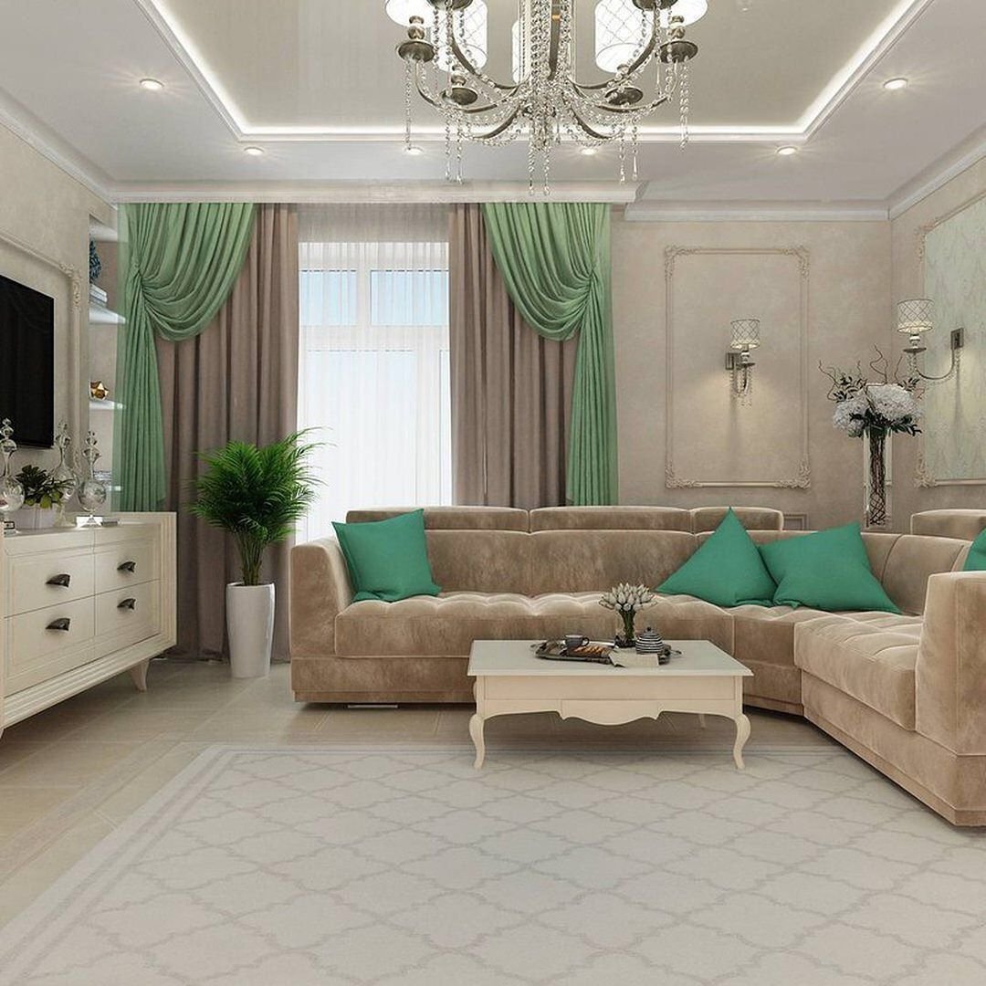 Гостиная в бирюзовых тонах в современном стиле с кухней