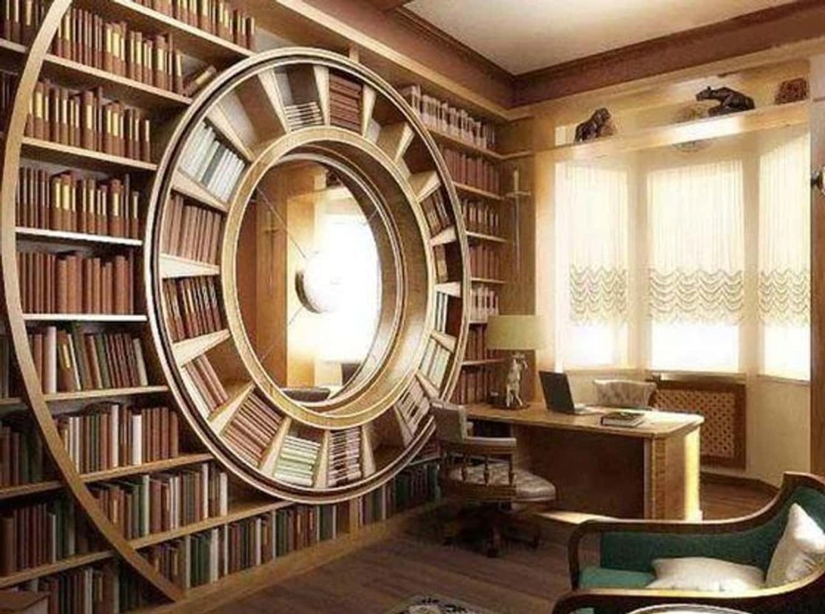 Обои книжные полки в интерьере