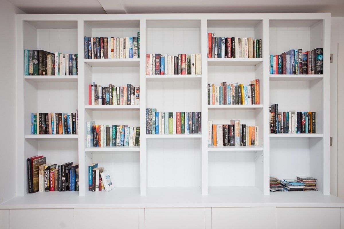Белые книжные полки с книгами