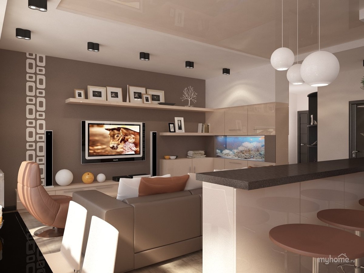 Коричневая кухня гостиная
