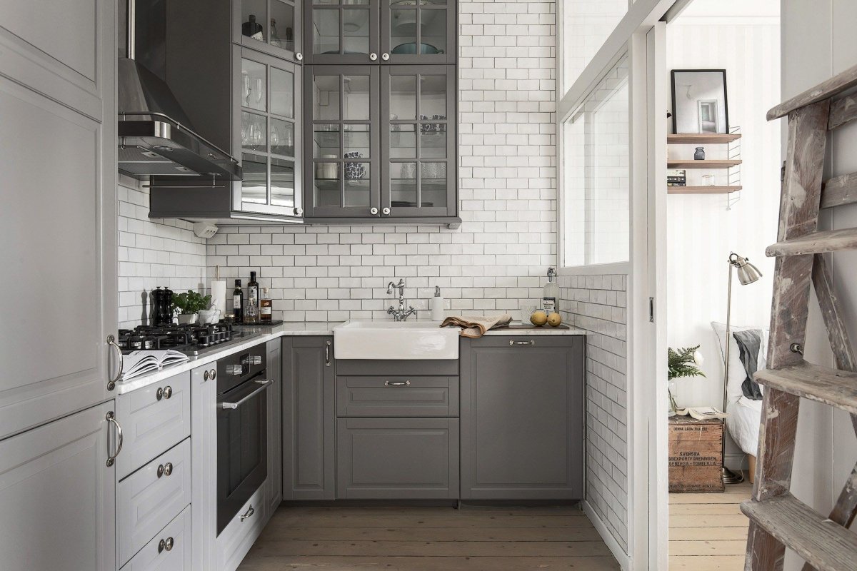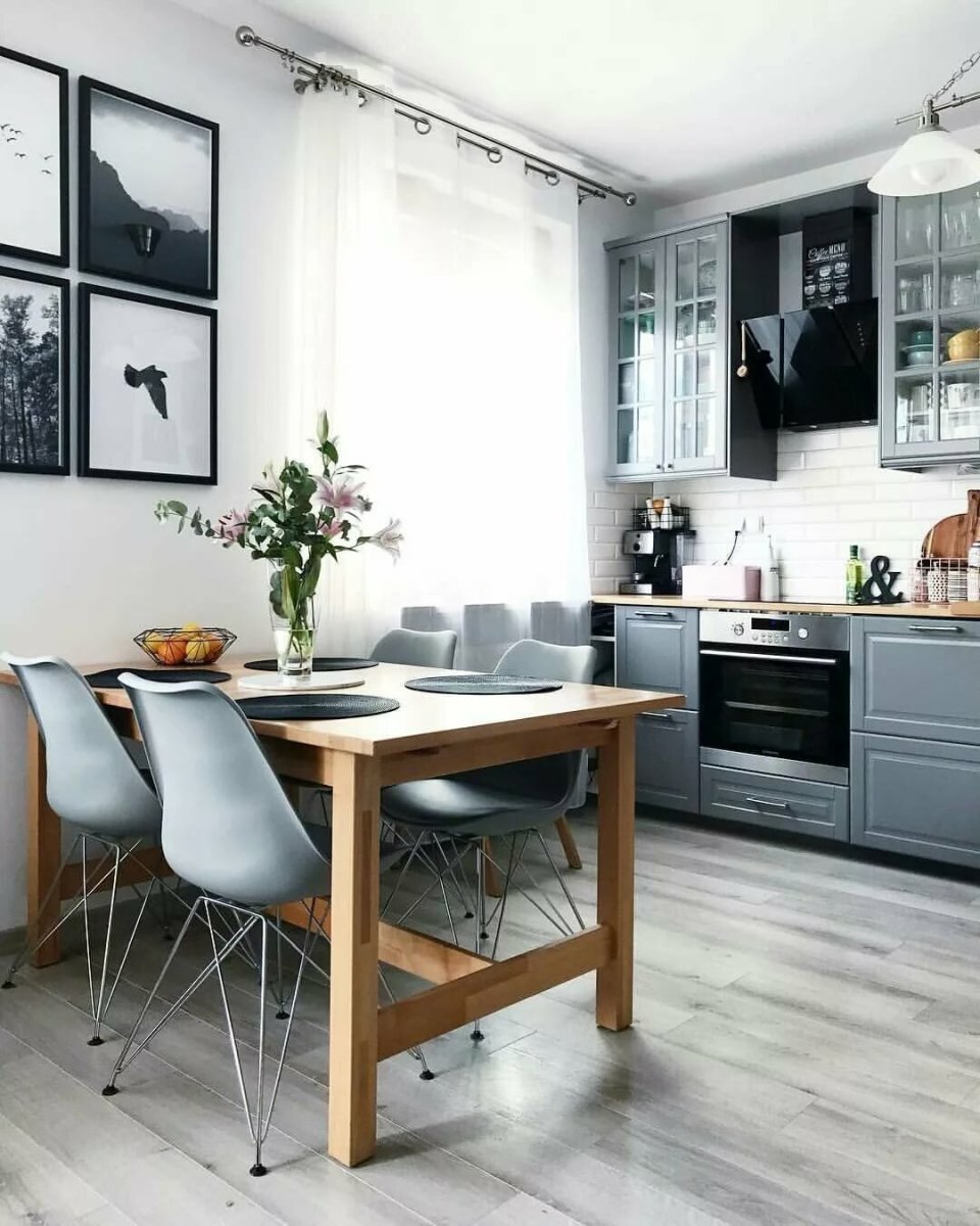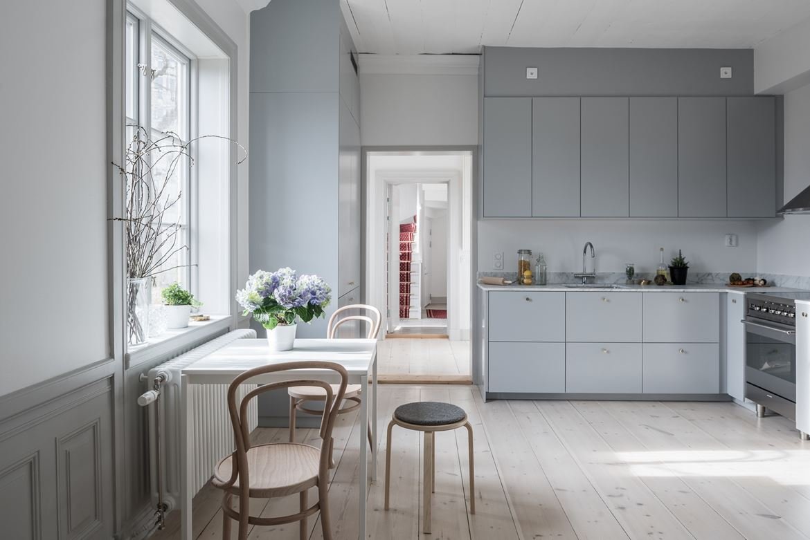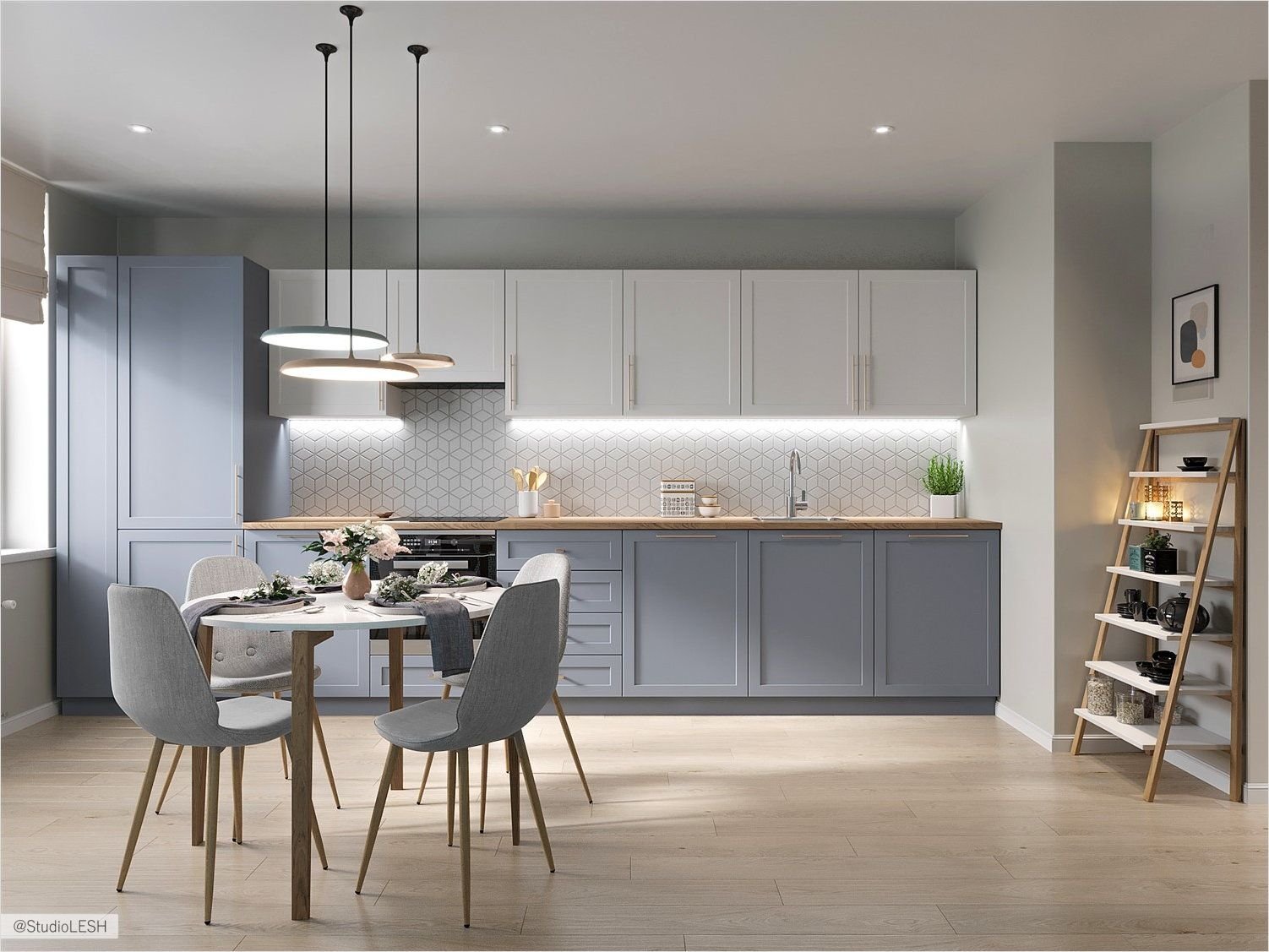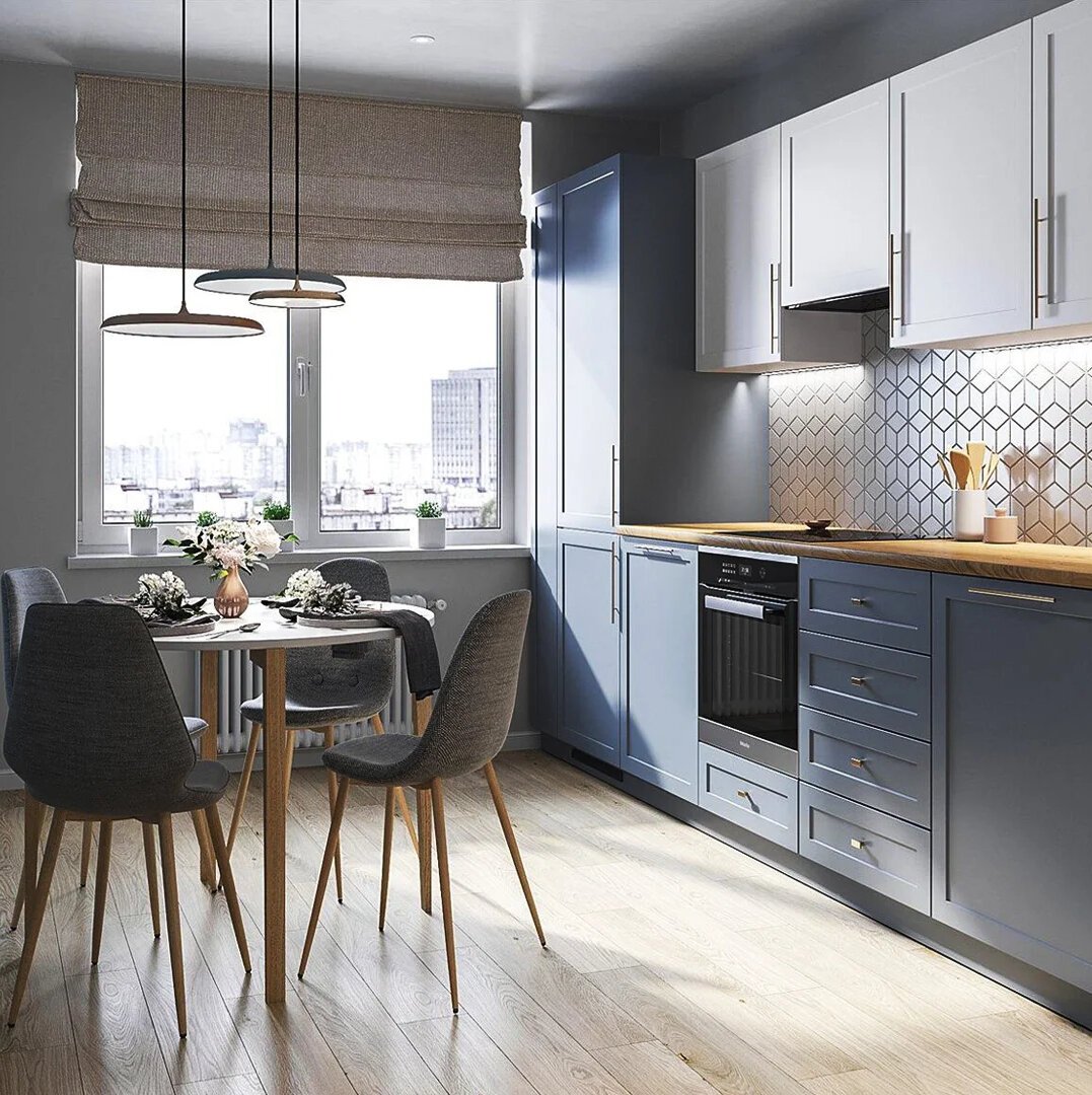 Скандинавский стиль на кухне серые стены и голубая плитка кабанчиком