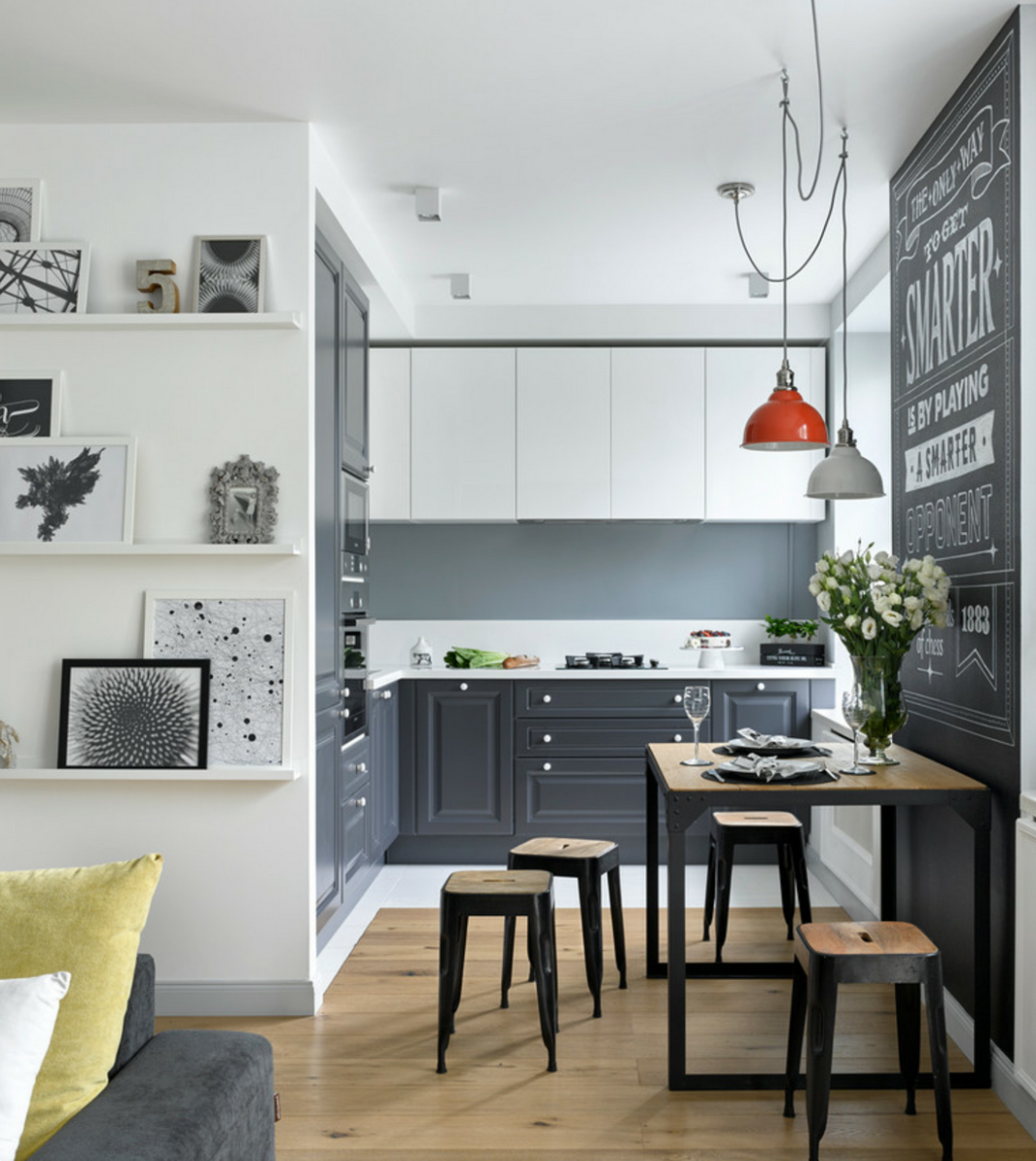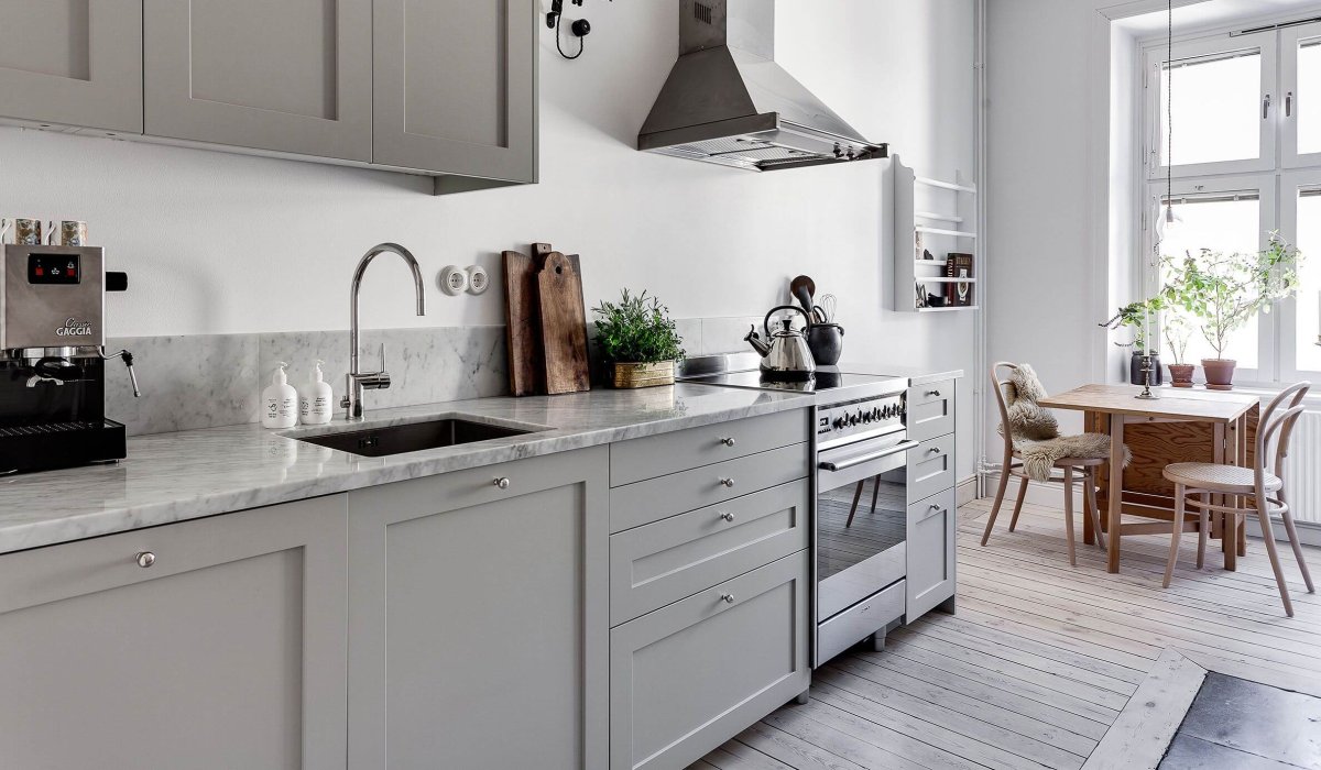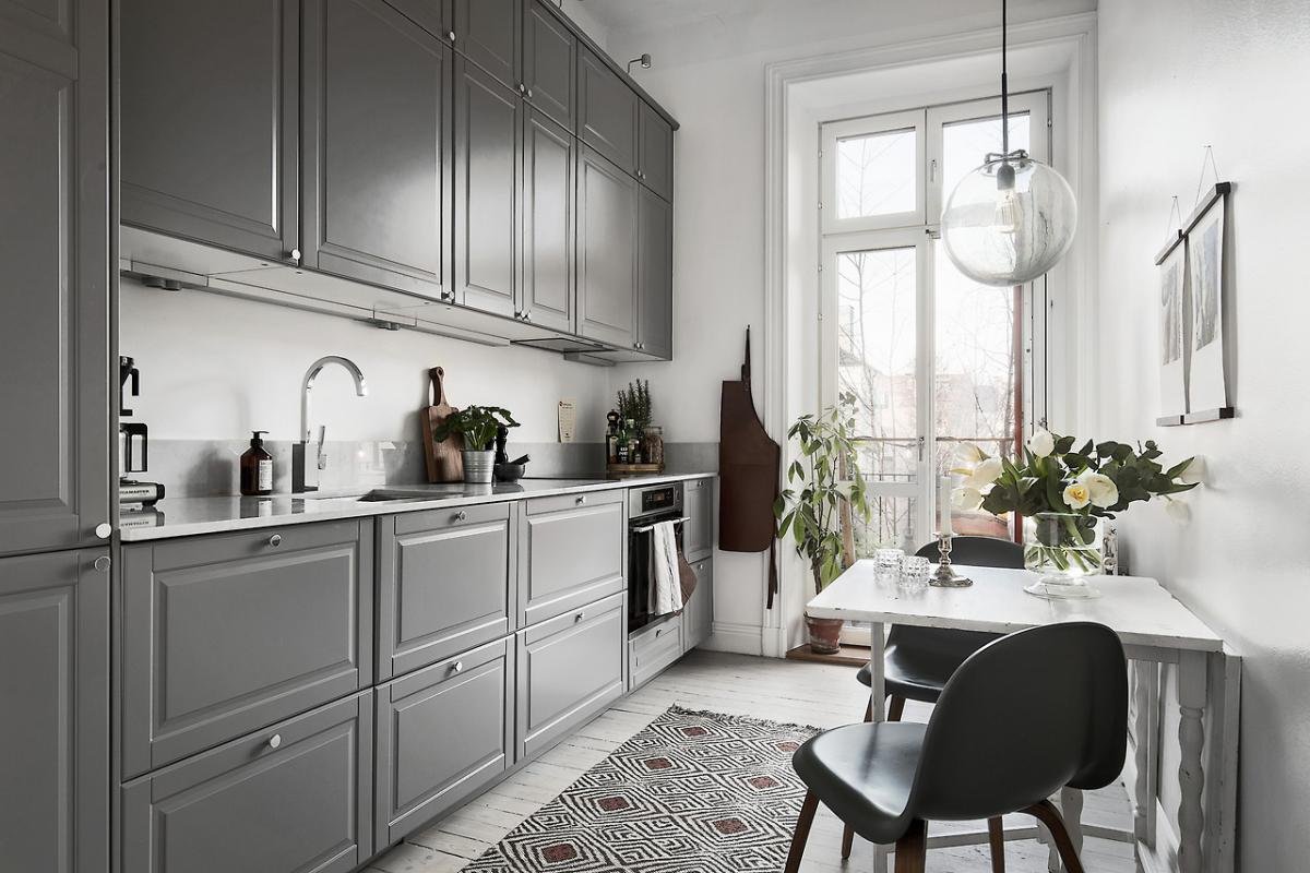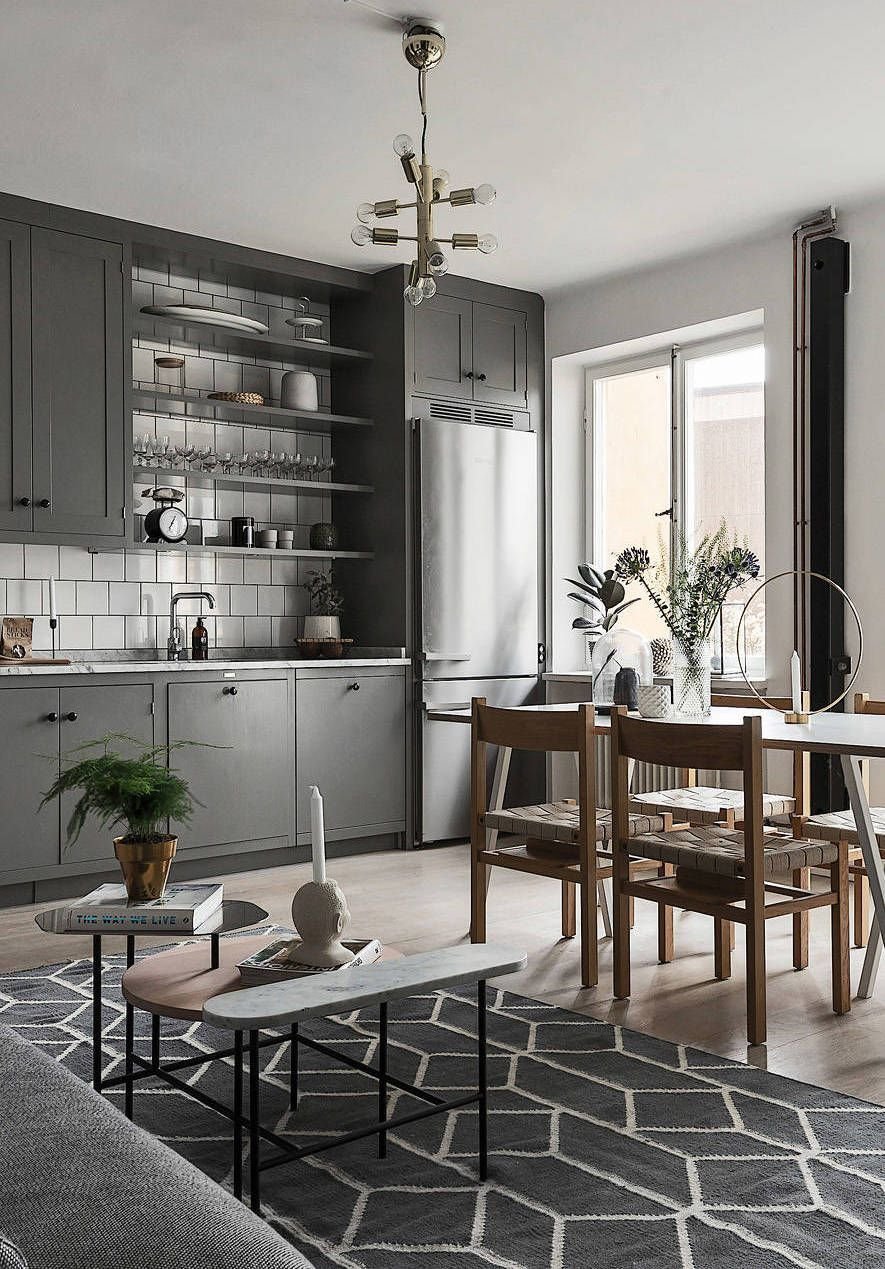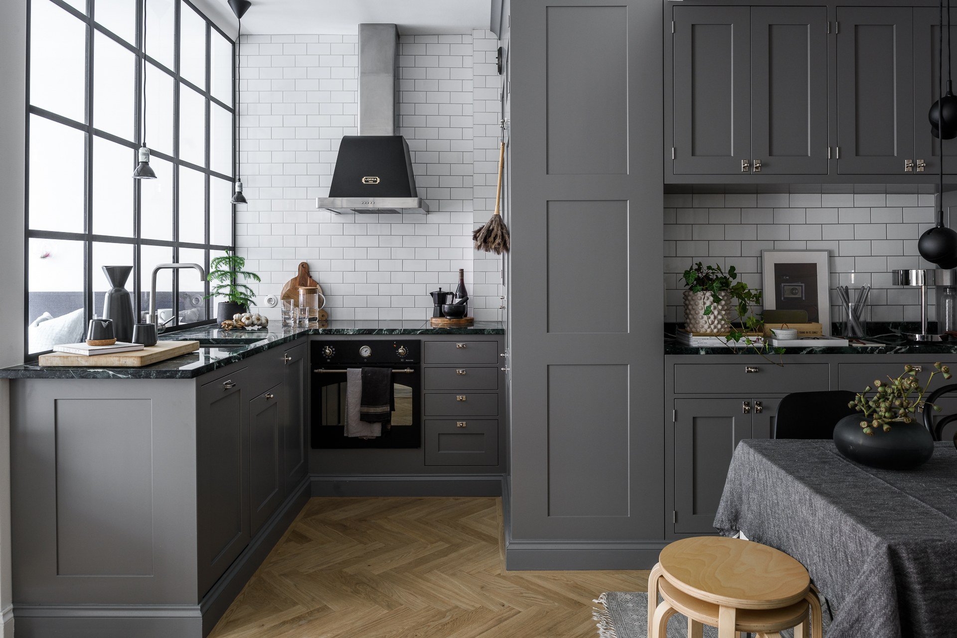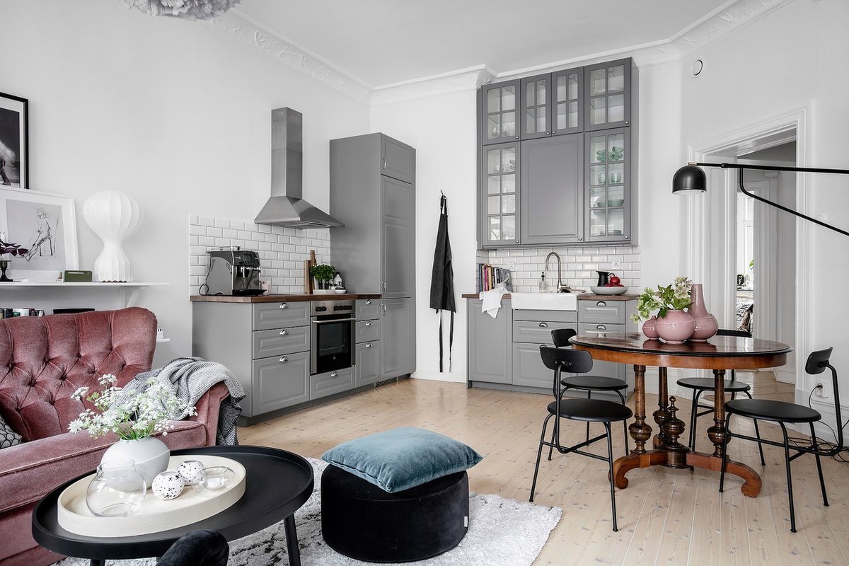 Скандинавский стиль на кухне серые стены и голубая плитка кабанчиком