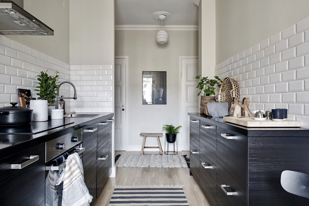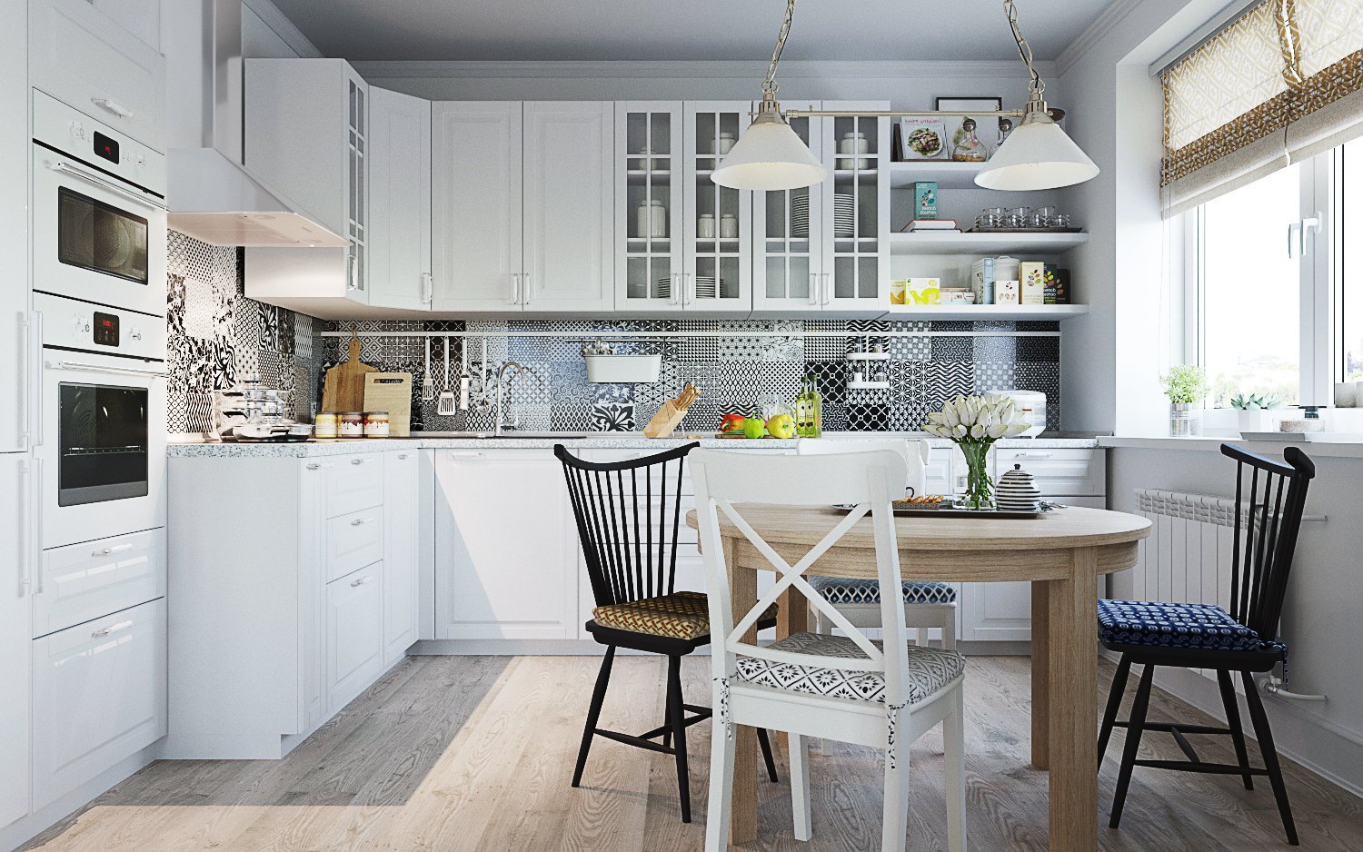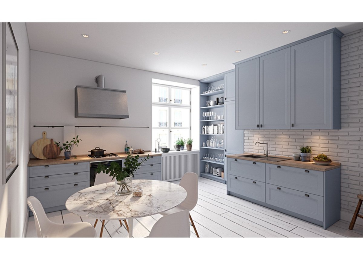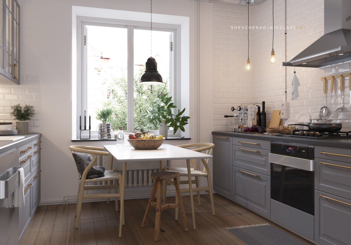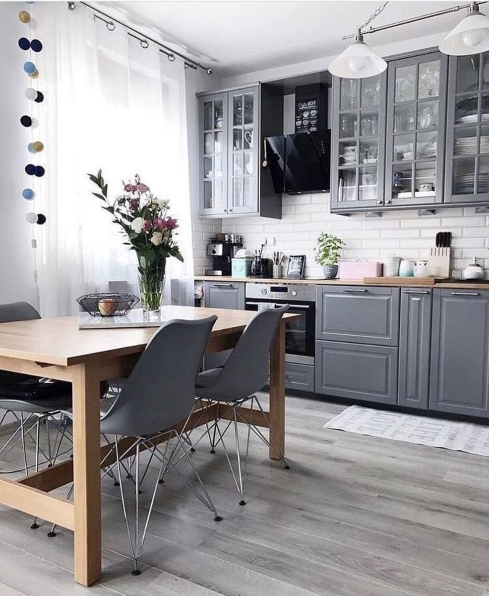 Скандинавский стиль на кухне серые стены и голубая плитка кабанчиком