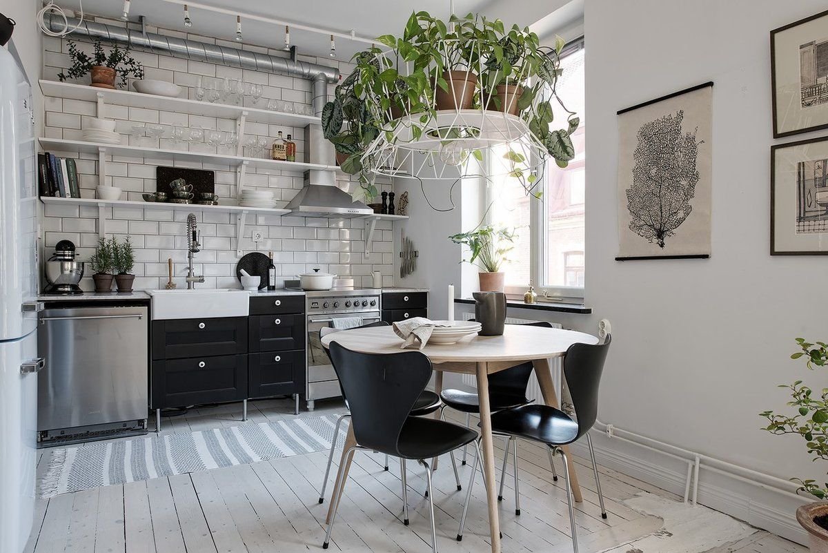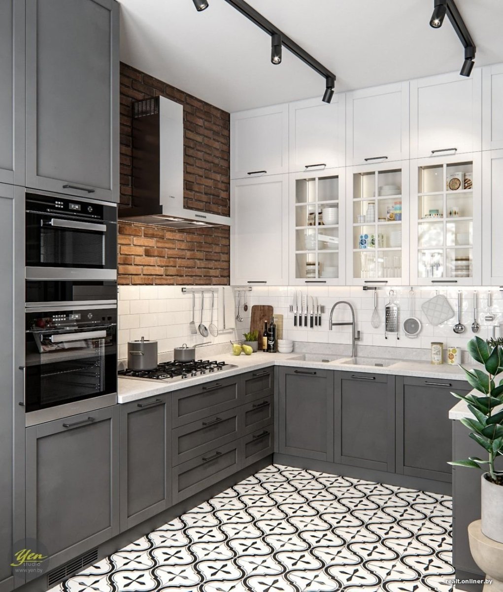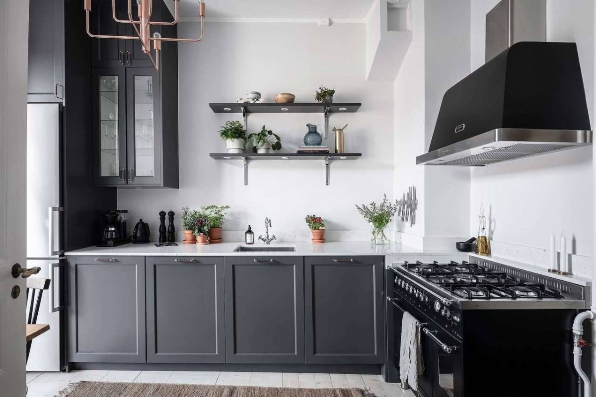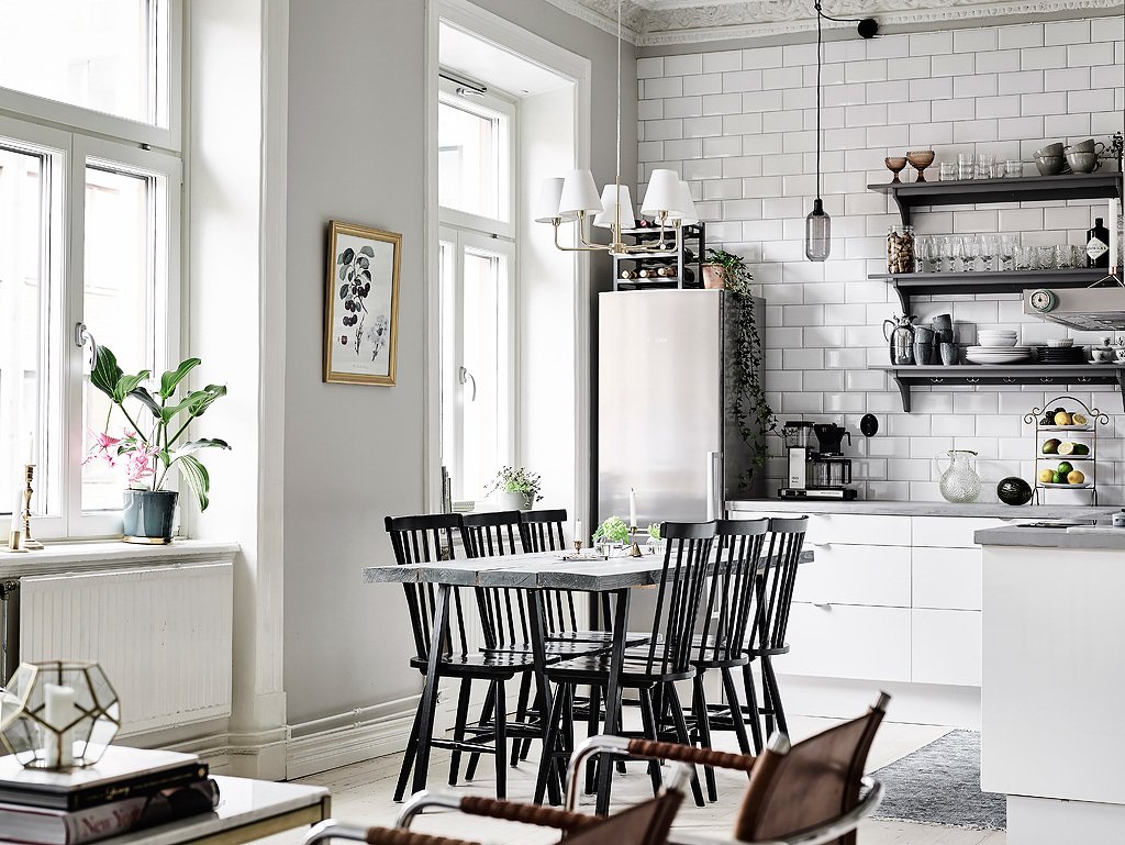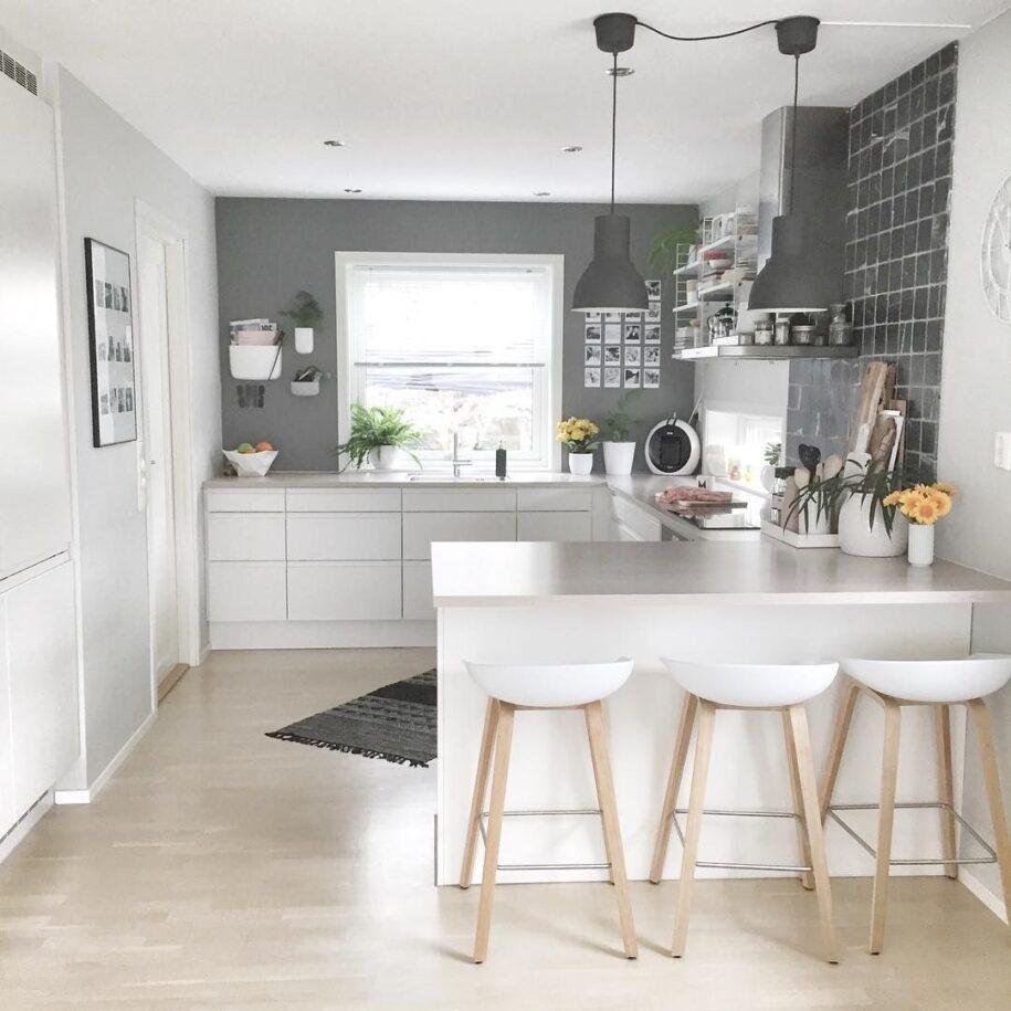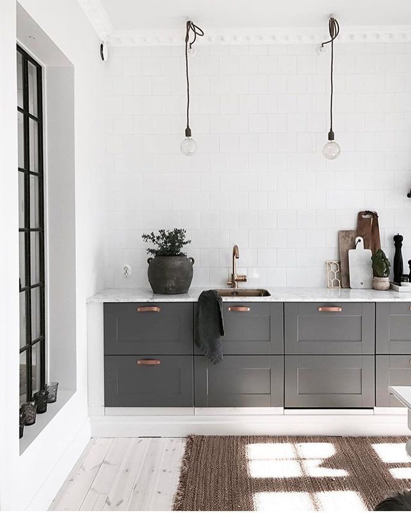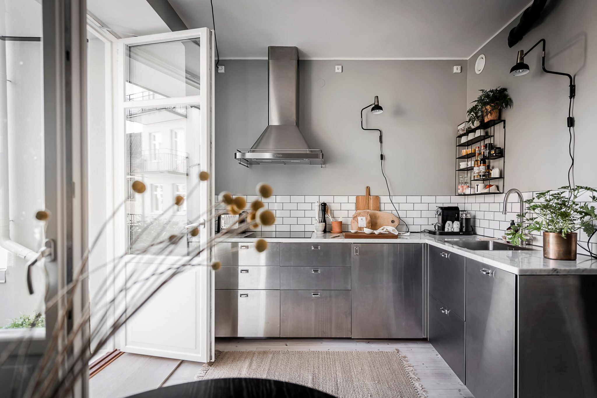 Скандинавский стиль на кухне серые стены и голубая плитка кабанчиком