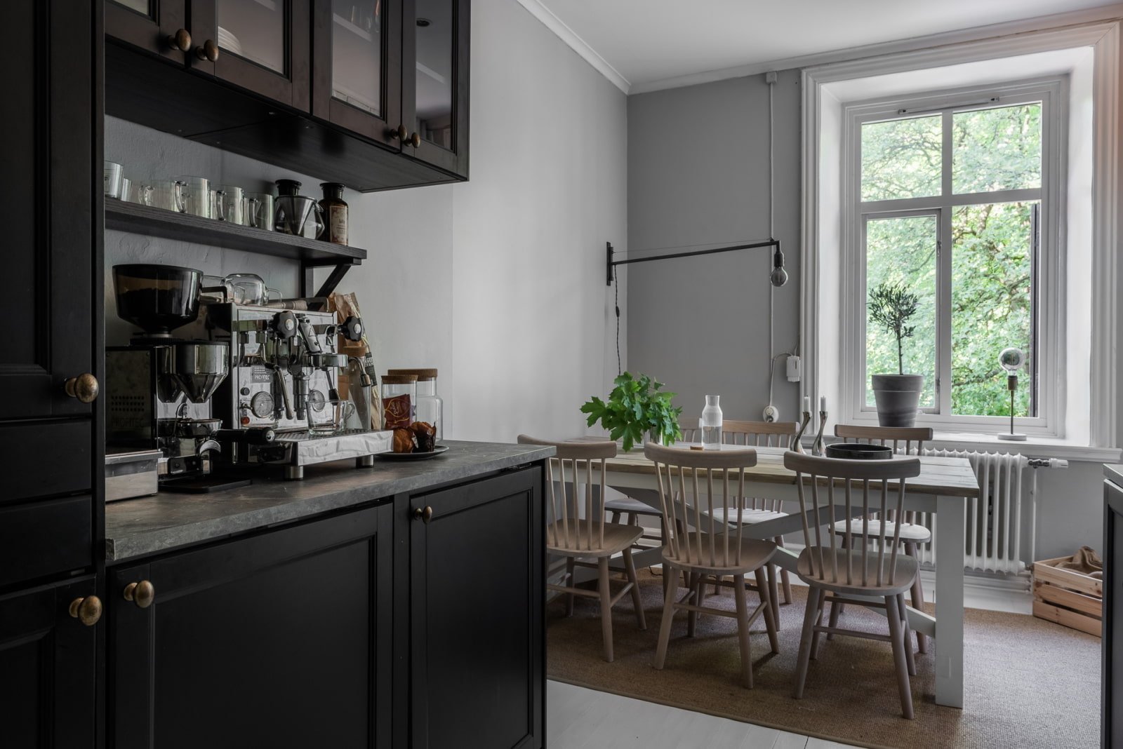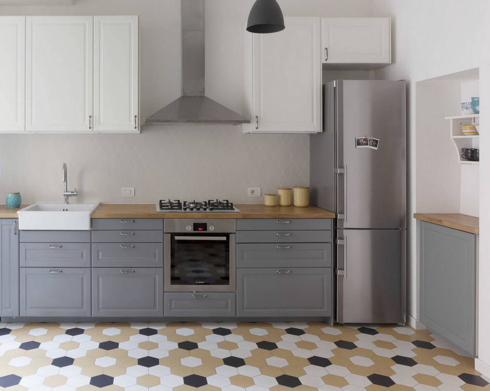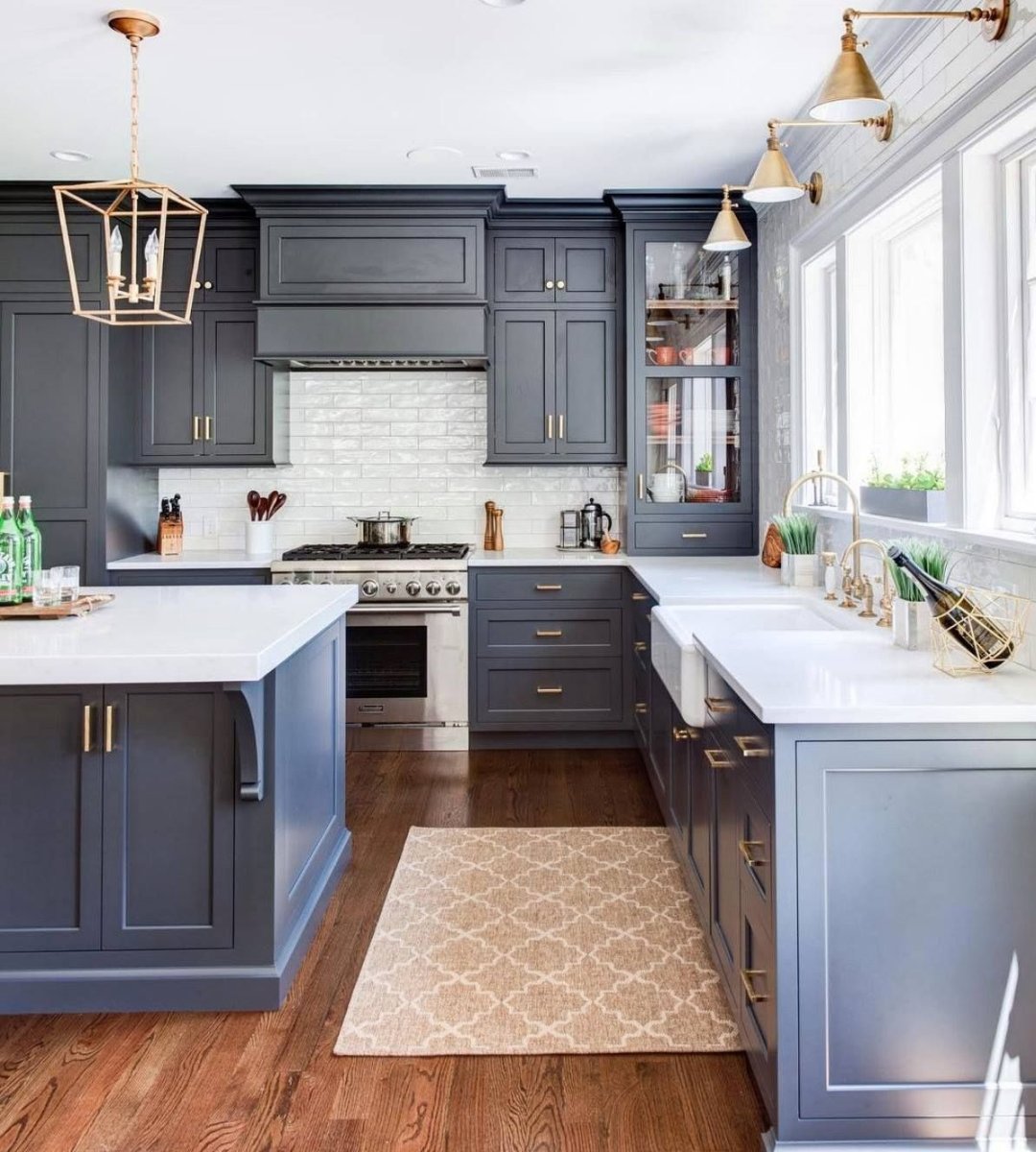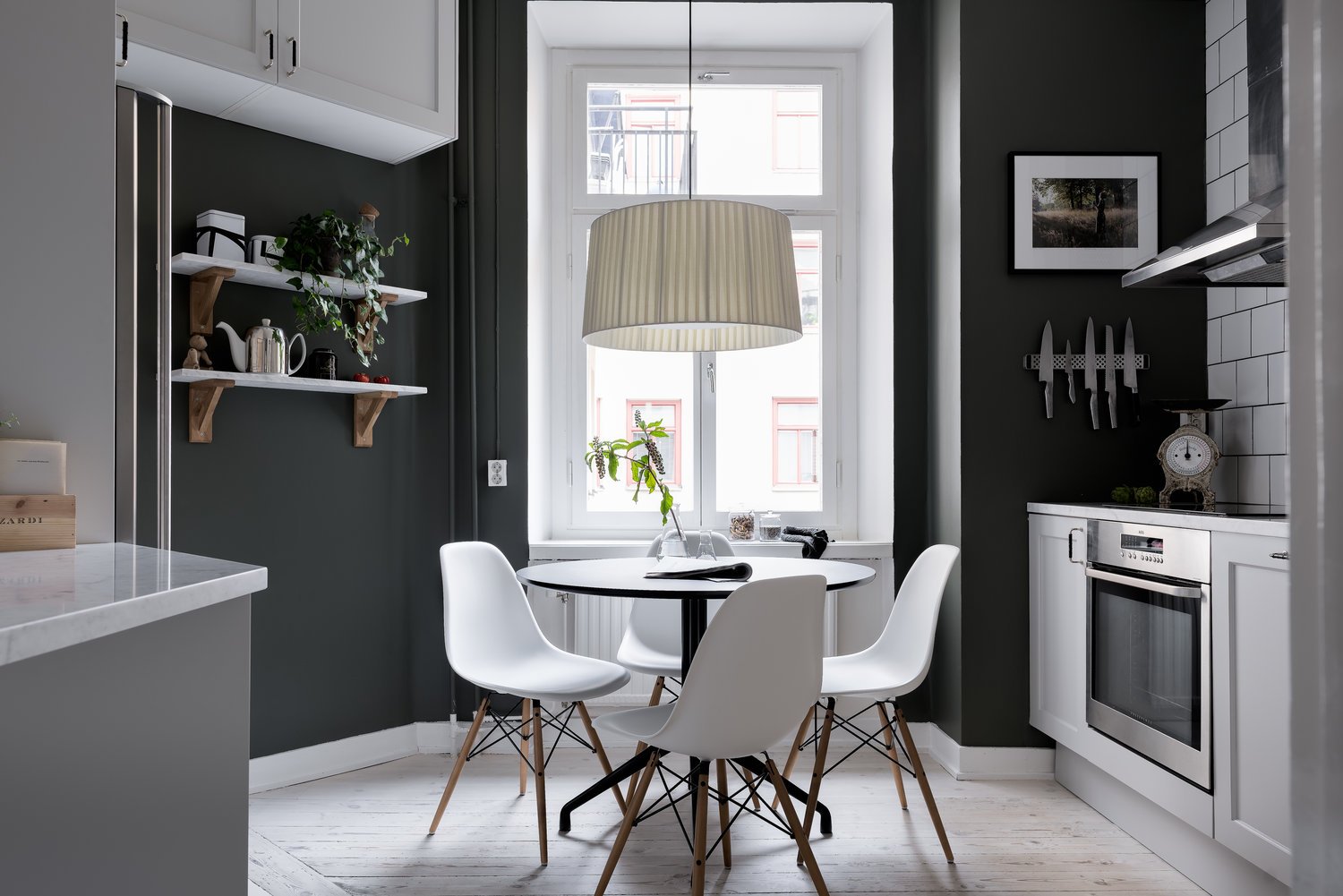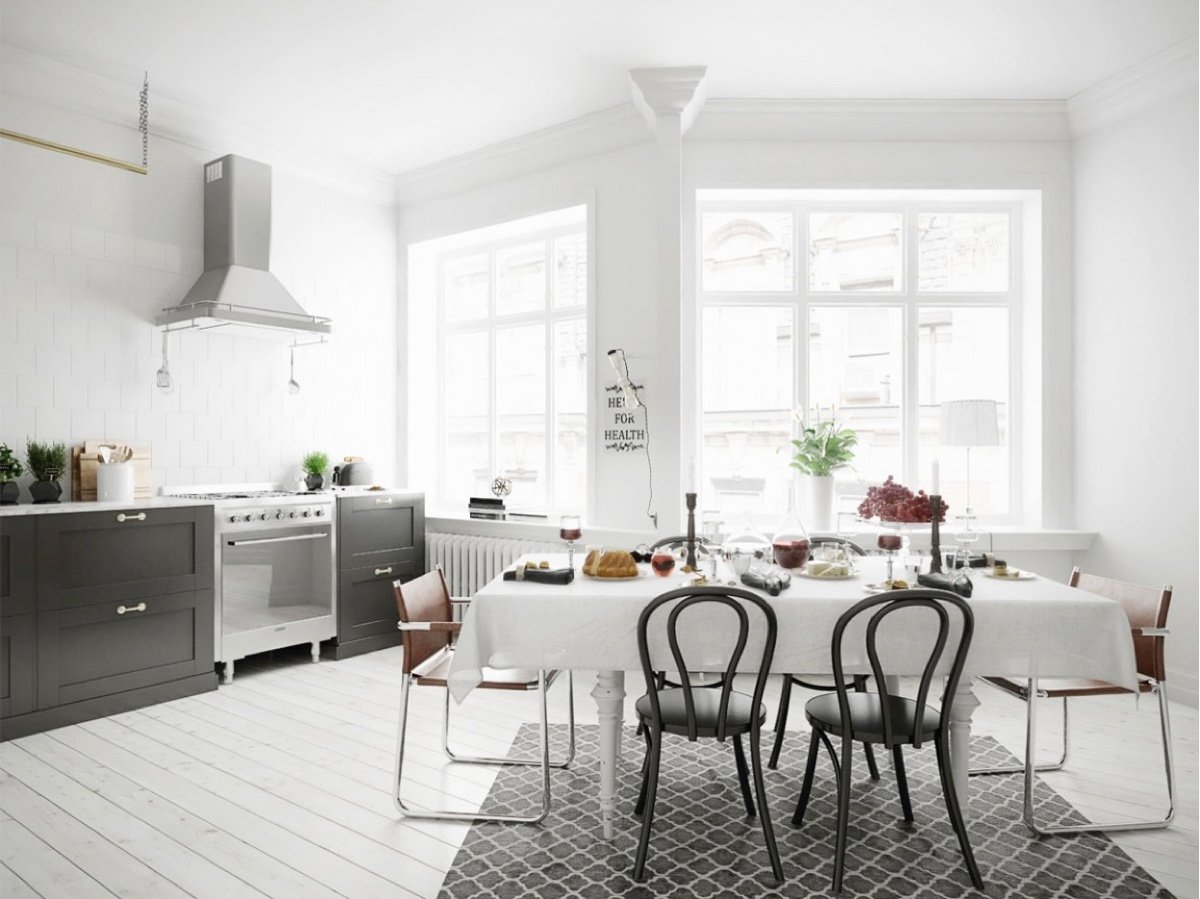 Скандинавский стиль на кухне серые стены и голубая плитка кабанчиком