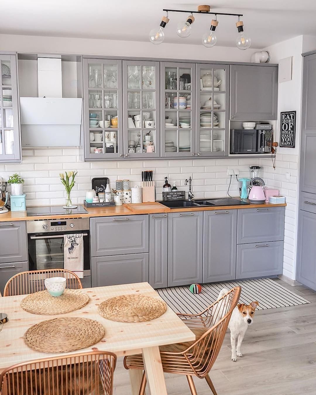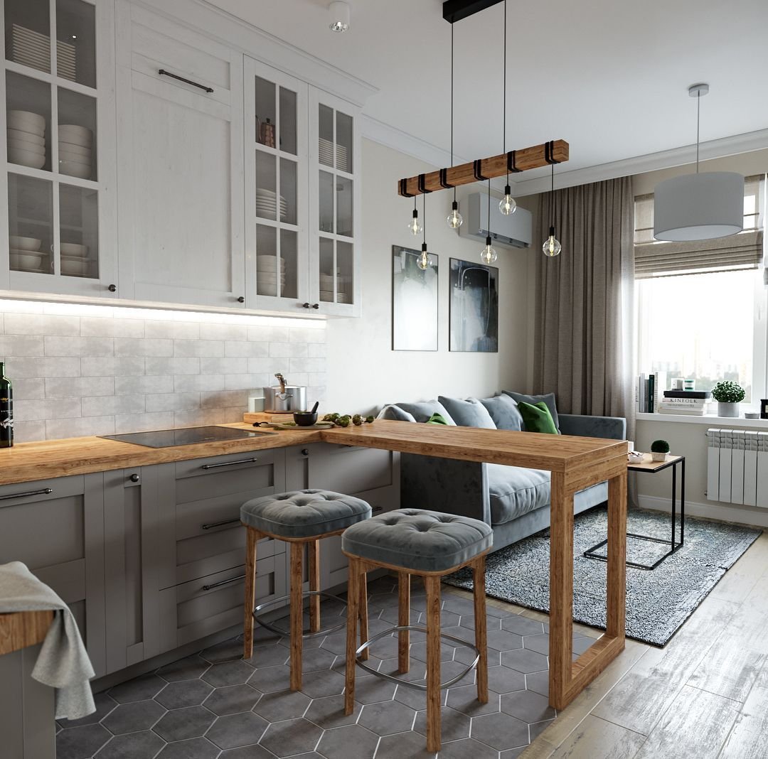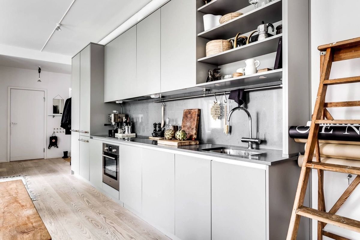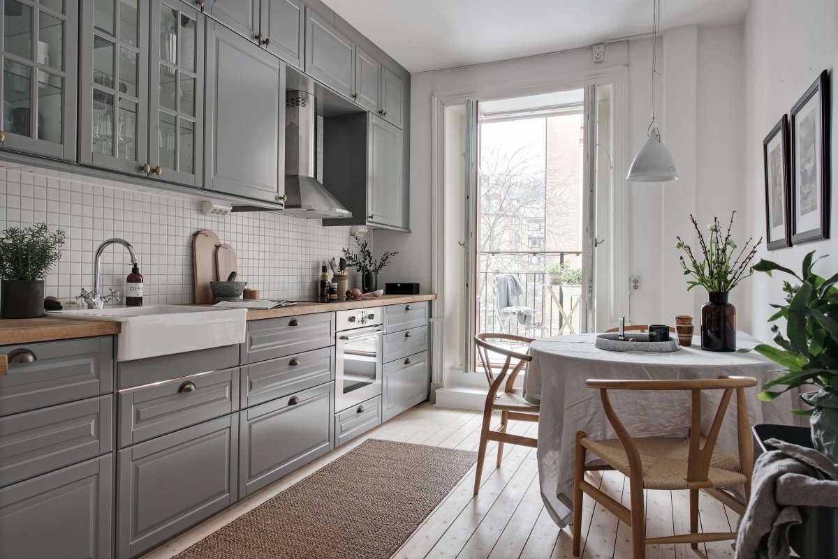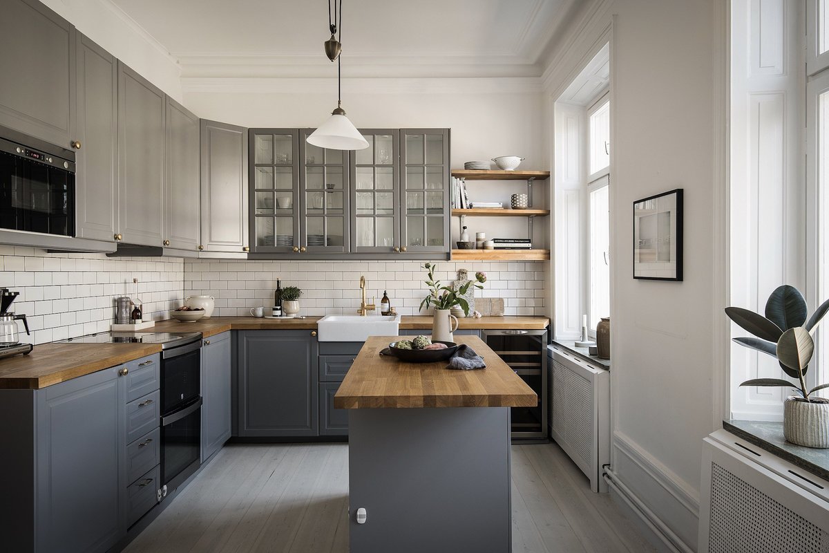 Кухня в скандинавском стиле с деревянной столешницей белая и серая