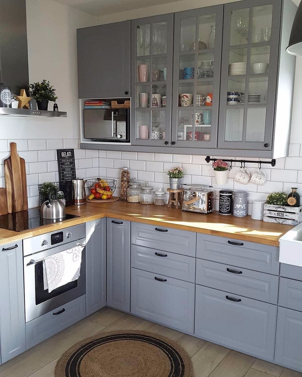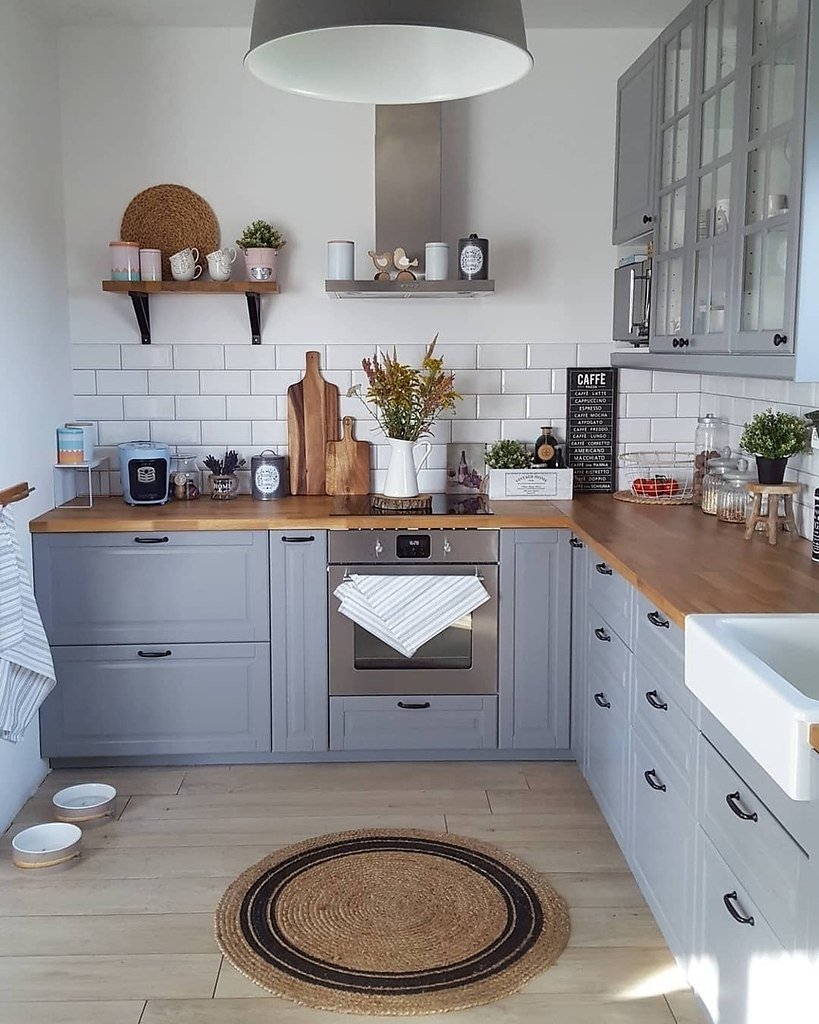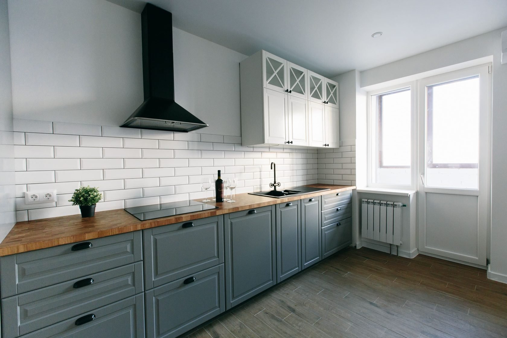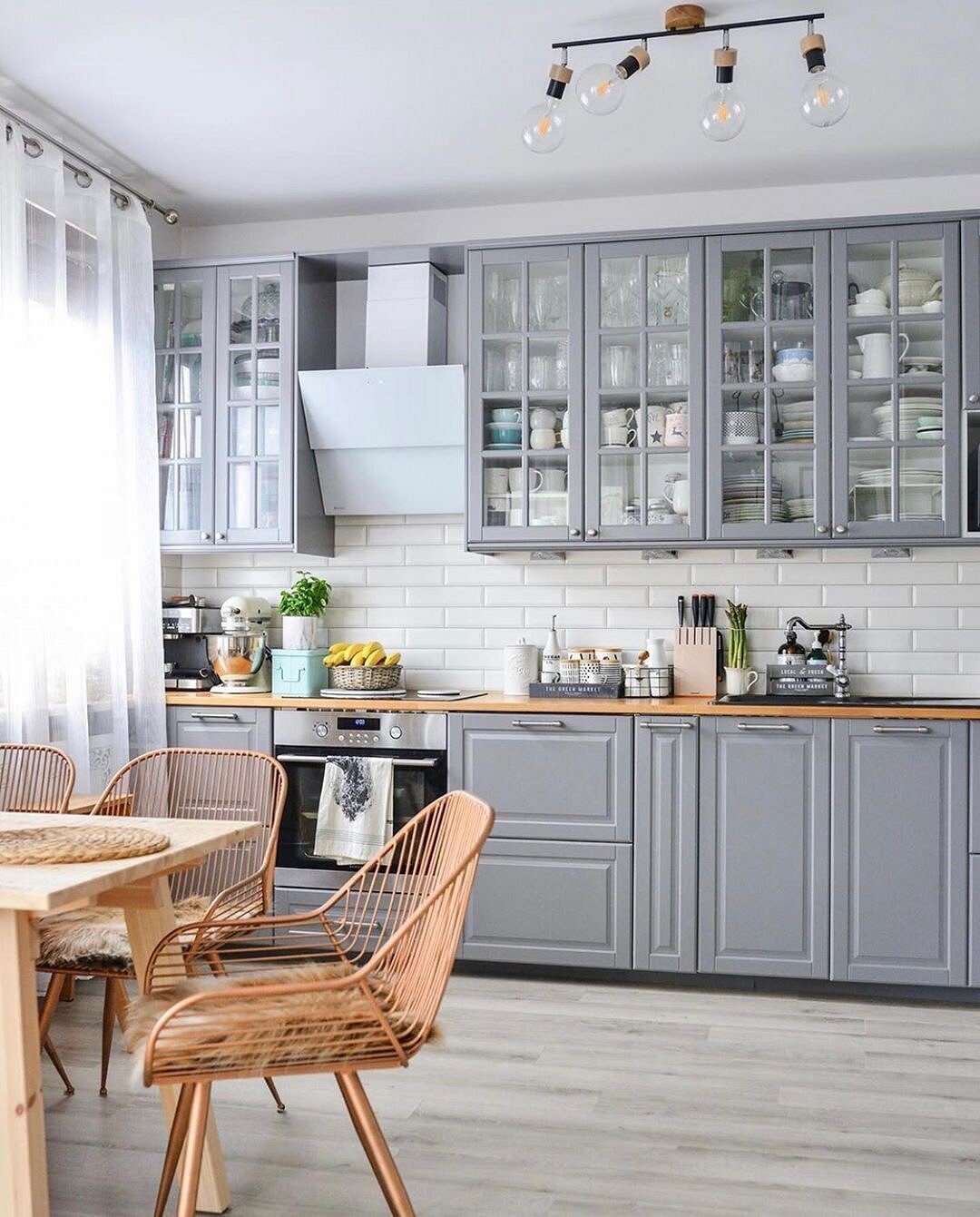 Кухня в скандинавском стиле с деревянной столешницей белая и серая