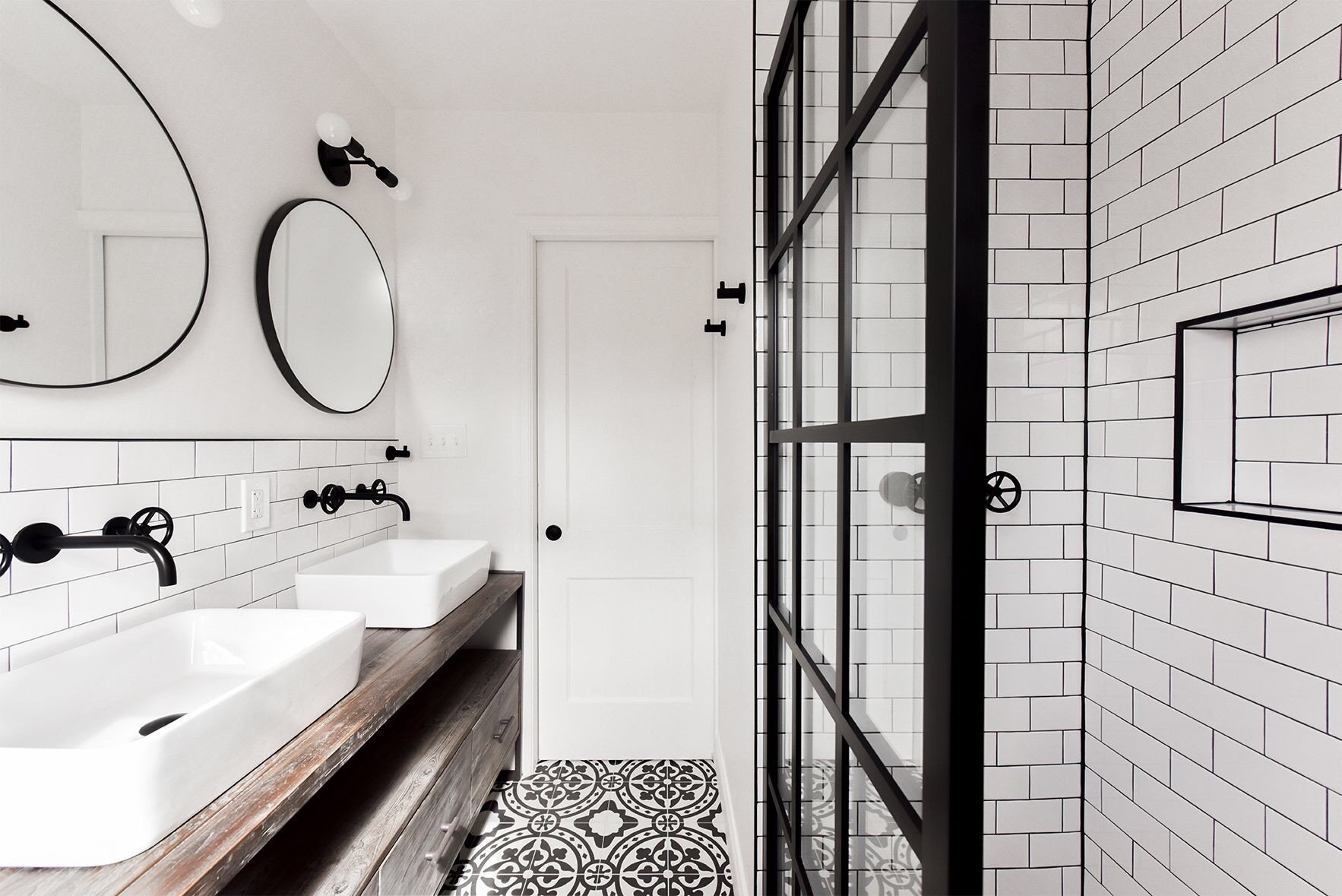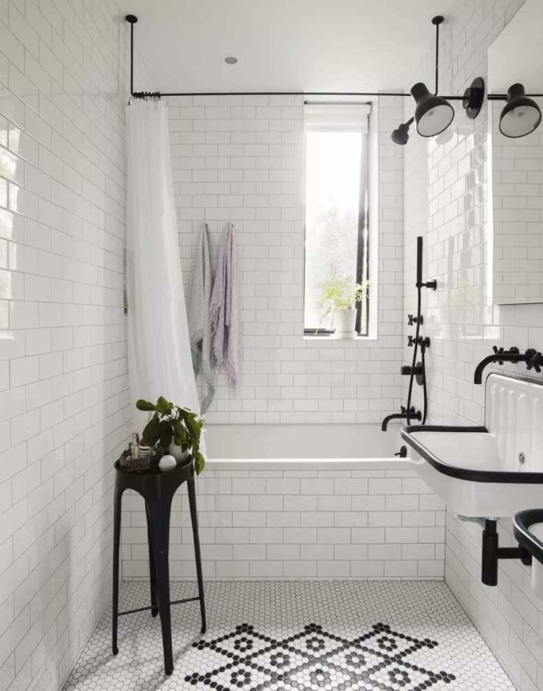 Белая ванная с черными аксессуарами