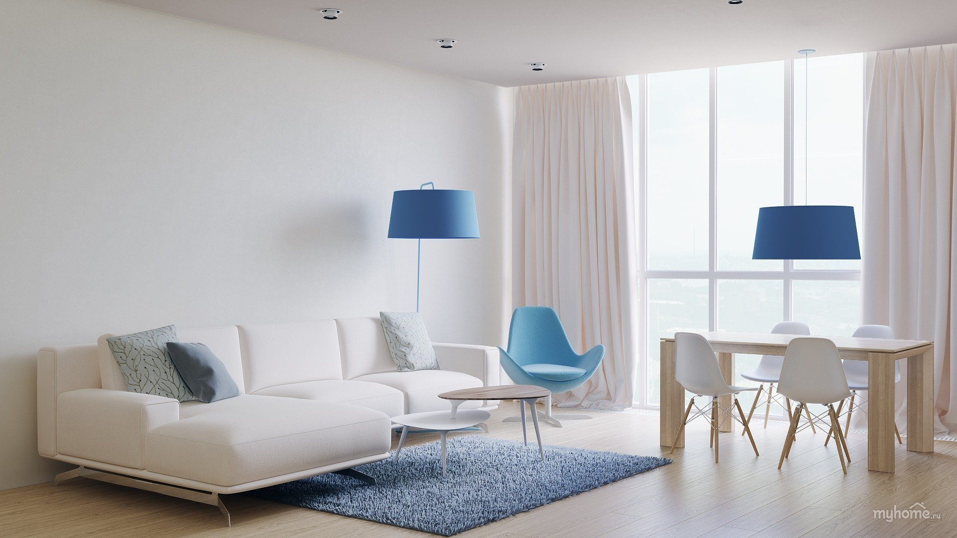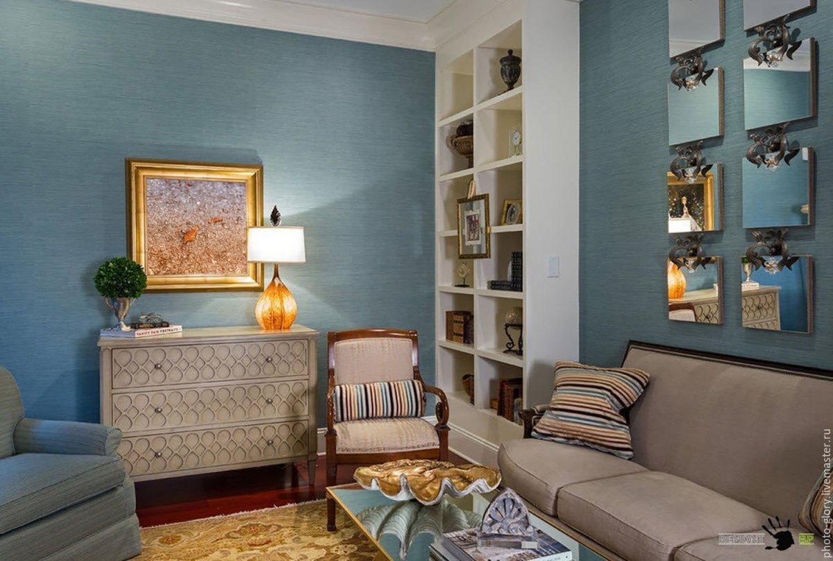 Бежевые стены голубые шторы