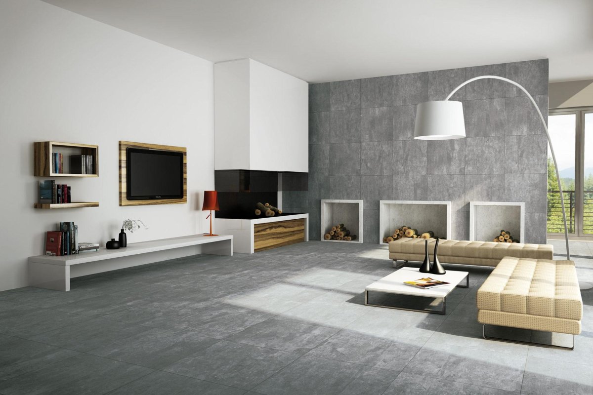 Серый керамогранит в интерьере гостиной