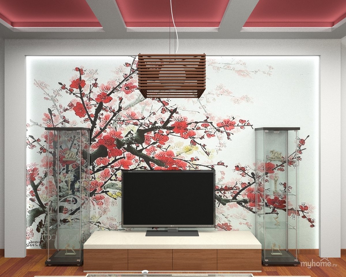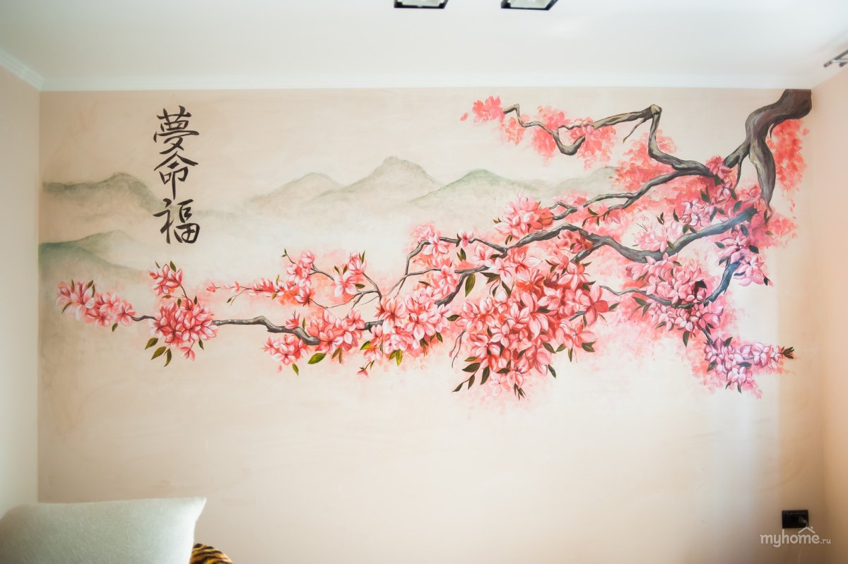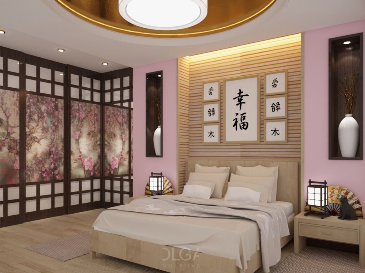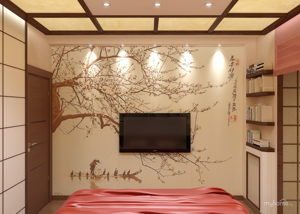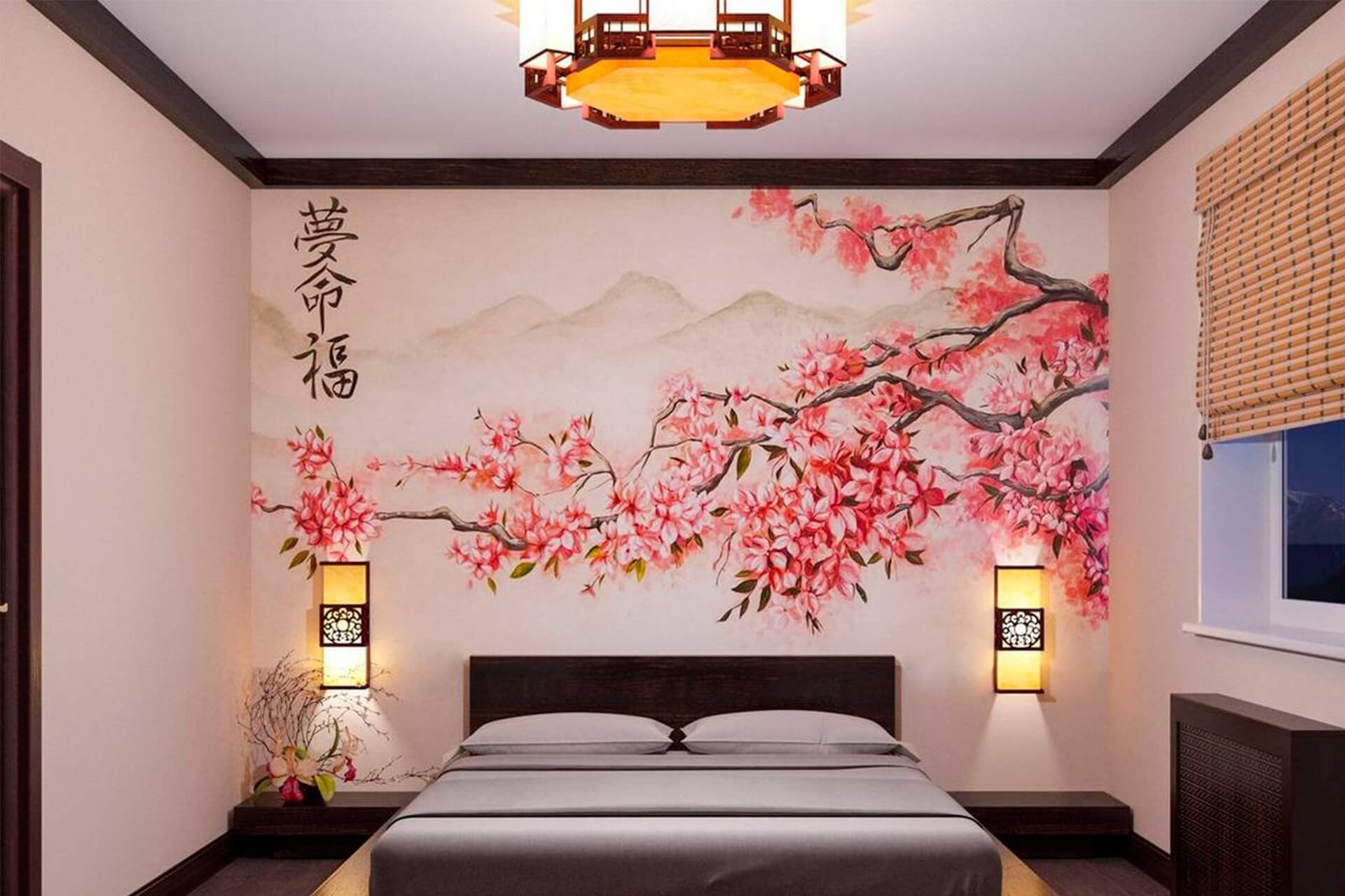 Обои Сакура в интерьере спальни в японском Восточном стиле