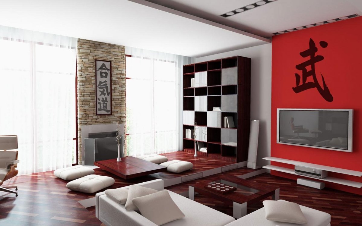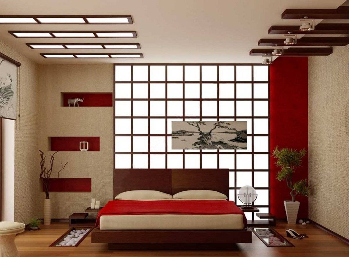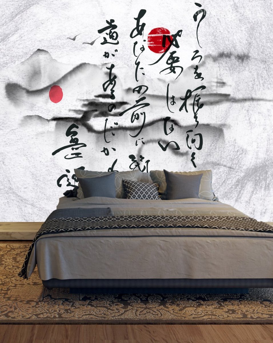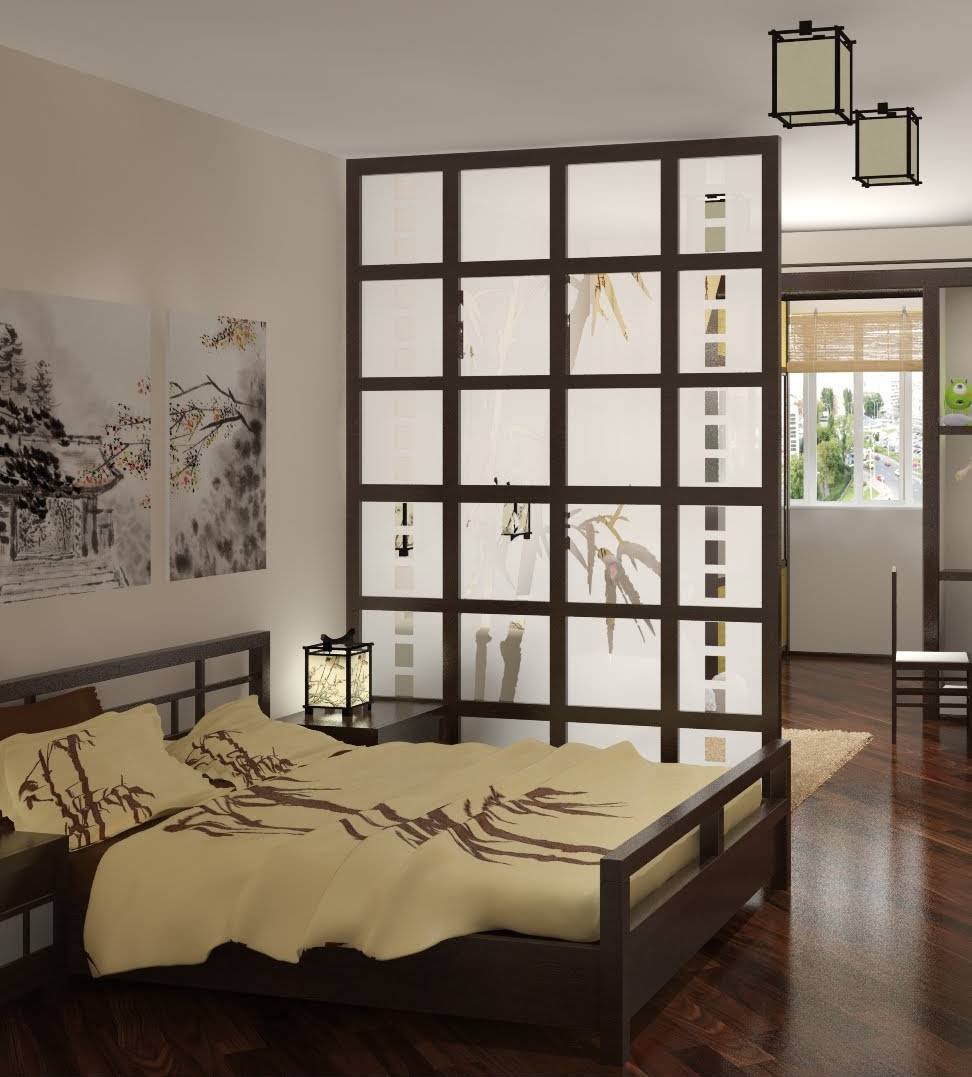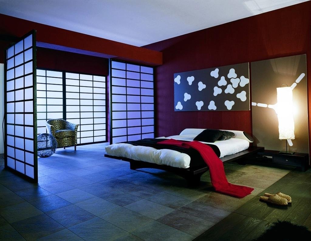 Обои Сакура в интерьере спальни в японском Восточном стиле