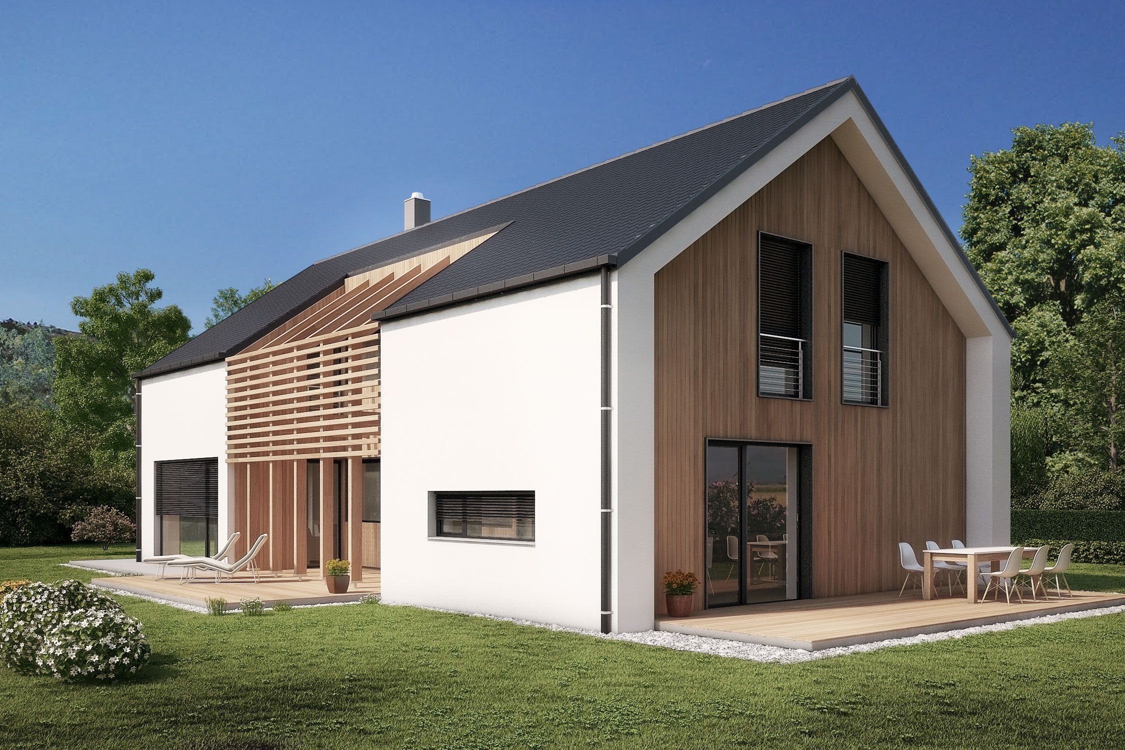 Дом с двускатной крышей в современном стиле